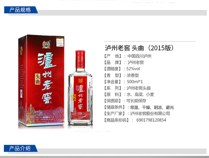 【泸州老窖酒名堂】头曲酒(2015版)52度500ml*6