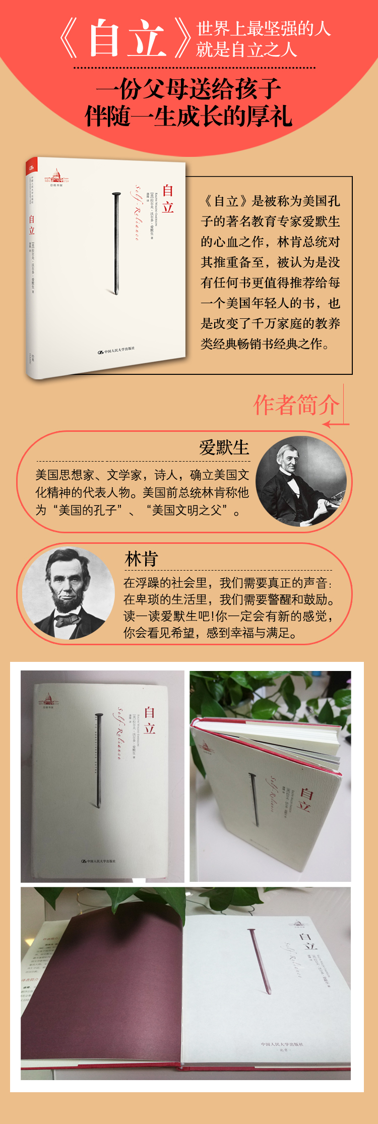 美国历*伟大的诗人惠特曼说:“我的思想犹如嗞嗞作响的热水,而爱默生终于使它们沸腾。”翻开《自立》,跟随爱默生的笔尖,思维徜徉在深沉的文字里,认识自己,认识天性,认识无限的本能和直觉,发现美德与生命的本质。