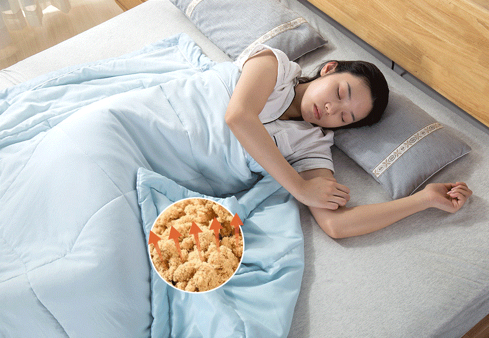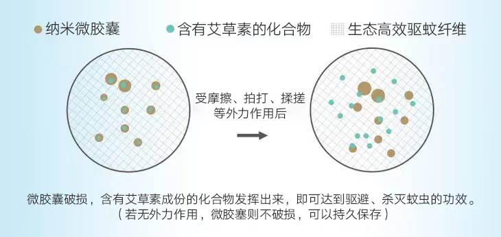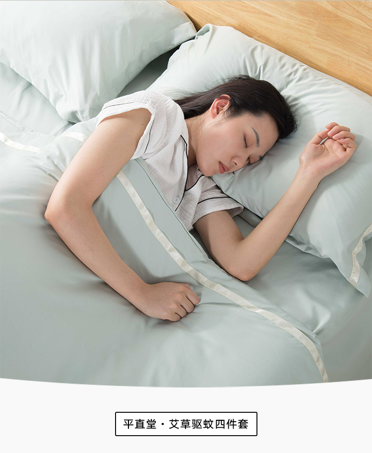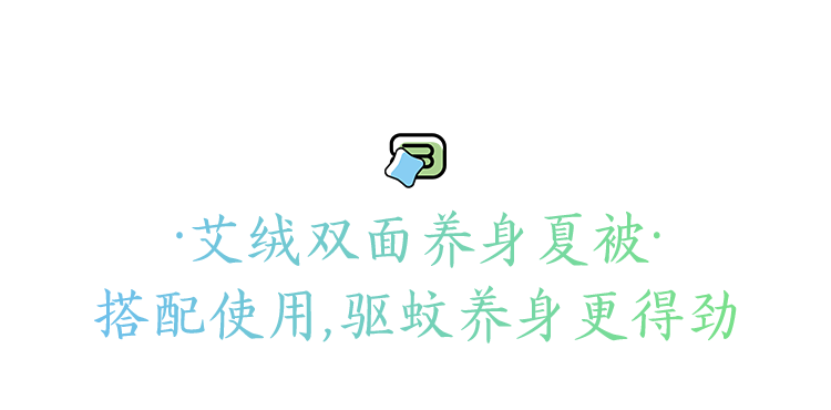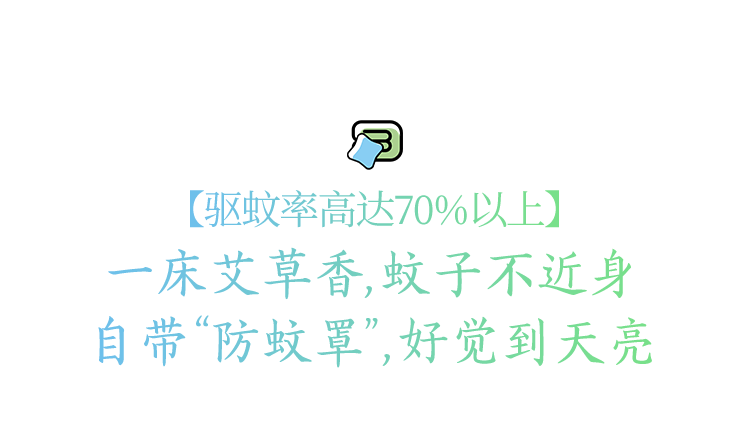 不管躺在床上、盖着被子,还是枕靠枕头,肌肤摩擦面料,艾草精华就会释放出来,形成“防蚊罩”,令蚊虫不敢靠近。
