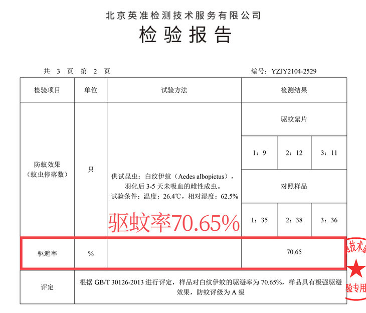 经过专业机构测试,驱蚊率高达70.65%,防蚊级别为A级!!