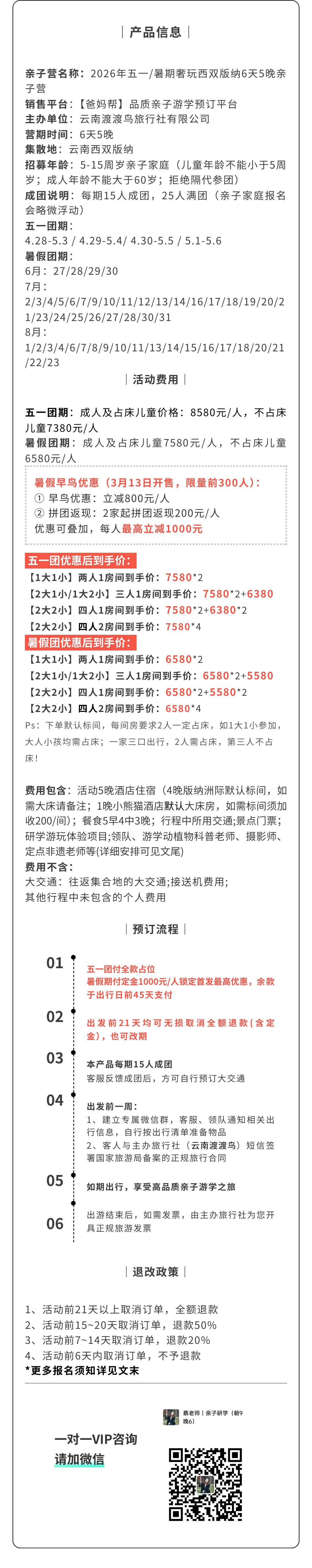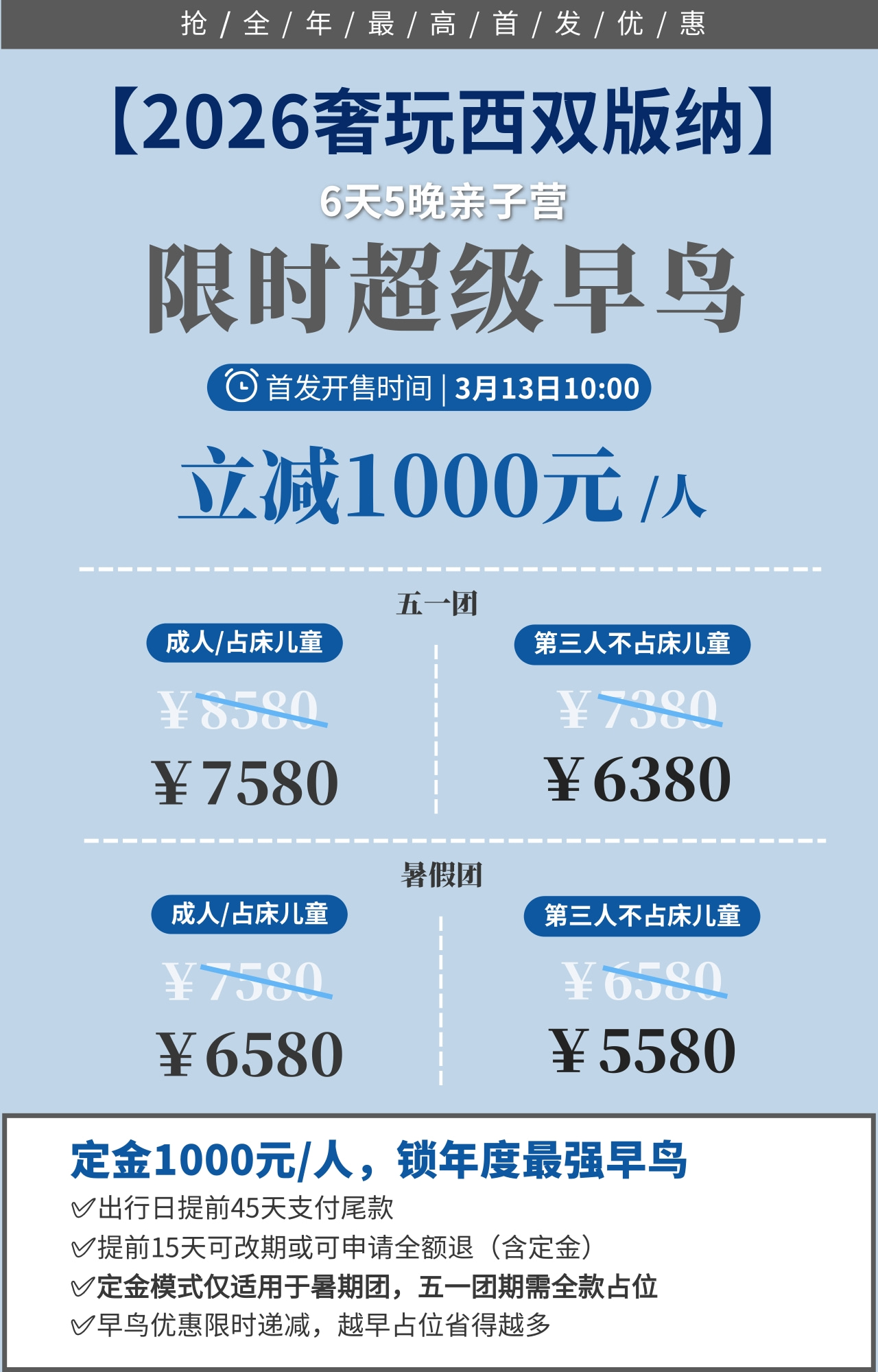 首发立减1000!限前300人!五一/暑假奢玩西双版纳6天5晚亲子营,4晚洲际+1晚小熊猫庄园,动植物导师+傣寨非遗传人+原住民向导+摄影师,执行好评率高达99%!过「高奢」版向往生活!
