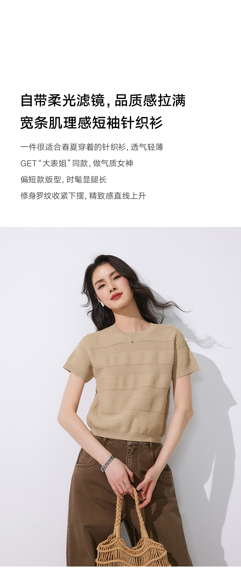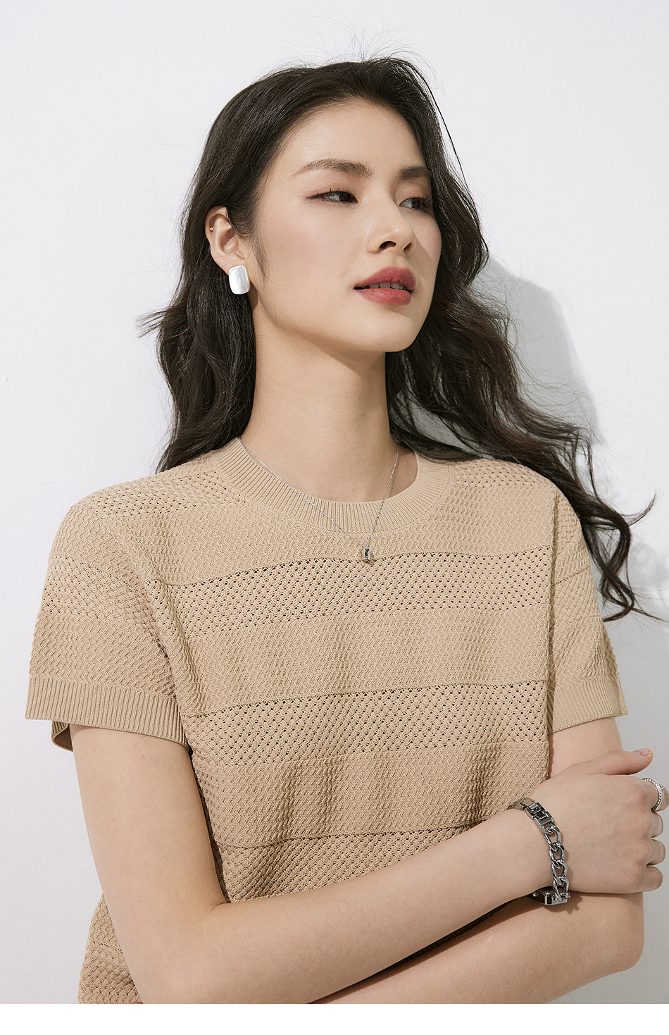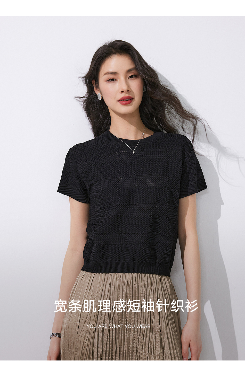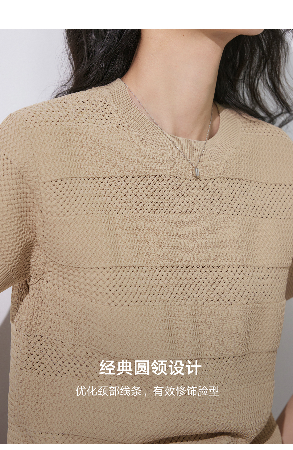 棉仓353635013-曲珠凉感短袖针织衫女宽条肌理 24夏季镂空设计气质圆领小衫