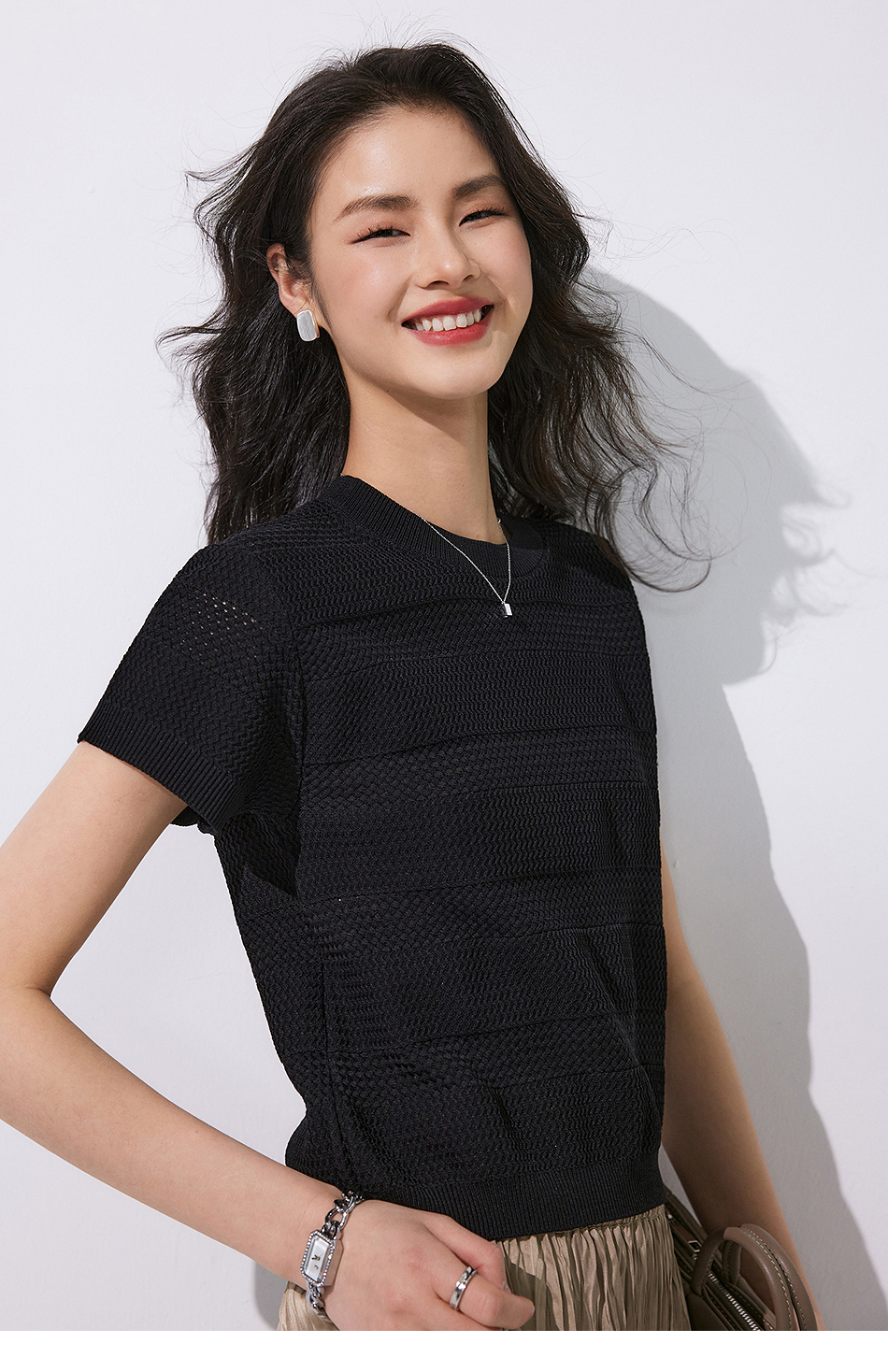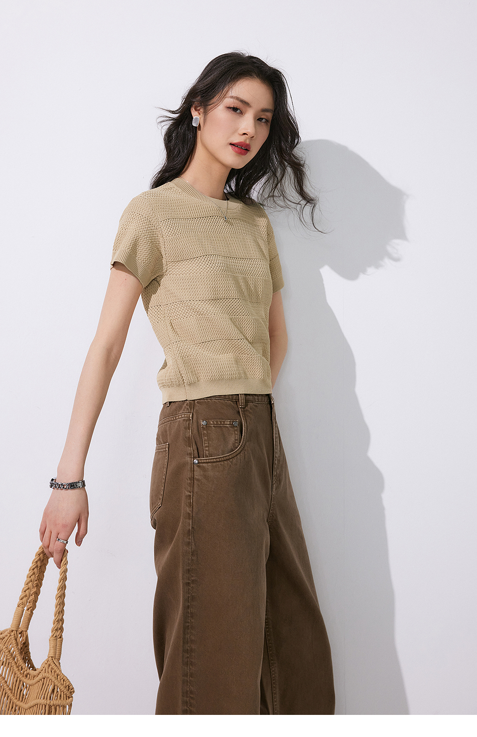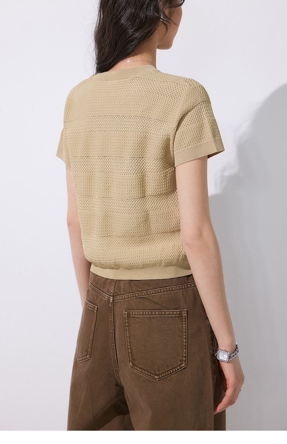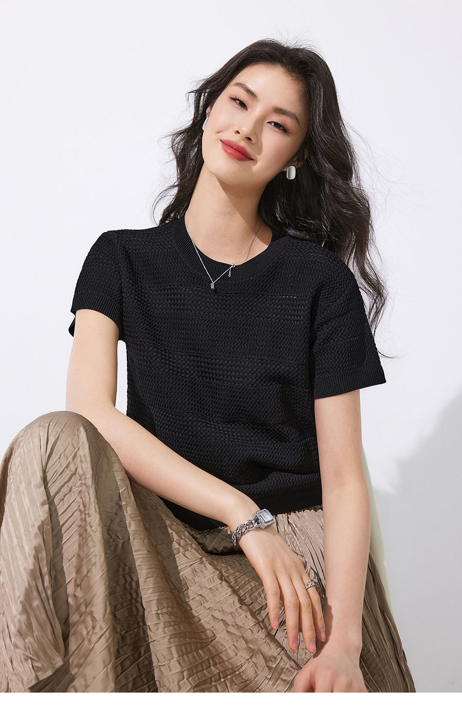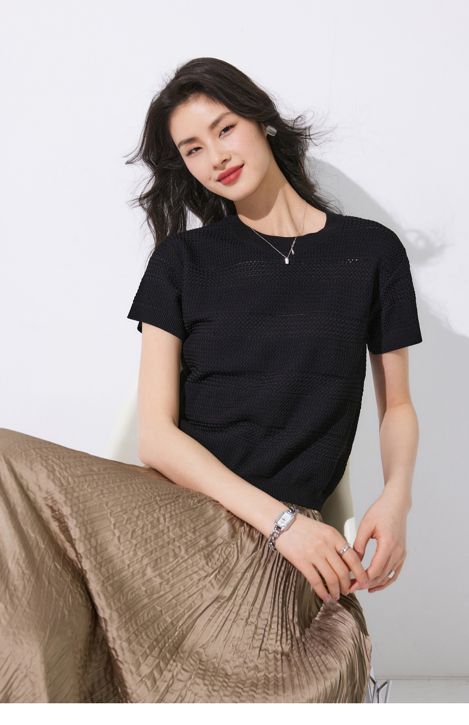 棉仓353635013-曲珠凉感短袖针织衫女宽条肌理 24夏季镂空设计气质圆领小衫