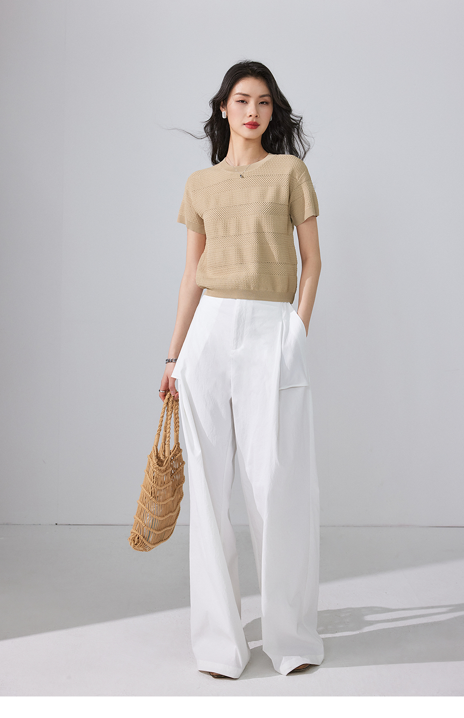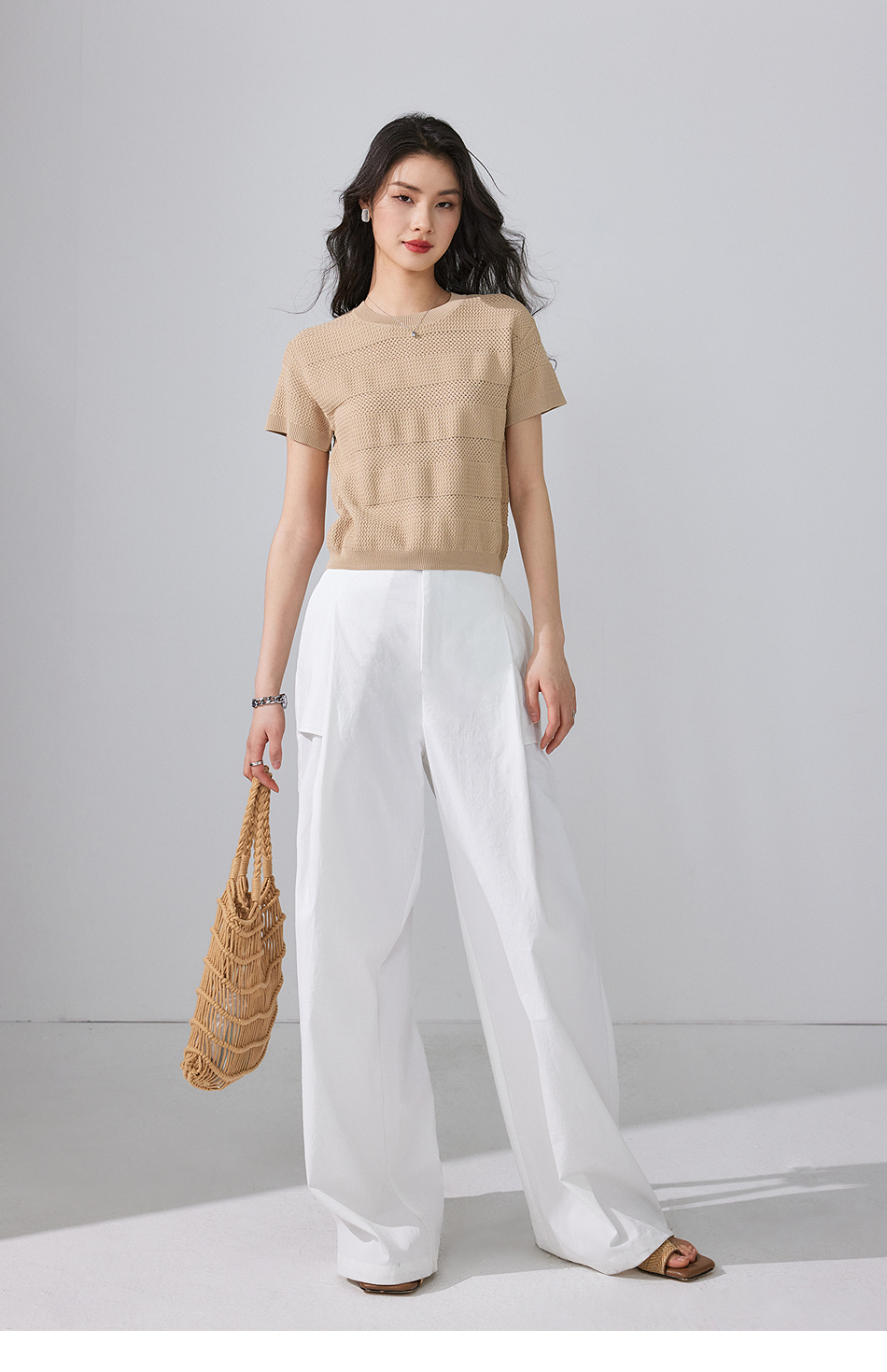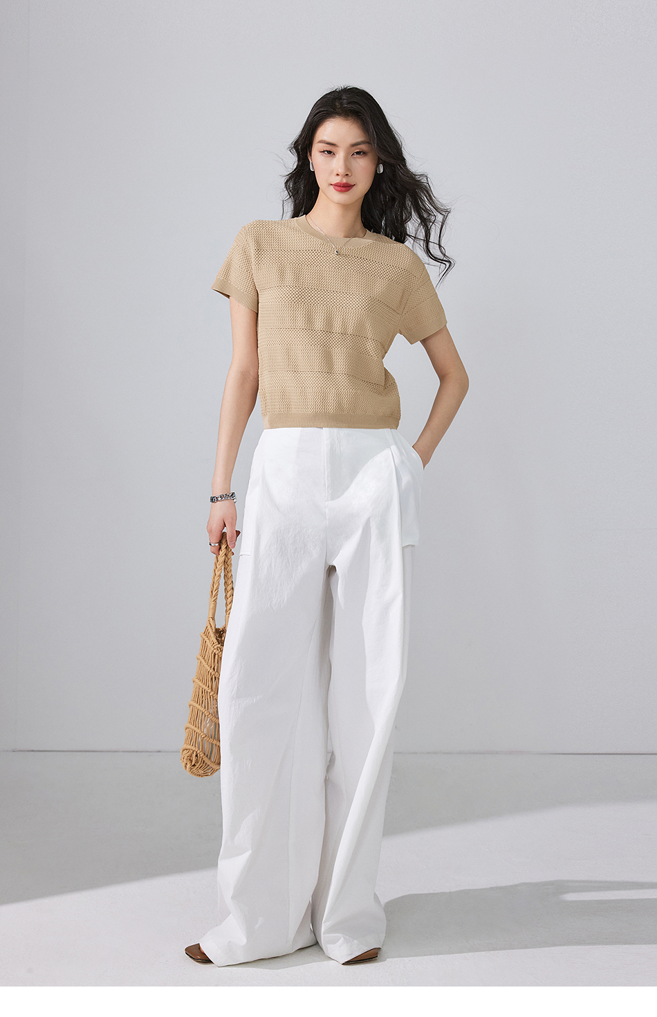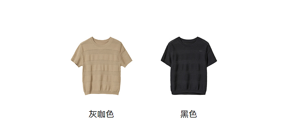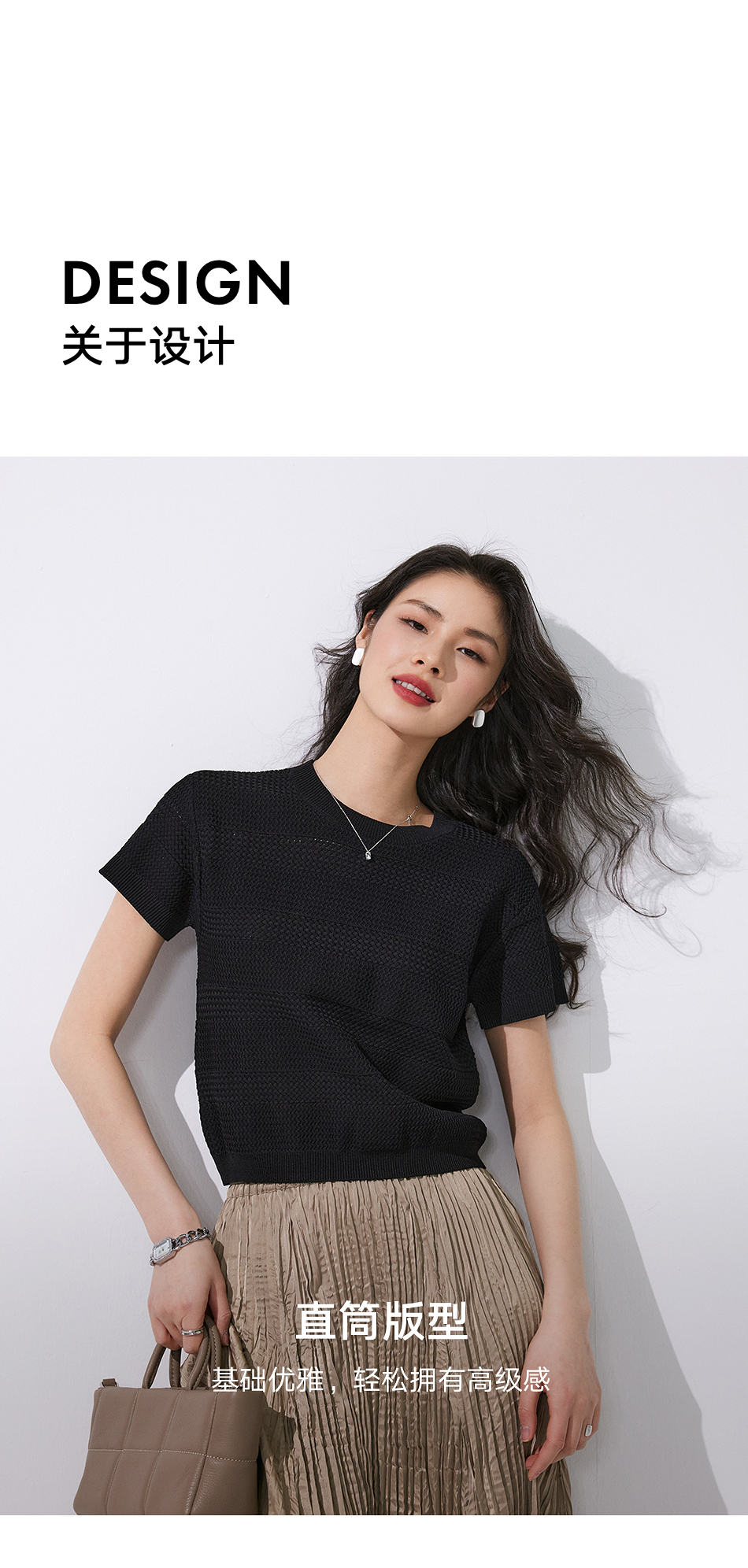 棉仓353635013-曲珠凉感短袖针织衫女宽条肌理 24夏季镂空设计气质圆领小衫