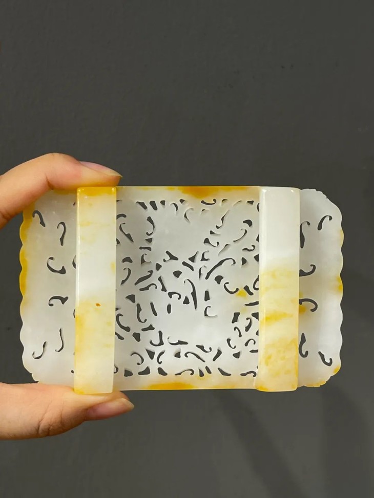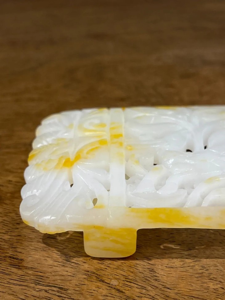 这是一件以质地佳的和田金沁籽料白玉镂雕透雕成吉祥蝙蝠鹿纹的长方形腰带扣环,玉石质地堅硬、黄金沁白玉色泽柔美,全器玉质洁白纯净带黄金沁斑,长方弧面镂雕回首鹿以及蝙蝠与唐草纹等吉祥图案,背面镂雕两条垂直扣环,设计精巧实用,构图典雅细腻,雕工精湛、表面处理圆融细致,镂雕与弧面琢磨雕刀法娴熟流畅,是宫廷玉雕作坊风格。