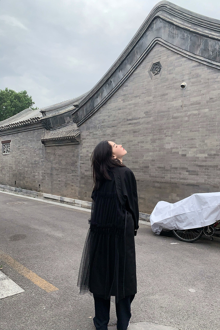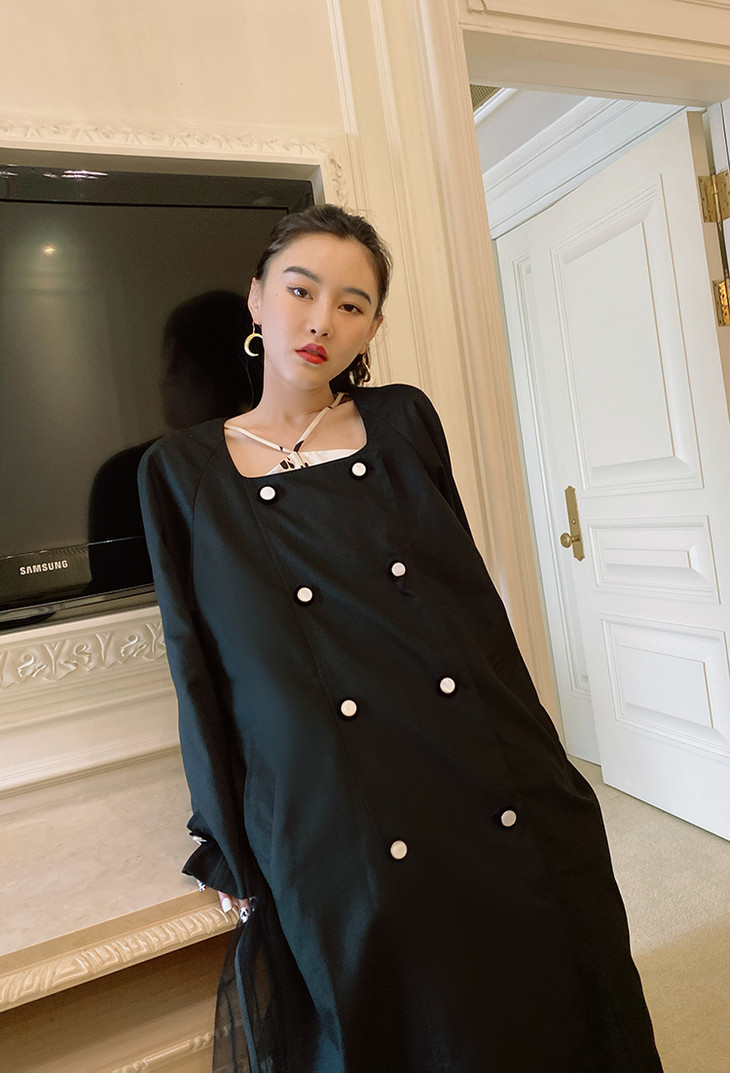 黑标系列60年代复古低胸风衣背后拼接美妙网纱