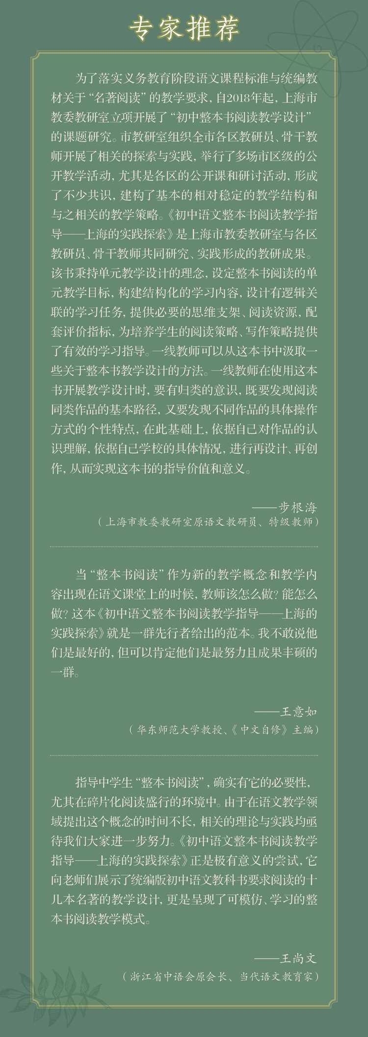 根据《义务教育语文课程标准(2011)》,初中语文课程设置;名著导读。部编本初中语文教科书六个年级十二册,每册包含一至两则;名著导读(以及作为其延伸阅读的;自主阅读推荐),引导学生对经典作品进行整本书阅读。本书密切配合部编本初中语文教科书,是对其;名著导读部分的教学指导。全书共16个教学设计,由上海市教研室曹刚老师牵头,上海各个区的初中语文教研员参与撰写。相比一般的整本书阅读指导用书,本书更具实操性,不仅有各个教学环节的详细呈现,还有许多供师生课堂使用的教学工具图表。在目前整本书阅读成为语文课堂教学的有机组成部分且大多数教师都不知道怎么教的背景下,本书可以说是一本极其有效的教学指南。