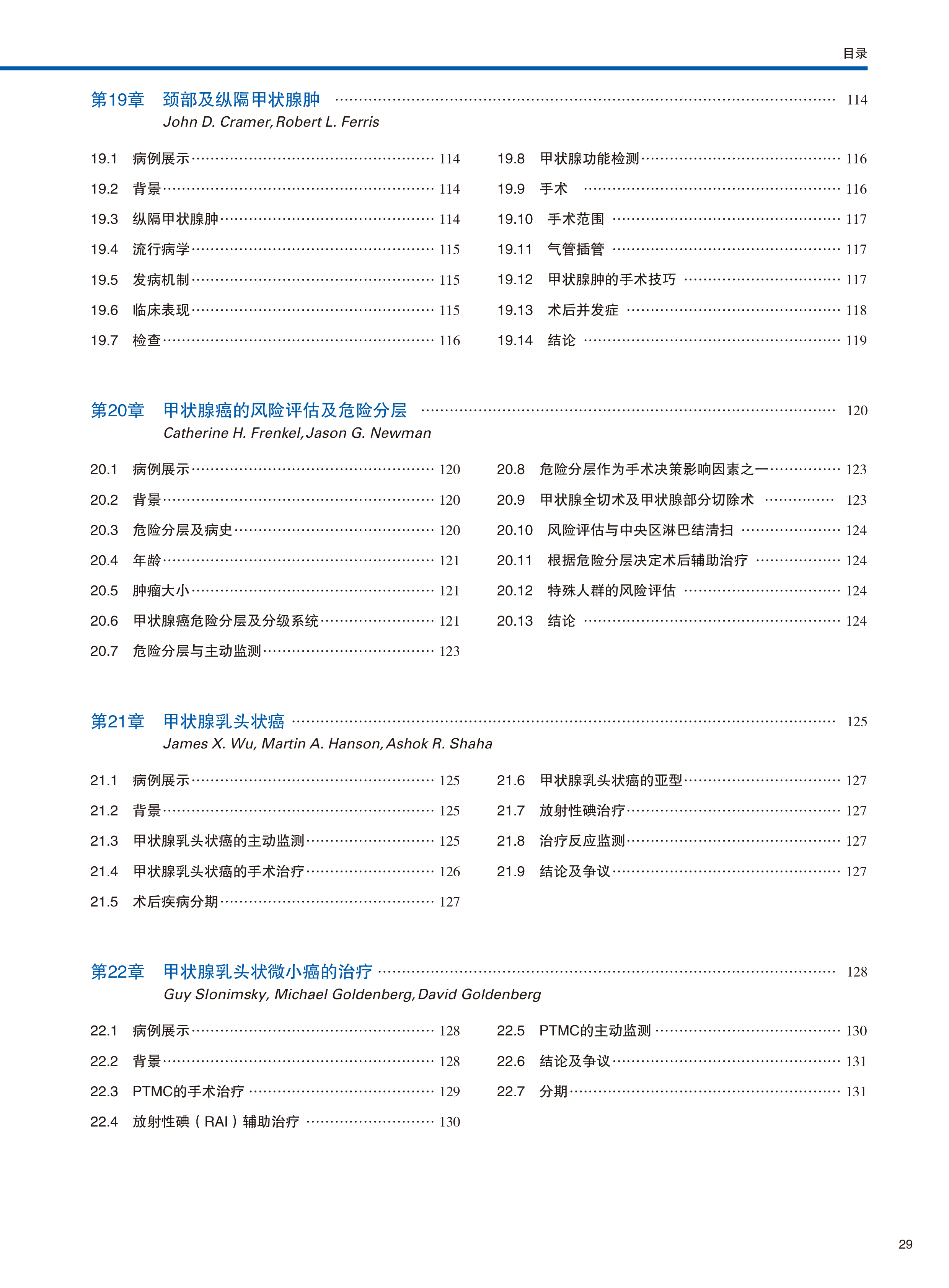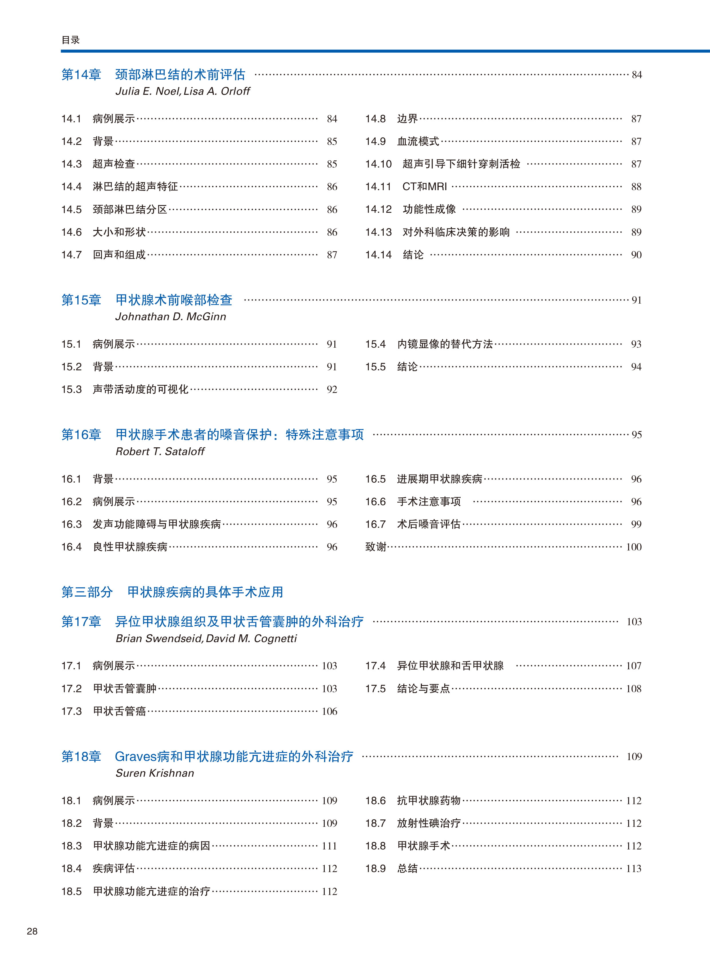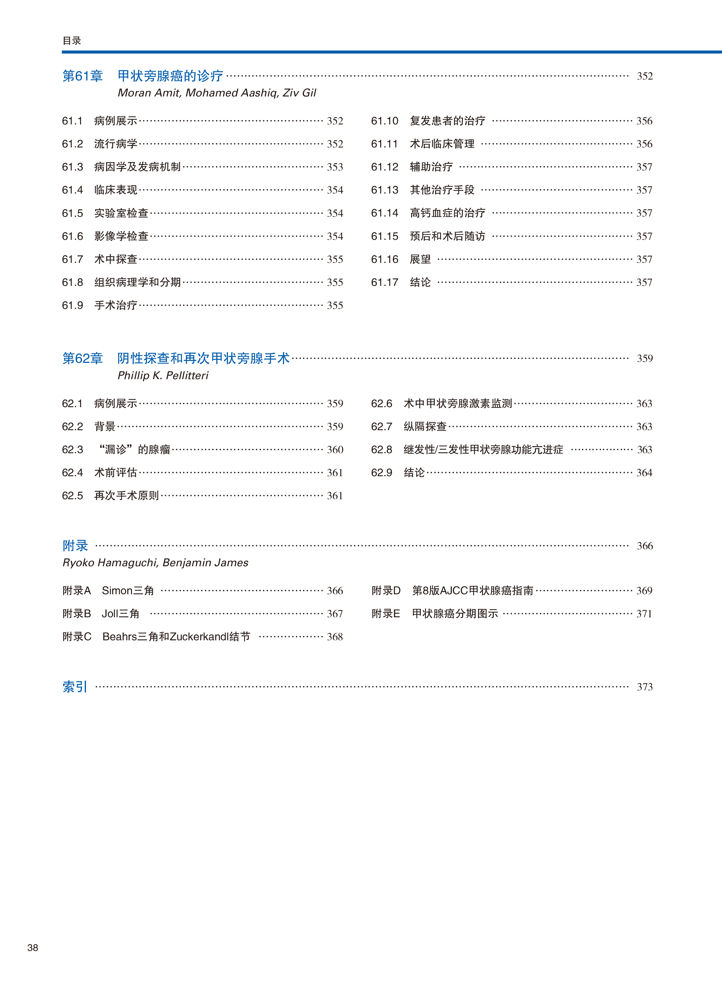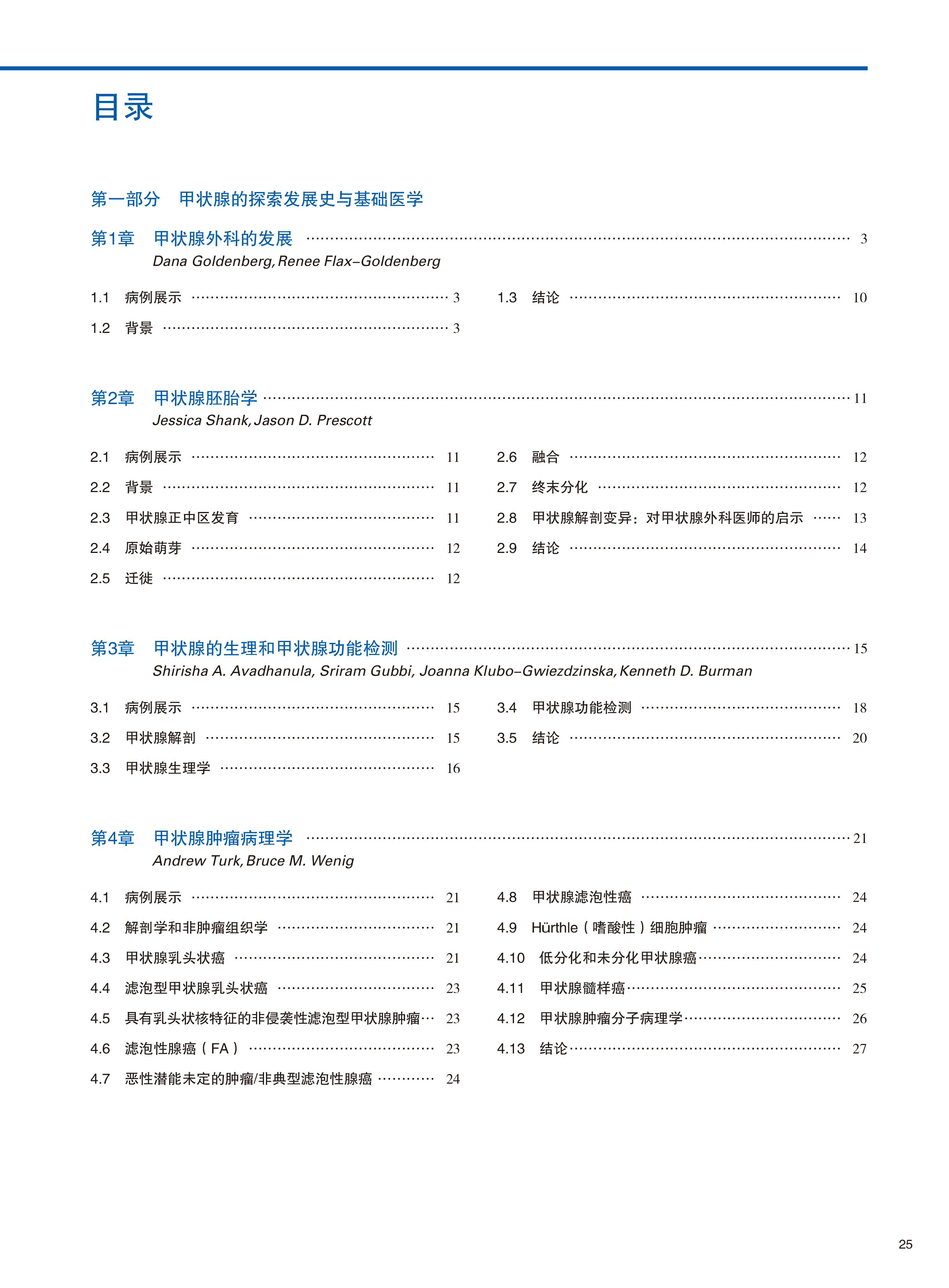 本书是对甲状腺和甲状旁腺手术相关的病理学、解剖学、胚胎学、甲状腺学、术前术后护理和手术实操技术的较为全面、现代化的综述。本书的优势在于其编著者是头颈部和内分泌外科以及内分泌学、病理学和放射学领域的领袖级专家。他们提供了他们丰富的诊疗经验及其对与治疗甲状腺和甲状旁腺疾病患者相关的话题的看法。本书是一本针对现代学习者的教科书。为此,我们在每章的开篇添加了“关键要点”,以及一个简短的病例展示。此外,书中还包括关键问题和陈述等相关内容,以帮助读者思考和理解文中提出的相关问题。此外,我们为每章节添加了注释式参考书目,列出了该章节主题下进行的3~5项较为重要的研究,并进行简要描述,以便读者更好地将其融入已经阅读的内容中。同时,也鼓励读者深入了解某个特定主题的更多信息。本书旨在为外科医师和内分泌学家提供资源。无论对于经验丰富的外科医师,还是住院医师或研究生,这都是一本具有学习价值的参考书。此书还配有一个视频库,突出展示了一些较为杰出的头颈部内分泌手术临床医师施行的多种手术技术。