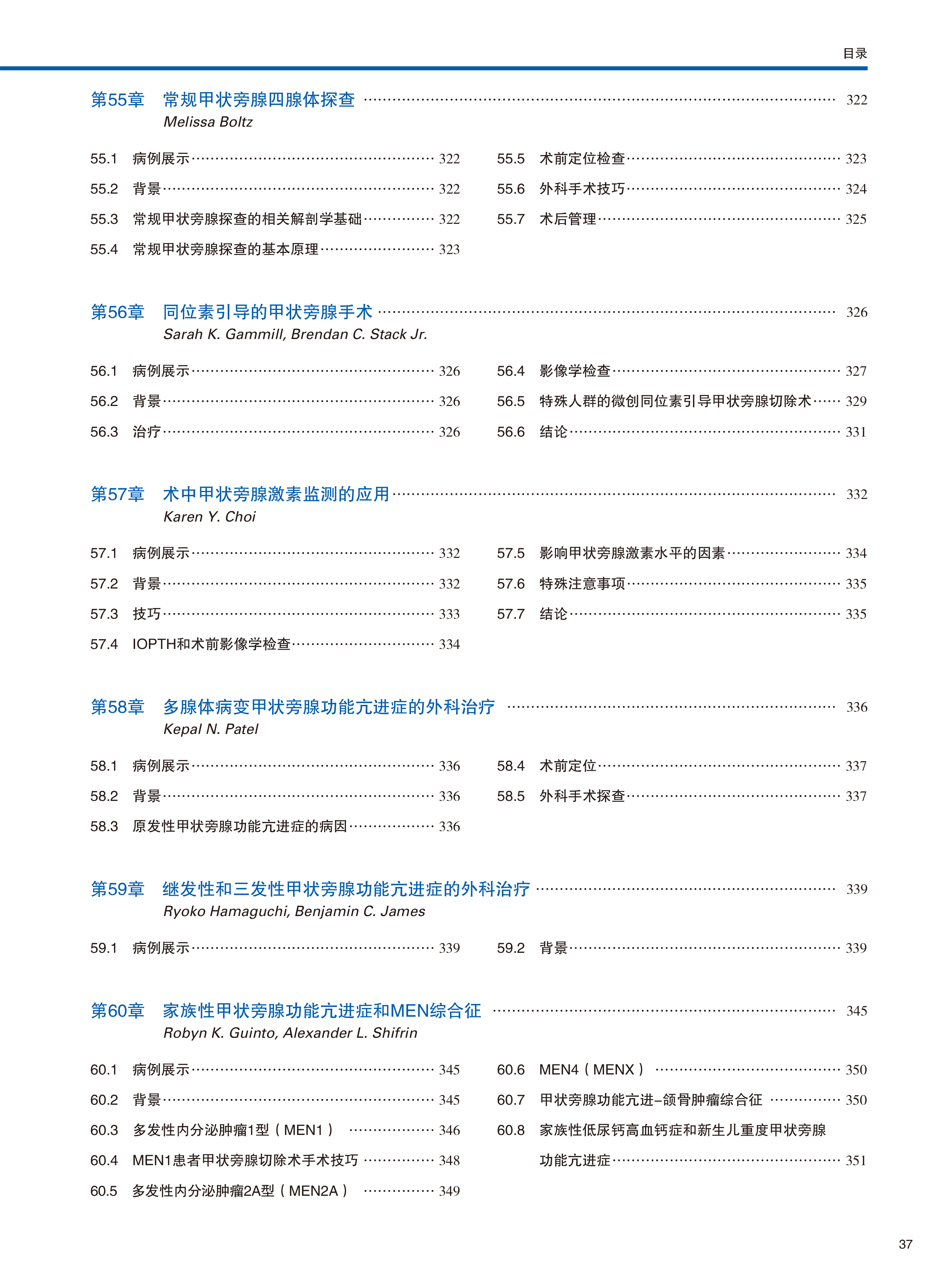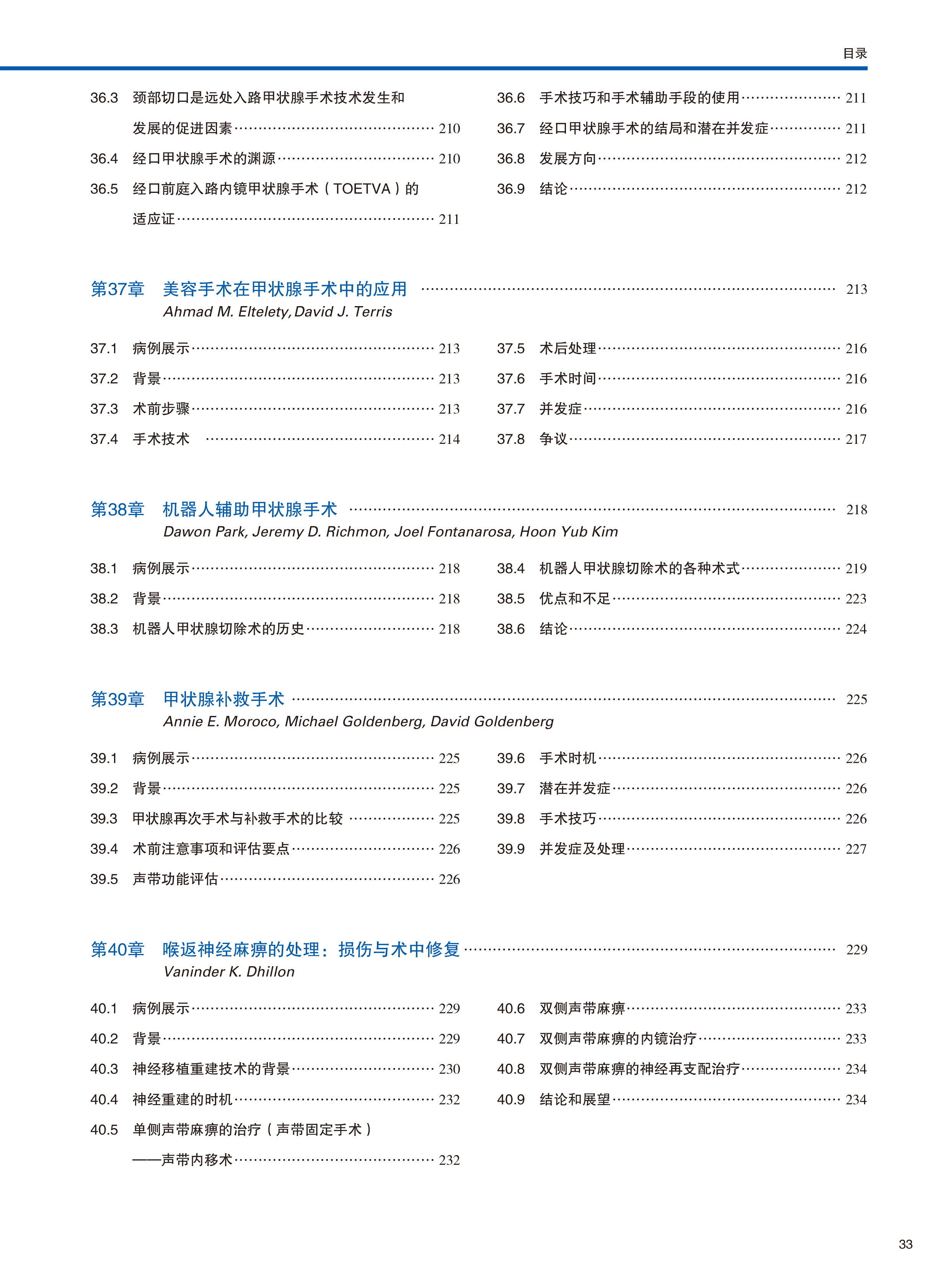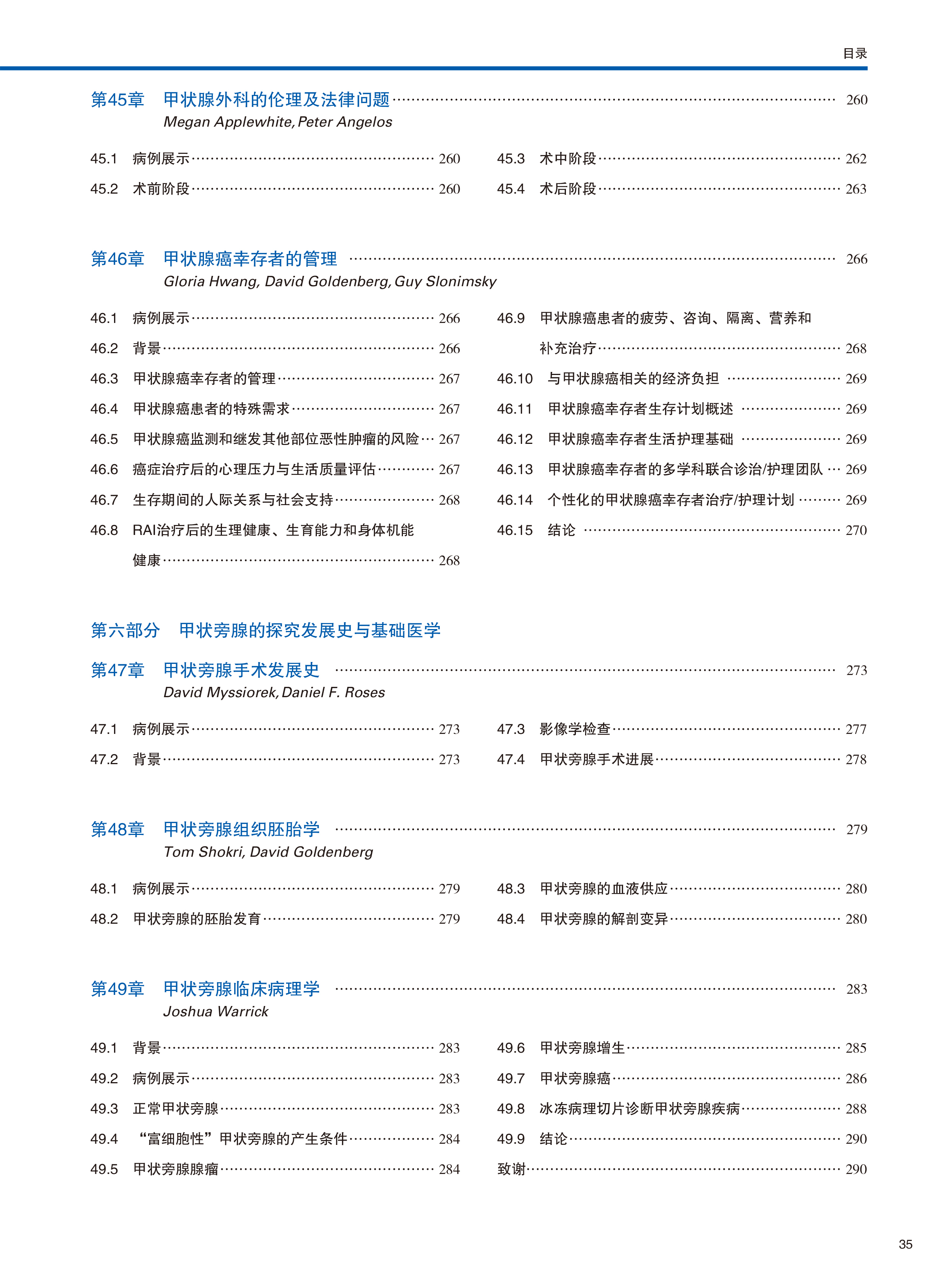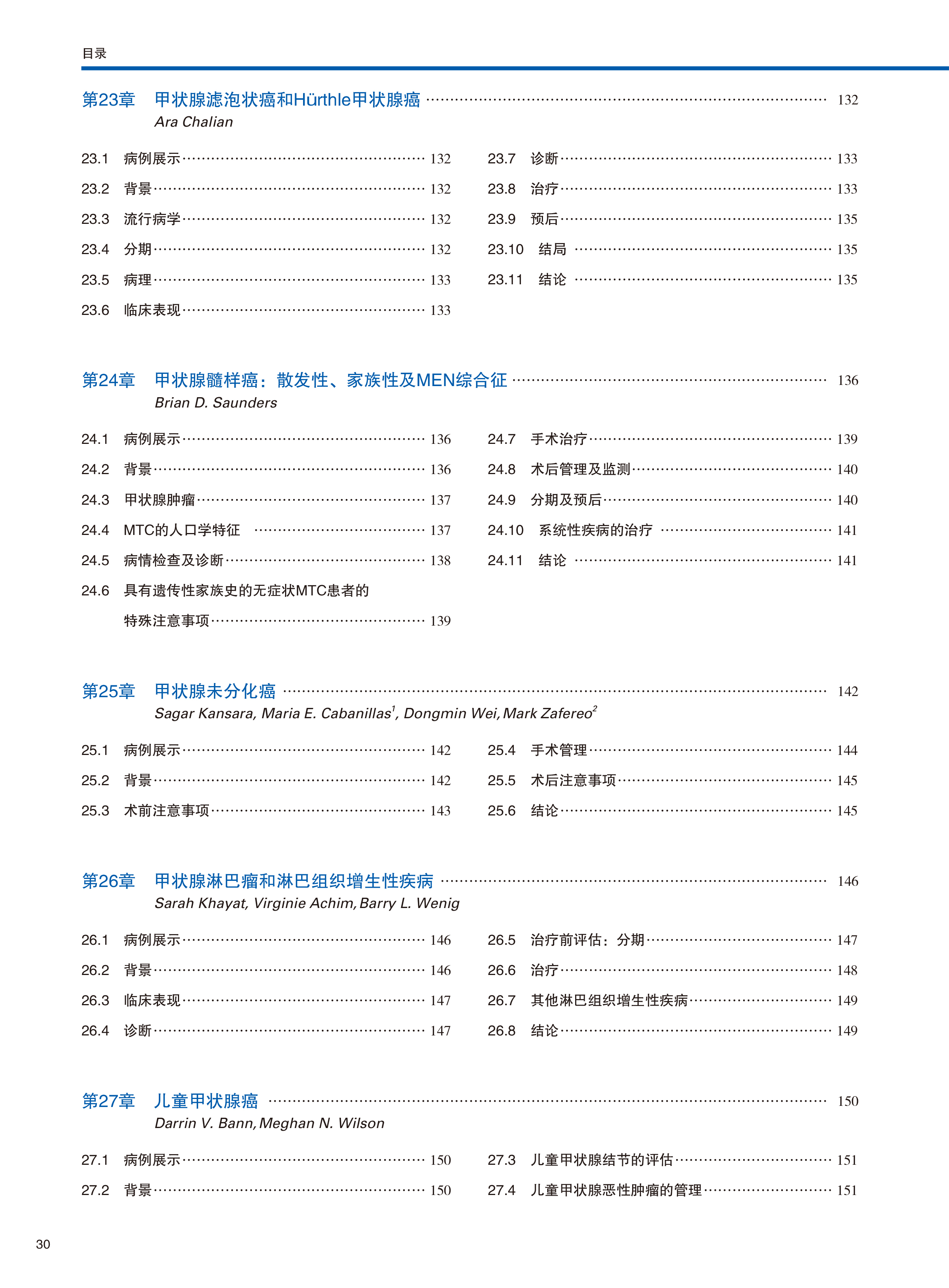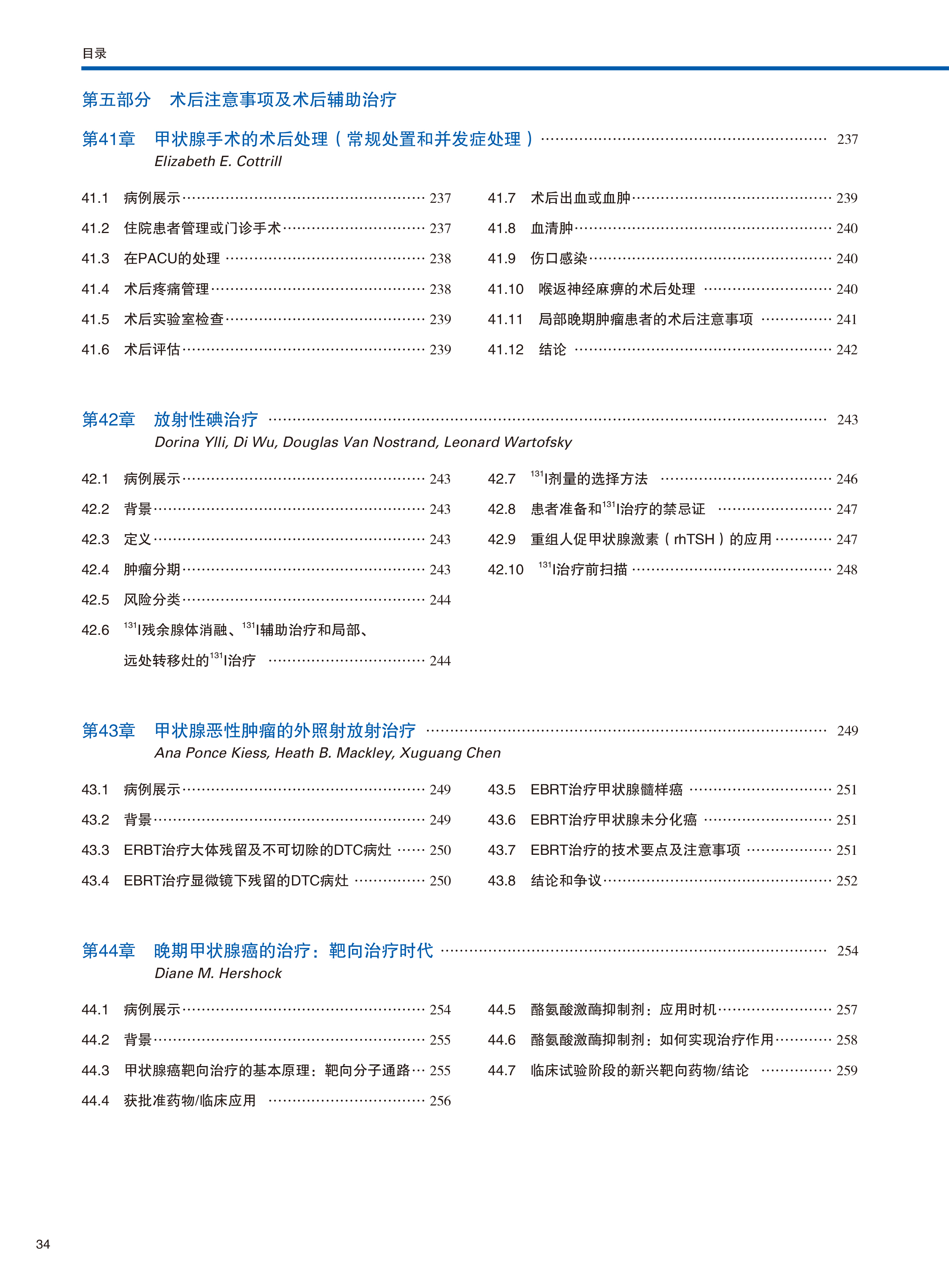 本书是对甲状腺和甲状旁腺手术相关的病理学、解剖学、胚胎学、甲状腺学、术前术后护理和手术实操技术的较为全面、现代化的综述。本书的优势在于其编著者是头颈部和内分泌外科以及内分泌学、病理学和放射学领域的领袖级专家。他们提供了他们丰富的诊疗经验及其对与治疗甲状腺和甲状旁腺疾病患者相关的话题的看法。本书是一本针对现代学习者的教科书。为此,我们在每章的开篇添加了“关键要点”,以及一个简短的病例展示。此外,书中还包括关键问题和陈述等相关内容,以帮助读者思考和理解文中提出的相关问题。此外,我们为每章节添加了注释式参考书目,列出了该章节主题下进行的3~5项较为重要的研究,并进行简要描述,以便读者更好地将其融入已经阅读的内容中。同时,也鼓励读者深入了解某个特定主题的更多信息。本书旨在为外科医师和内分泌学家提供资源。无论对于经验丰富的外科医师,还是住院医师或研究生,这都是一本具有学习价值的参考书。此书还配有一个视频库,突出展示了一些较为杰出的头颈部内分泌手术临床医师施行的多种手术技术。