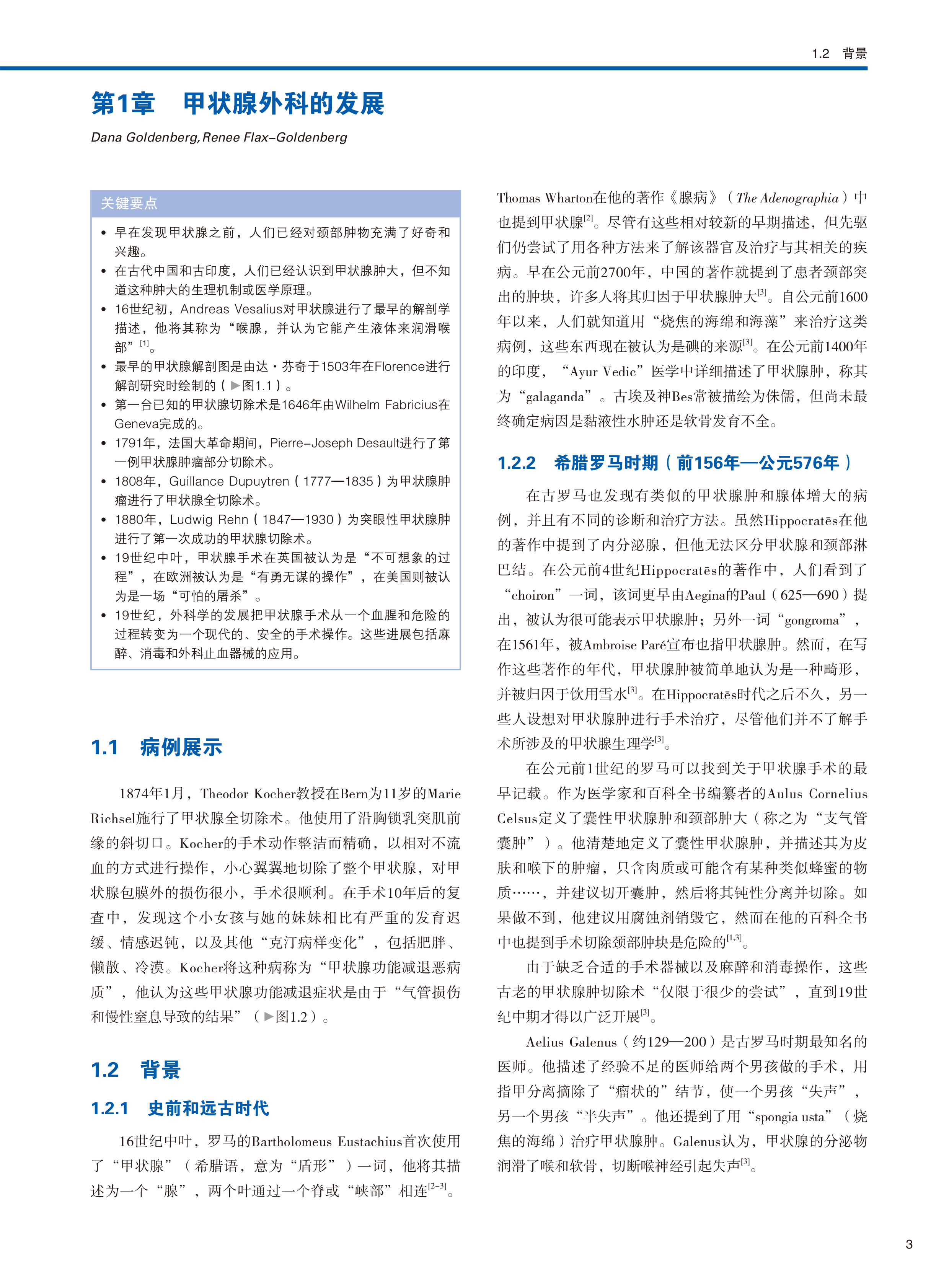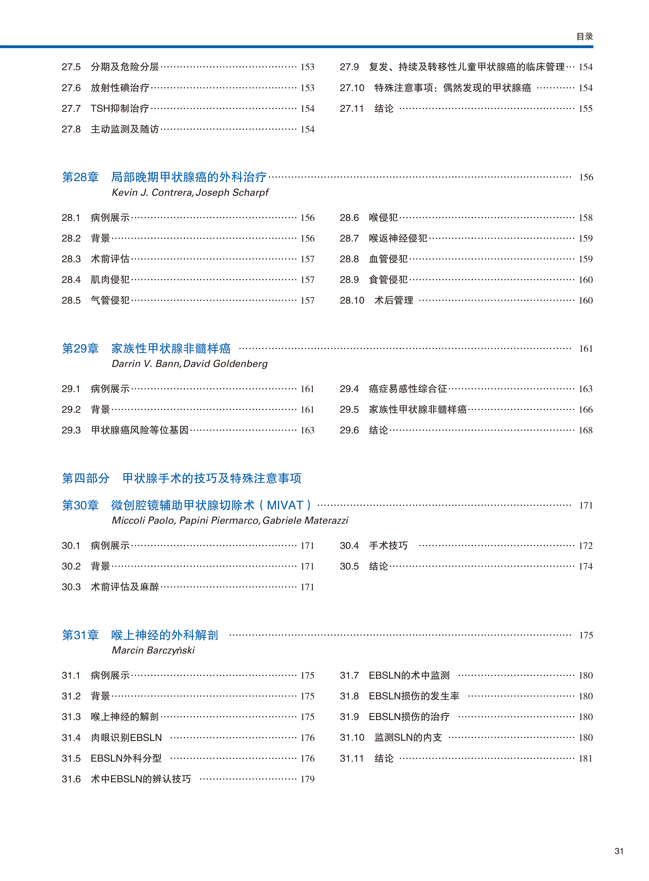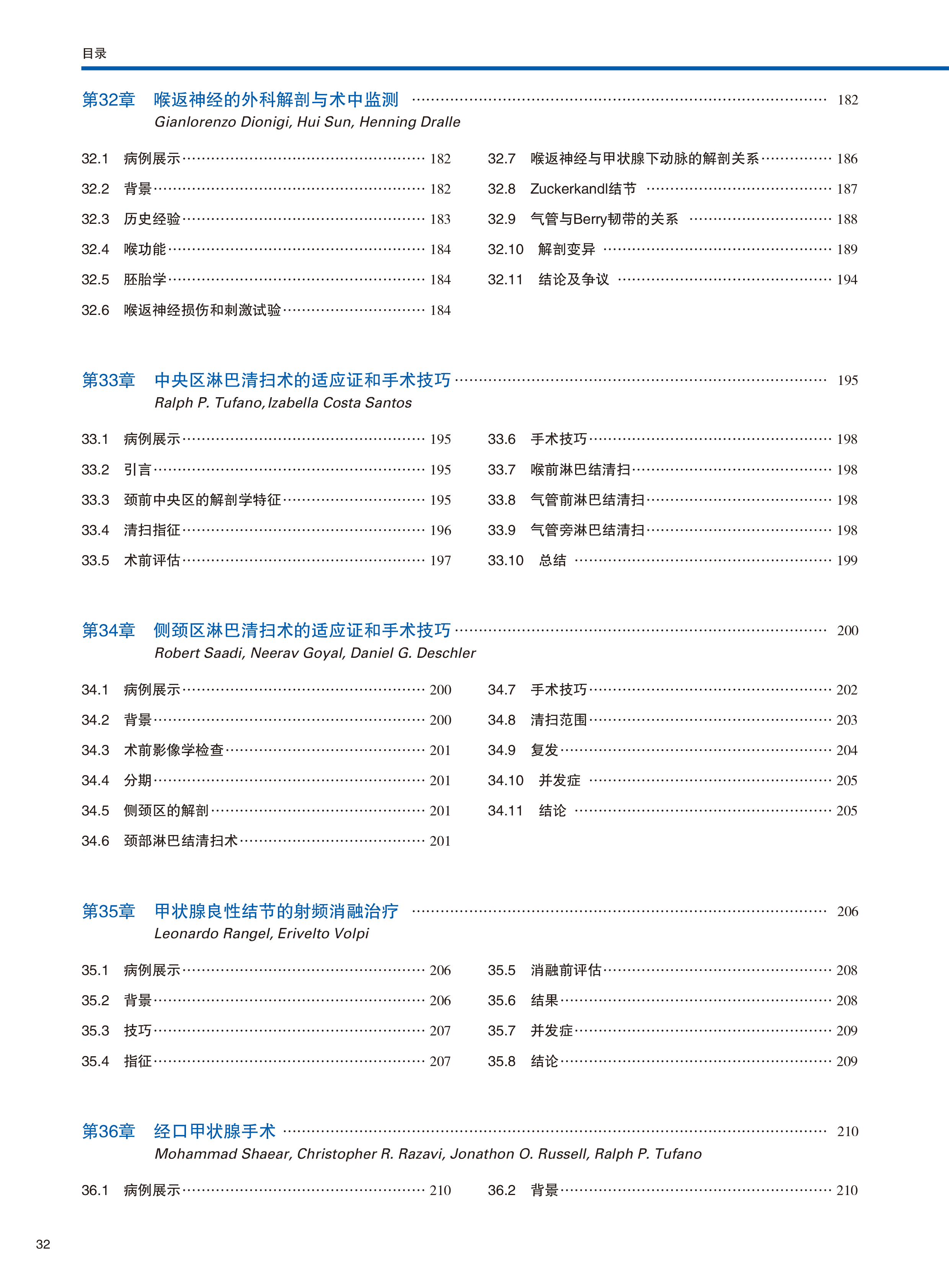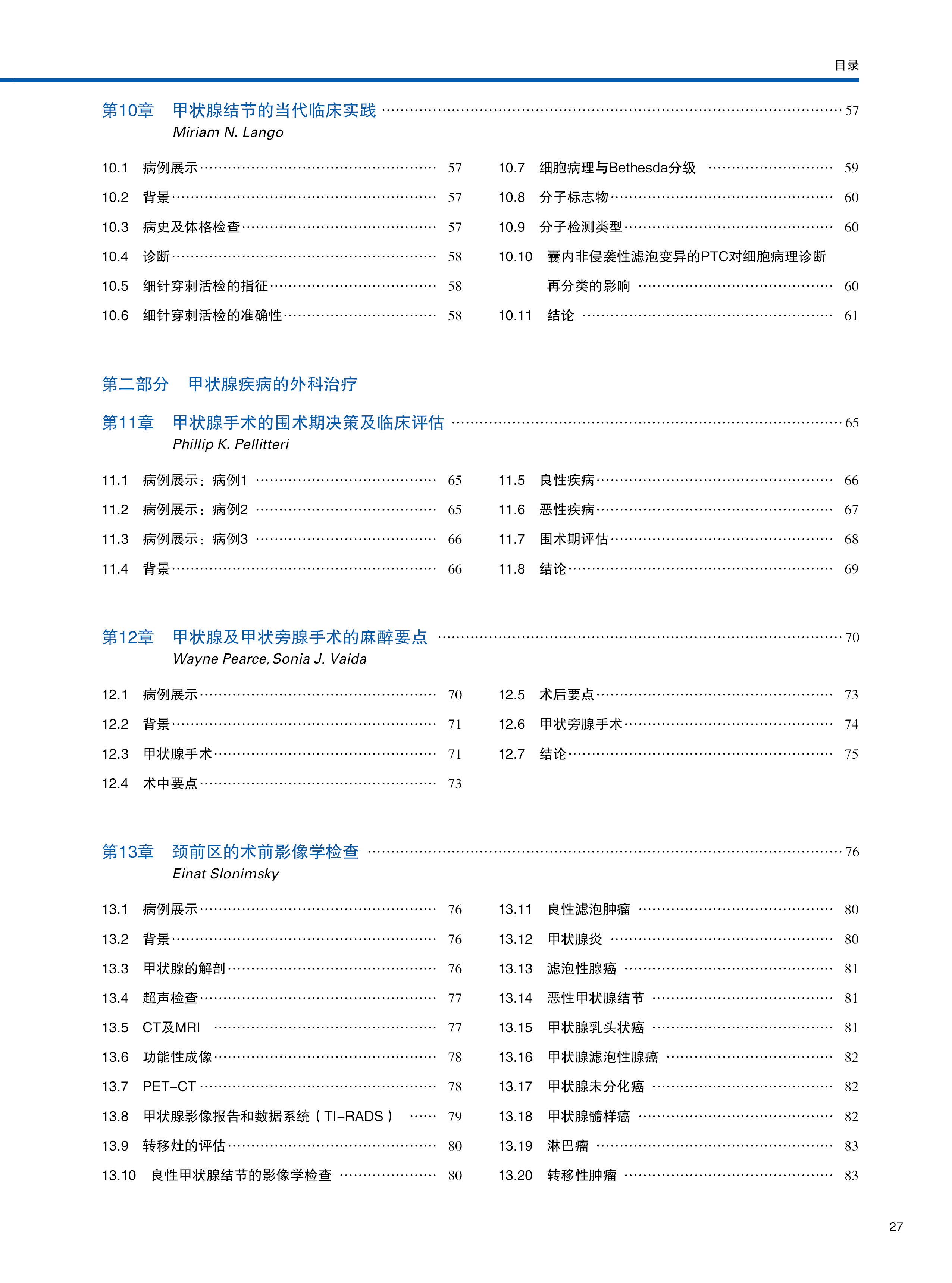 本书是对甲状腺和甲状旁腺手术相关的病理学、解剖学、胚胎学、甲状腺学、术前术后护理和手术实操技术的较为全面、现代化的综述。本书的优势在于其编著者是头颈部和内分泌外科以及内分泌学、病理学和放射学领域的领袖级专家。他们提供了他们丰富的诊疗经验及其对与治疗甲状腺和甲状旁腺疾病患者相关的话题的看法。本书是一本针对现代学习者的教科书。为此,我们在每章的开篇添加了“关键要点”,以及一个简短的病例展示。此外,书中还包括关键问题和陈述等相关内容,以帮助读者思考和理解文中提出的相关问题。此外,我们为每章节添加了注释式参考书目,列出了该章节主题下进行的3~5项较为重要的研究,并进行简要描述,以便读者更好地将其融入已经阅读的内容中。同时,也鼓励读者深入了解某个特定主题的更多信息。本书旨在为外科医师和内分泌学家提供资源。无论对于经验丰富的外科医师,还是住院医师或研究生,这都是一本具有学习价值的参考书。此书还配有一个视频库,突出展示了一些较为杰出的头颈部内分泌手术临床医师施行的多种手术技术。