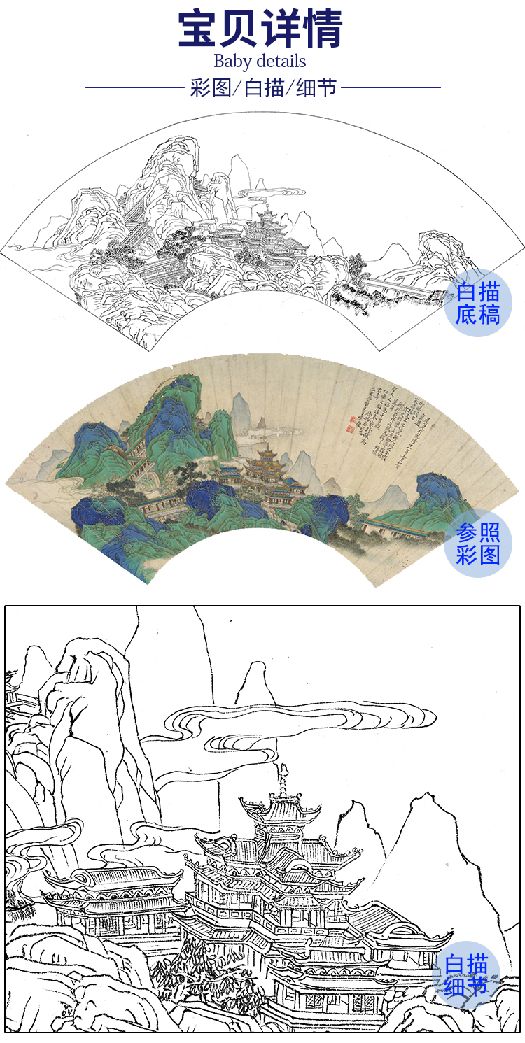 工笔画白描底稿 扇面小品-清-徐扬-山水图-SR43