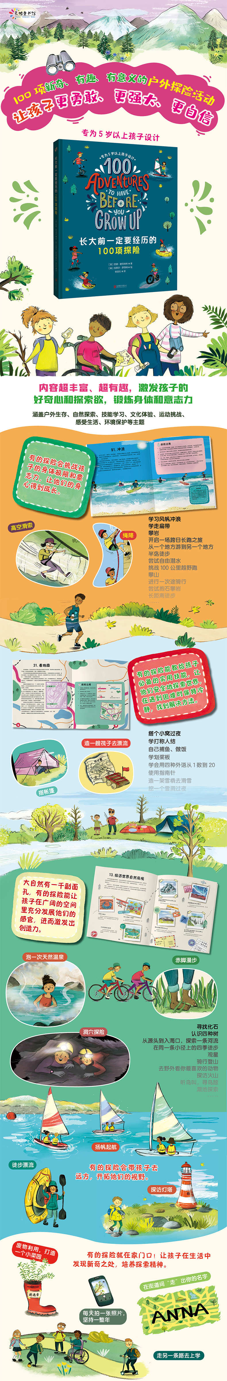 英国女探险家、作家、励志演说家安娜・麦克纳夫精心挑选的 100 项适合孩子在长大前体验的探险活动,涵盖户外生存、自然探索、技能学习、文化体验、运动挑战、感受生活、环境保护等主题。