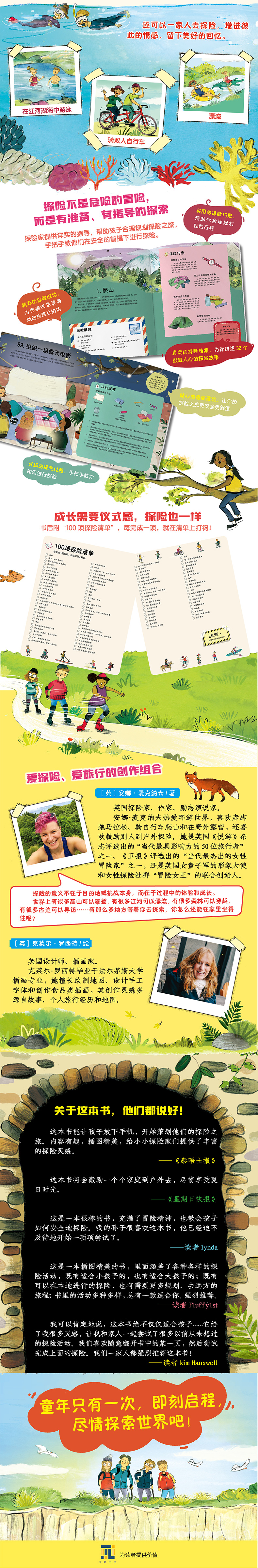 这本书能让孩子放下手机,开始策划他们的探险之旅。内容有趣,插图精美,给小小探险家们提供了丰富的探险灵感。——《泰晤士报》