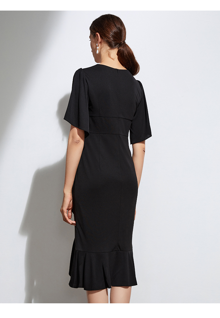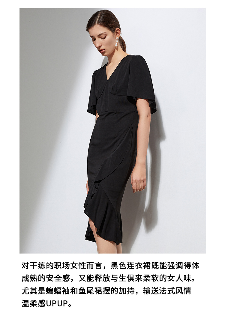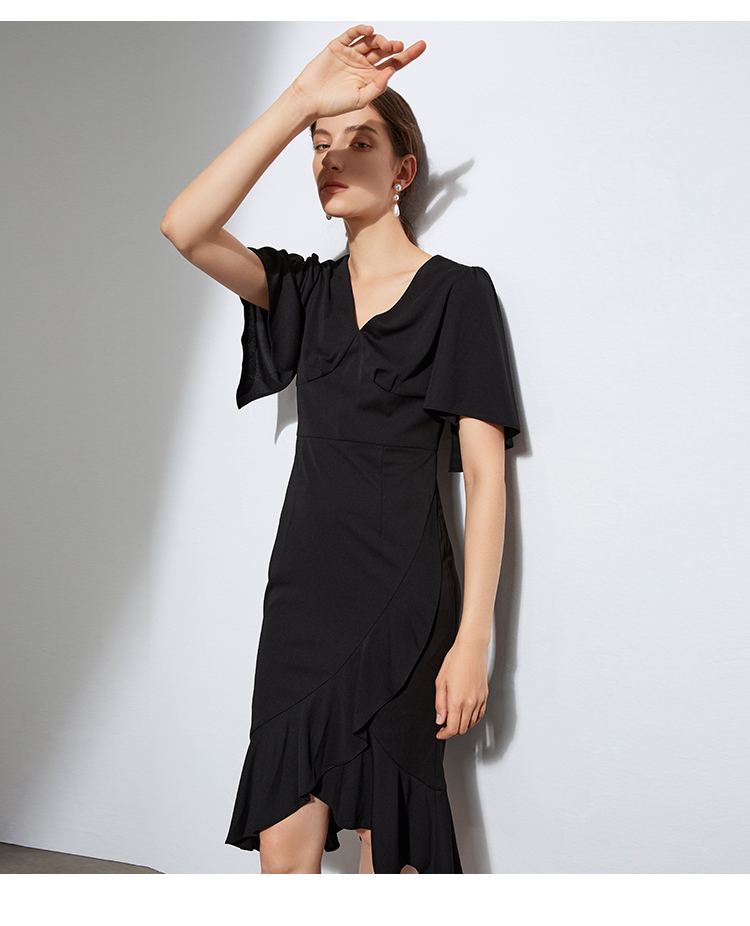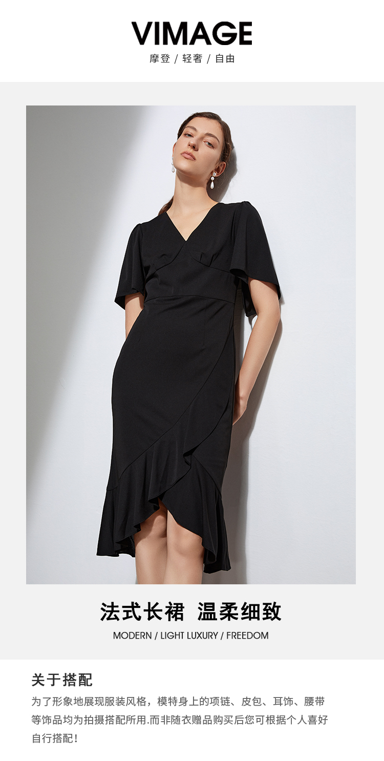 VIMAGE纬漫纪夏季V领时尚修身显瘦黑色裙子连衣裙VB2107138
