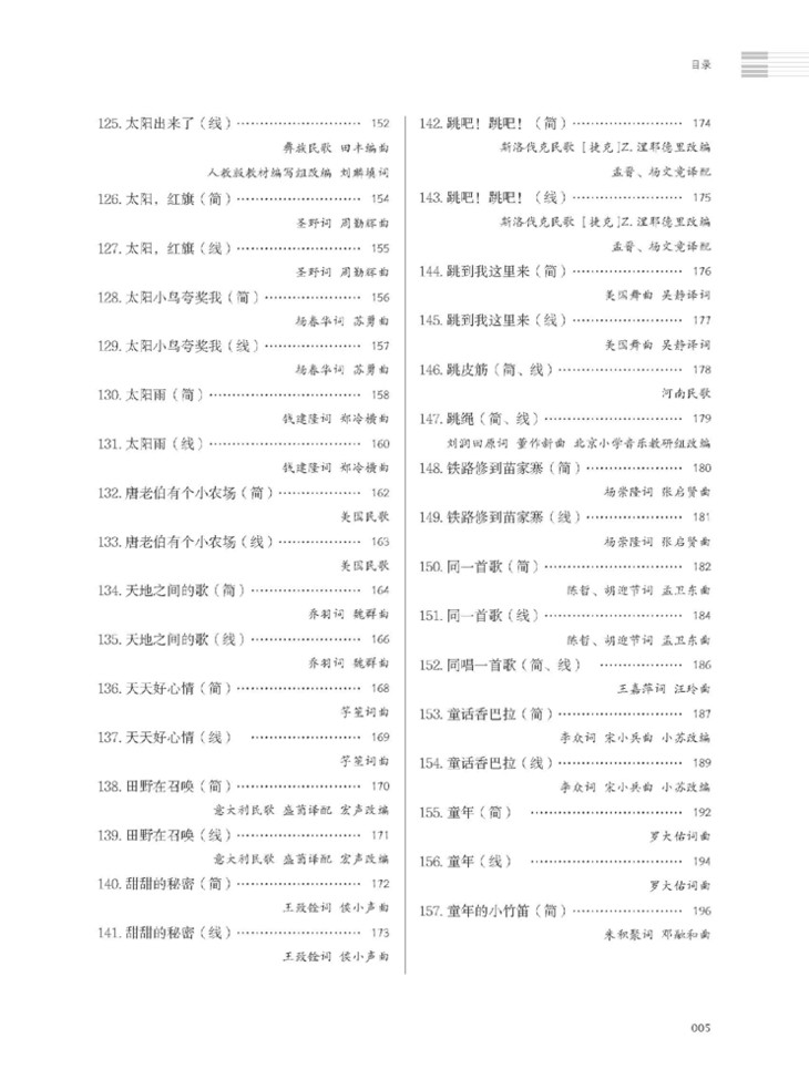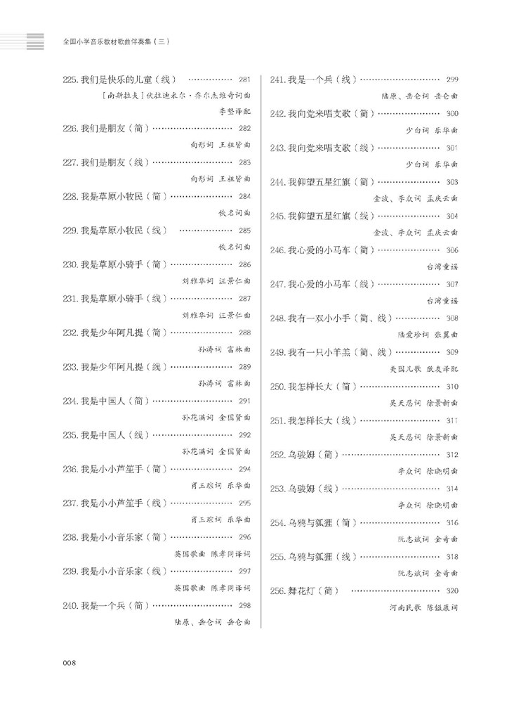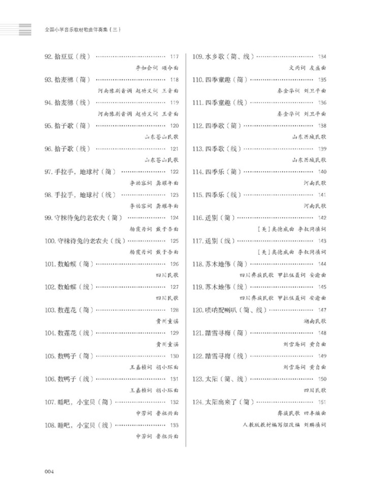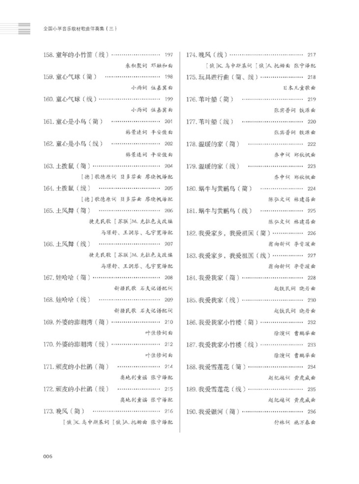 歌曲弹唱是小学音乐教学中最主要的教学活动,是一门理论与实践相结合的技能技巧课,具有很强的实用性;也是小学音乐教师知识、技术、能力与素质的综合体现,是每位音乐教师必备的能力!然而,现实中歌曲弹唱却是很多老师的短板,特别是在伴奏方面,鉴于此,我们推出了这一套《全国小学音乐教材歌曲伴奏集》,旨在用最简单好听的伴奏,让老师们快速上手,弹唱自如,轻松教学。本套曲集选取了全国最新修订的小学音乐课标教材的“歌曲”部分,包括人音版、人教版、西师版、湘艺版、花城版、接力版、冀少版、苏少版等,精选出627首编配成钢琴弹唱谱,无缝对接全国各地小学音乐歌唱教学活动,非常实用。曲集共四册,本册是第三册,选取了《敲手鼓的小巴郎》《山里的孩子心爱山》《十个小印第安人》《守株待兔的老农夫》等150首歌曲,有如下几个特点:一是选曲全面,精选了全国入选的8套音乐课标教材中,共同出现的、频率高的经典歌曲,以及各版本有代表性的、优秀的地方民歌、儿歌等;二是曲目量大,包括全国绝大部分小学音乐课标教材中出现的歌曲,全国各地学生均可使用;三是内容实用,考虑到全国各地一线教师不同的读谱习惯,每首歌曲均以五线谱和简谱对照呈现,并按照适合小学生歌唱的音域范围给歌曲定调进行编配,使小朋友们能够在老师的琴声中同步歌唱;四是配套资料丰富,我们为每首歌曲录制了示范音频,以二维码的形式呈现,学生可即扫即听即学即唱。