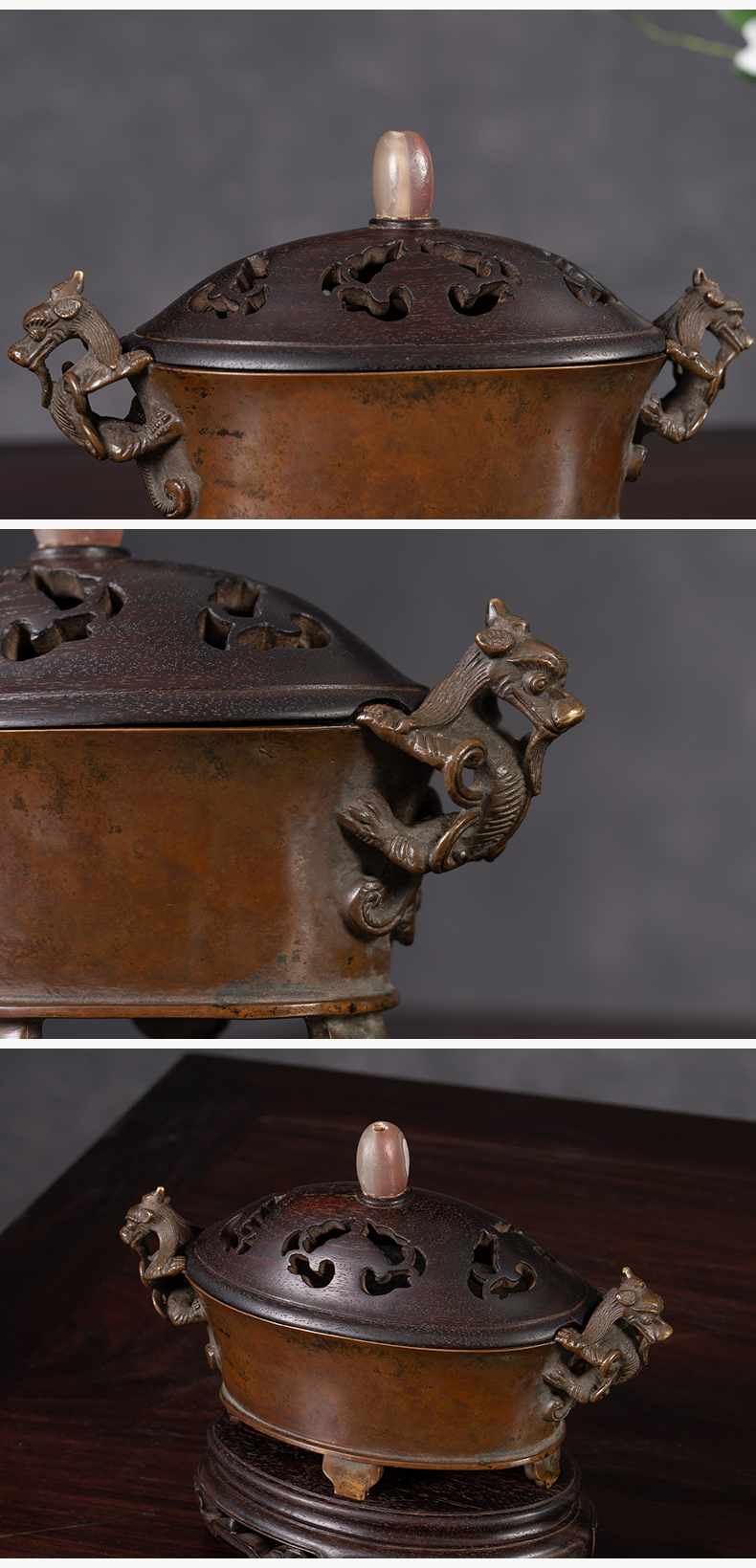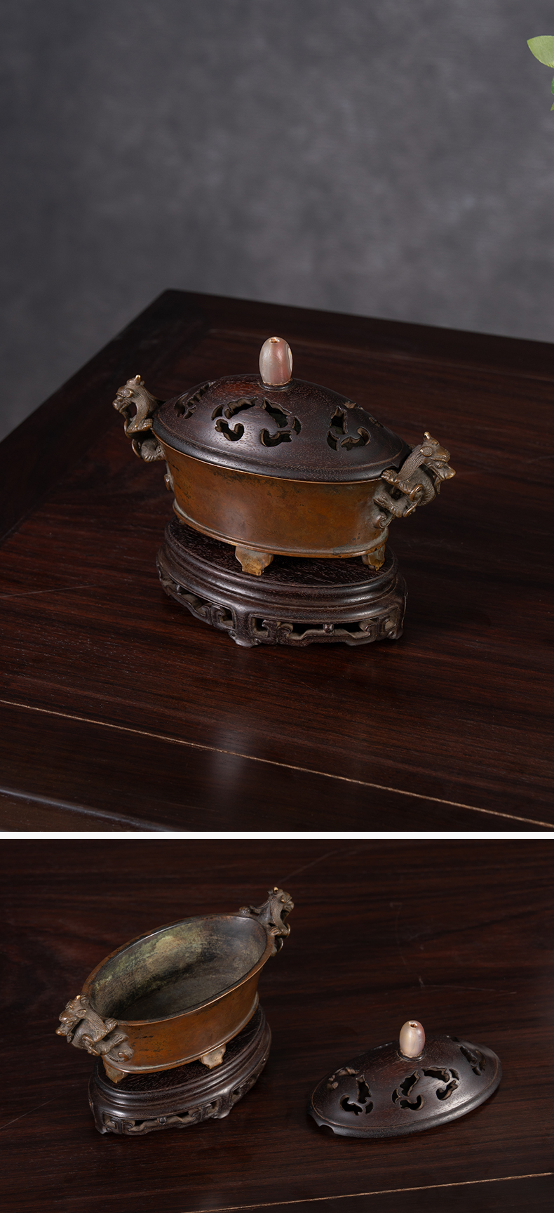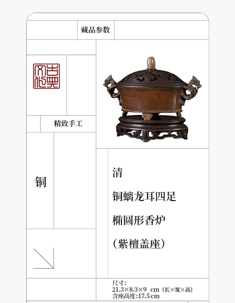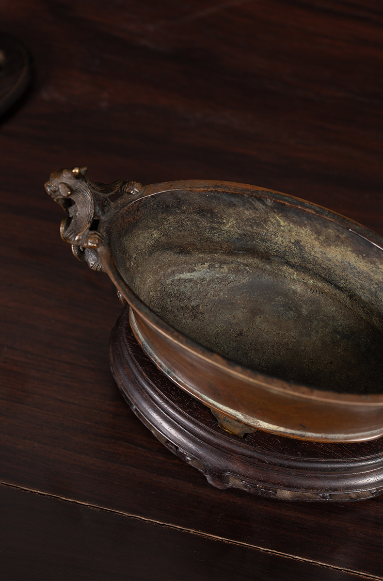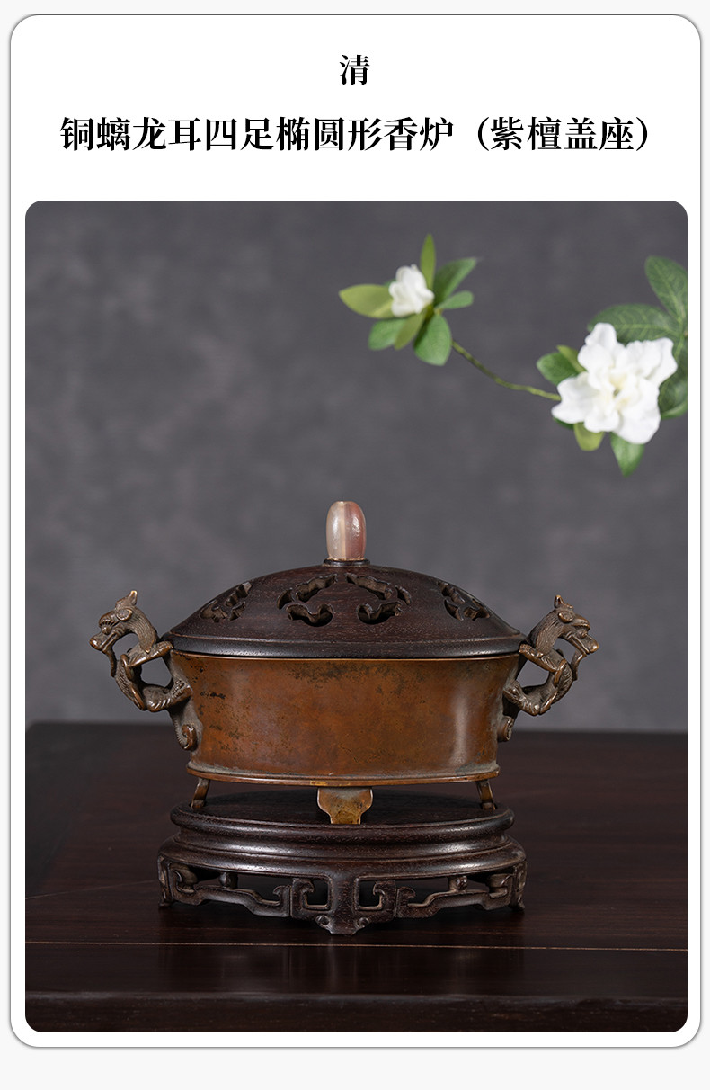 清 铜螭龙耳四足椭圆形香炉(紫檀盖座)