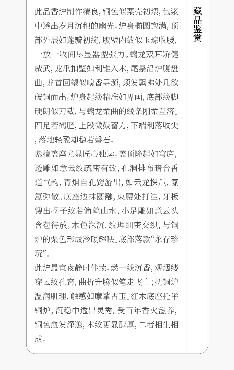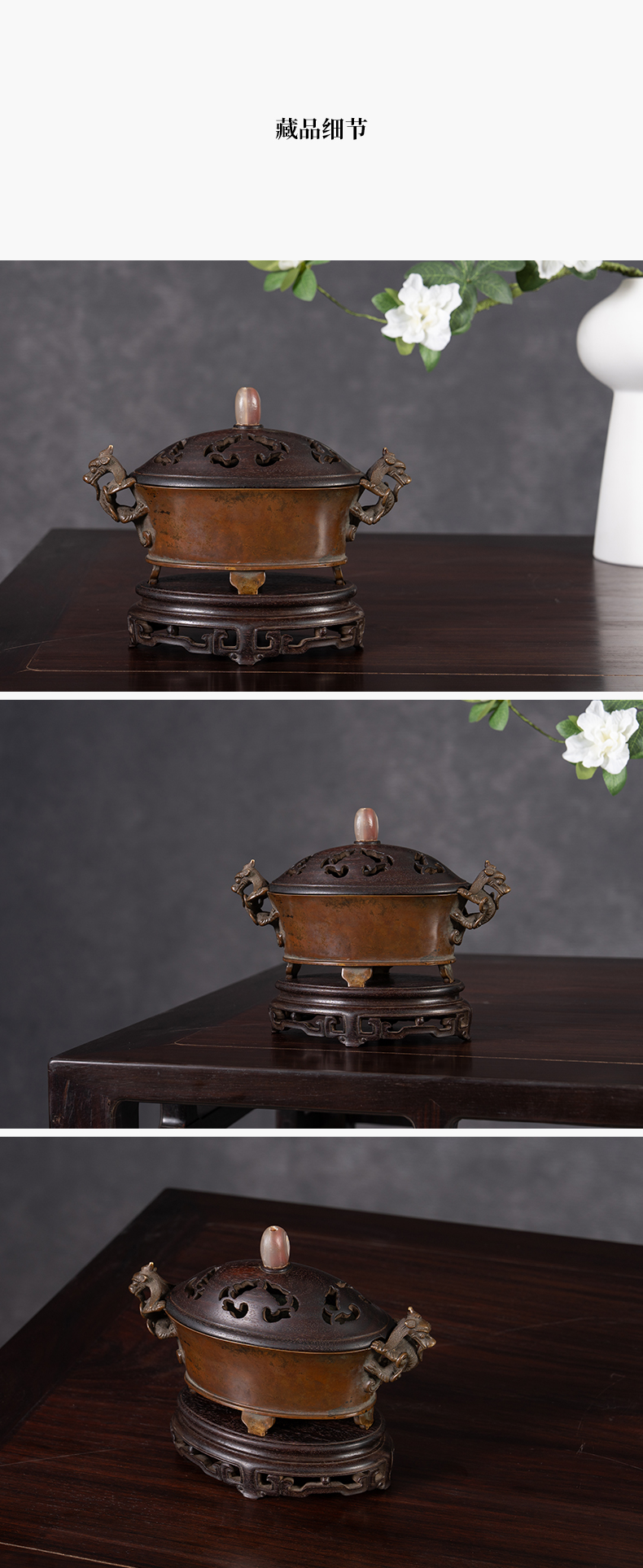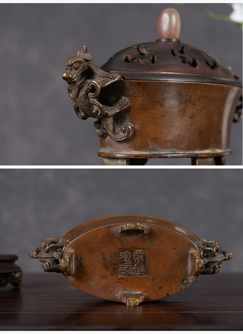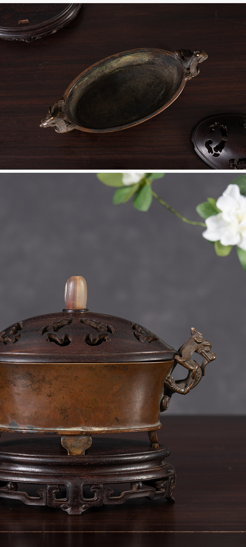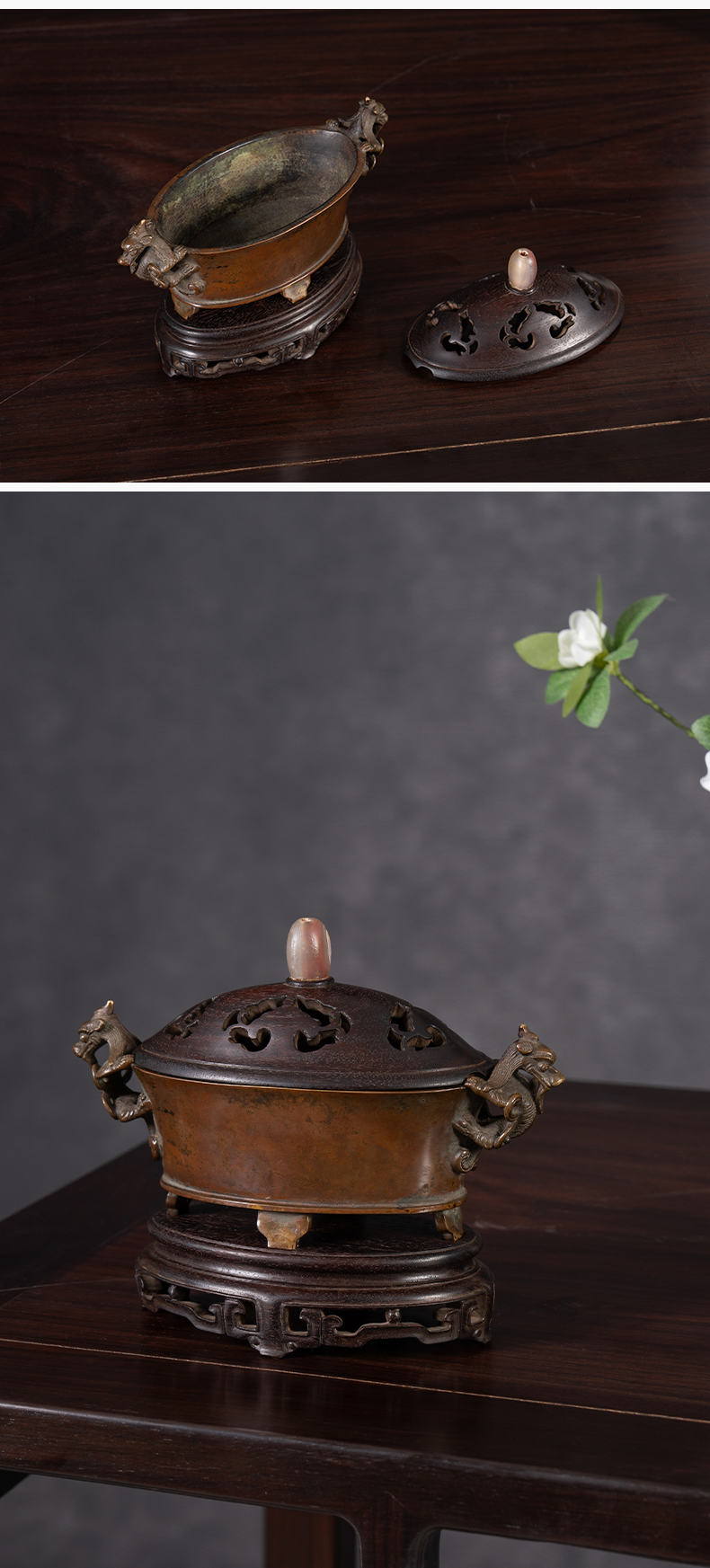 清 铜螭龙耳四足椭圆形香炉(紫檀盖座)