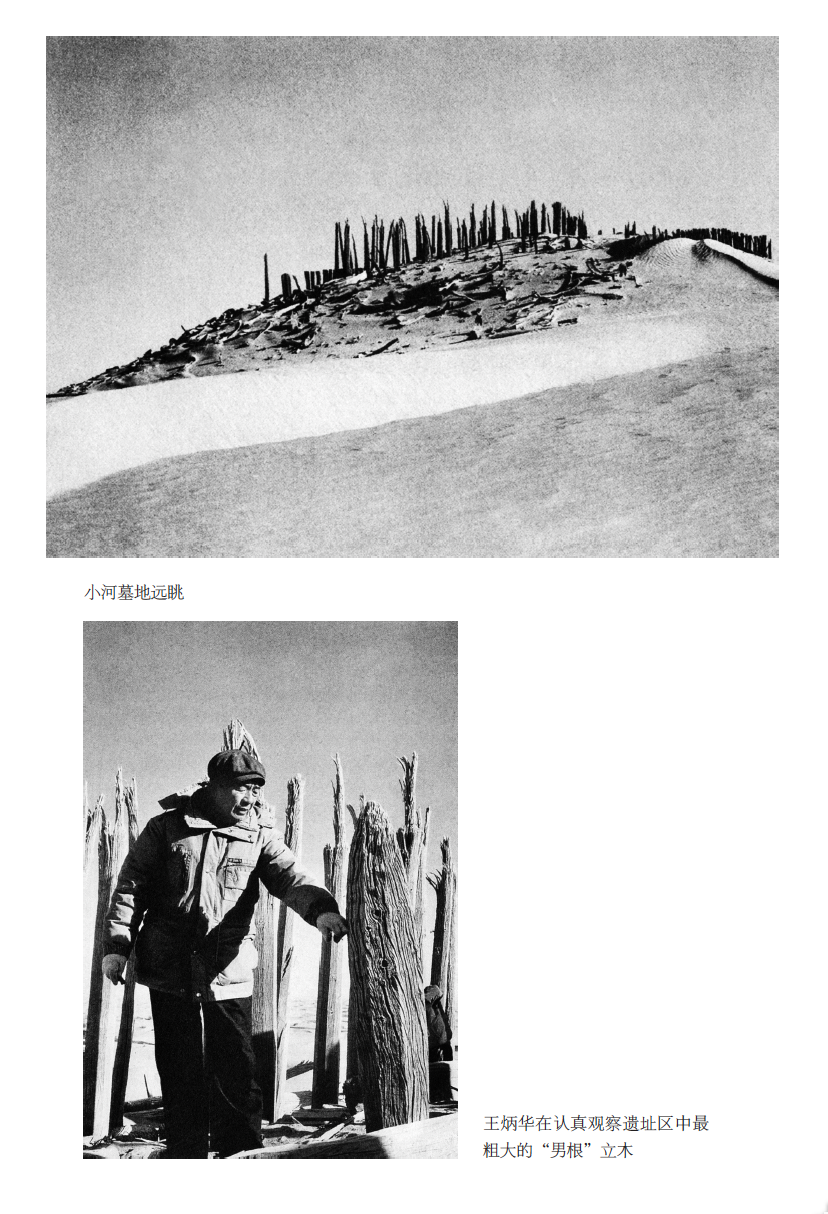 墓地所在沙丘,因应着罗布淖尔荒原上东北季风的运动,呈现自东北向西南方向铺展的长圆形,面积达2400多平方米,高出地表六七米。在四周低矮小沙丘簇拥下,显得特别高大。沙丘顶部密植100多根高3—4米、直径总有25厘米左右的多棱形木柱,其间竖插10多根卵圆形立木;墓地中心,相当显著的是一根中段八棱形、顶部尖锥状的立木,满溢神秘韵味。大部分立木顶端尖锐,但数千年厉风吹蚀、烈日暴晒,都已劈裂、发白。这丛丛列木之东端及圆丘中部,有两排保存相当完好的圆木栅墙。栅墙立木粗大,最粗直径可达50厘米,下部有粗绳捆绑。它们排列整齐如线,不稍错乱,顶部也十分平齐,具显当年经营的细心、匠心。 它们正当东北季风的来路,是为了阻抑每年春季必然到来的东北劲风对墓地的吹蚀,卫护封土的安全,还是作为墓地的界域?或另有特殊的寄托?费人思考,又难得要领。在墓地最东部,至今还耸立着一根高约3米的多棱形木柱,柱体刻凿几何形横槽。这类几何形刻纹的木柱,当年在墓地不止有一根,这一立柱旁边的斜坡上就还见四五根倾扑在地。据说,当年奥尔德克发现墓地时,立柱所在曾经有过一座小木屋,厚厚的木板构成了小屋的墙和顶,屋顶上还盖了牛皮。木屋内墙则涂染成红色,屋内地面散置牛头。就在小屋中部,奥尔德克挖出一口内盛女尸的棺木。报道此事的贝格曼1934年到小河墓地时,并未能觅见木屋、女尸、木棺的痕迹。我们在立柱四周踯躅,除一些在烈日暴晒下过分开裂的白色板块外,再难觅见一点遗痕。