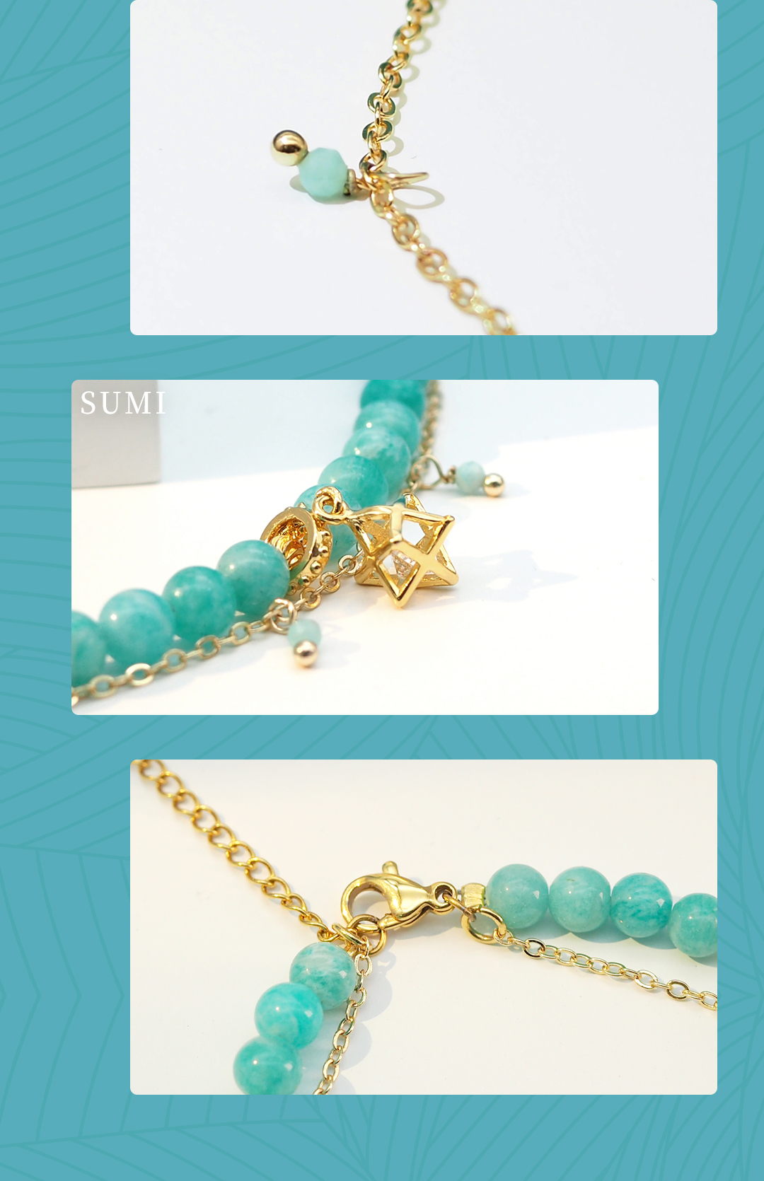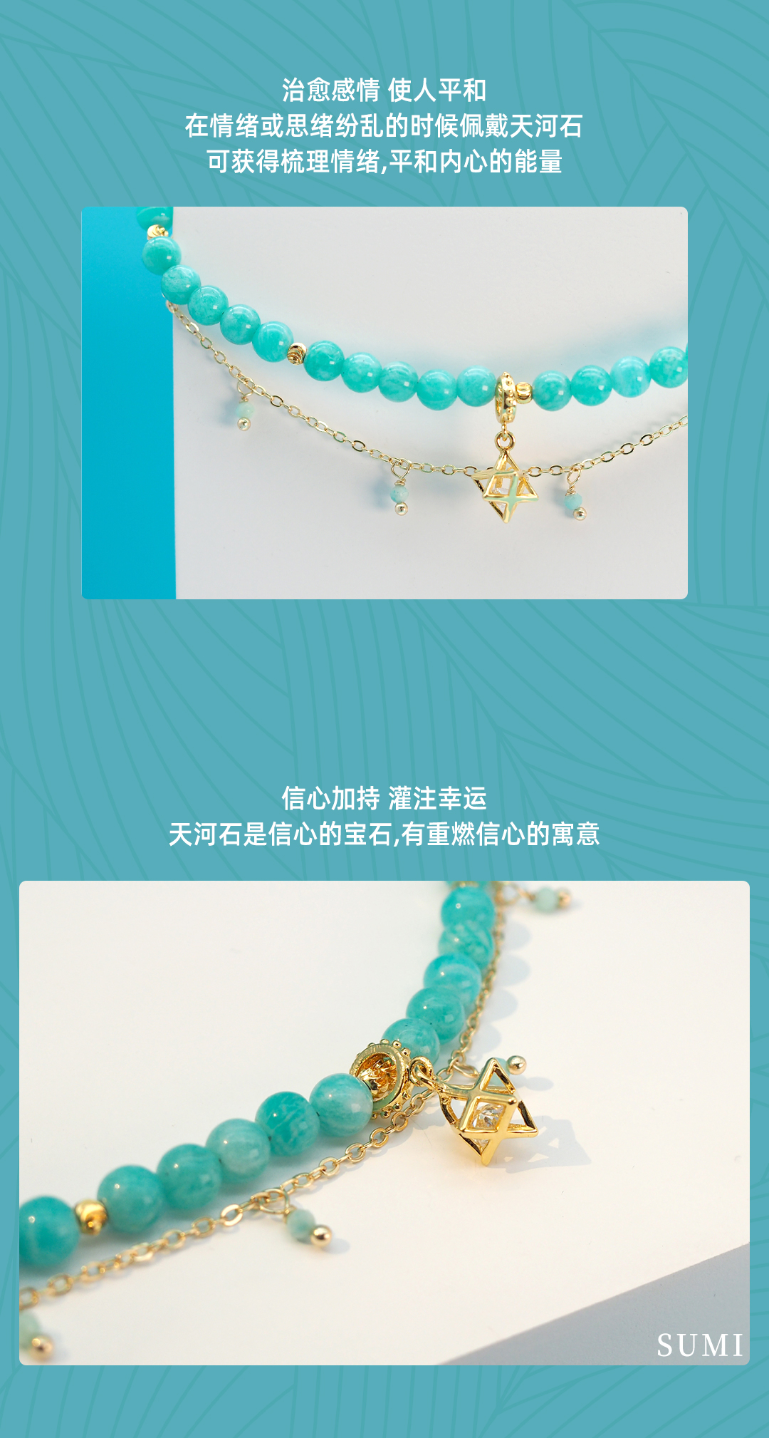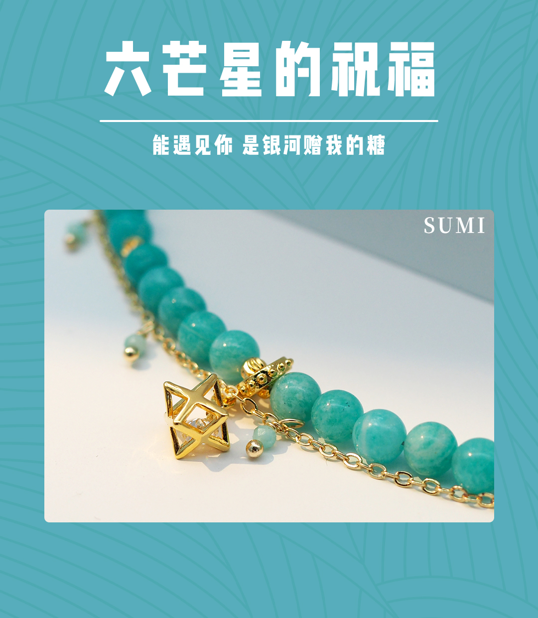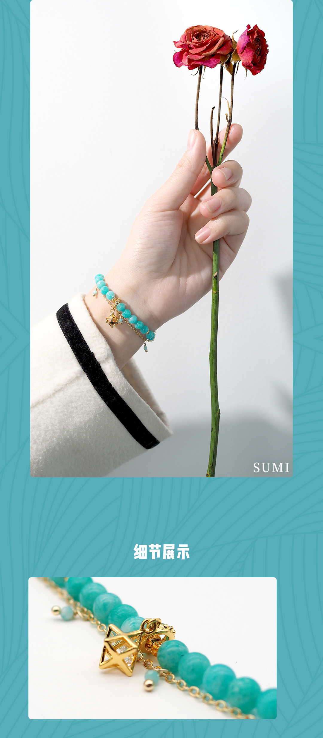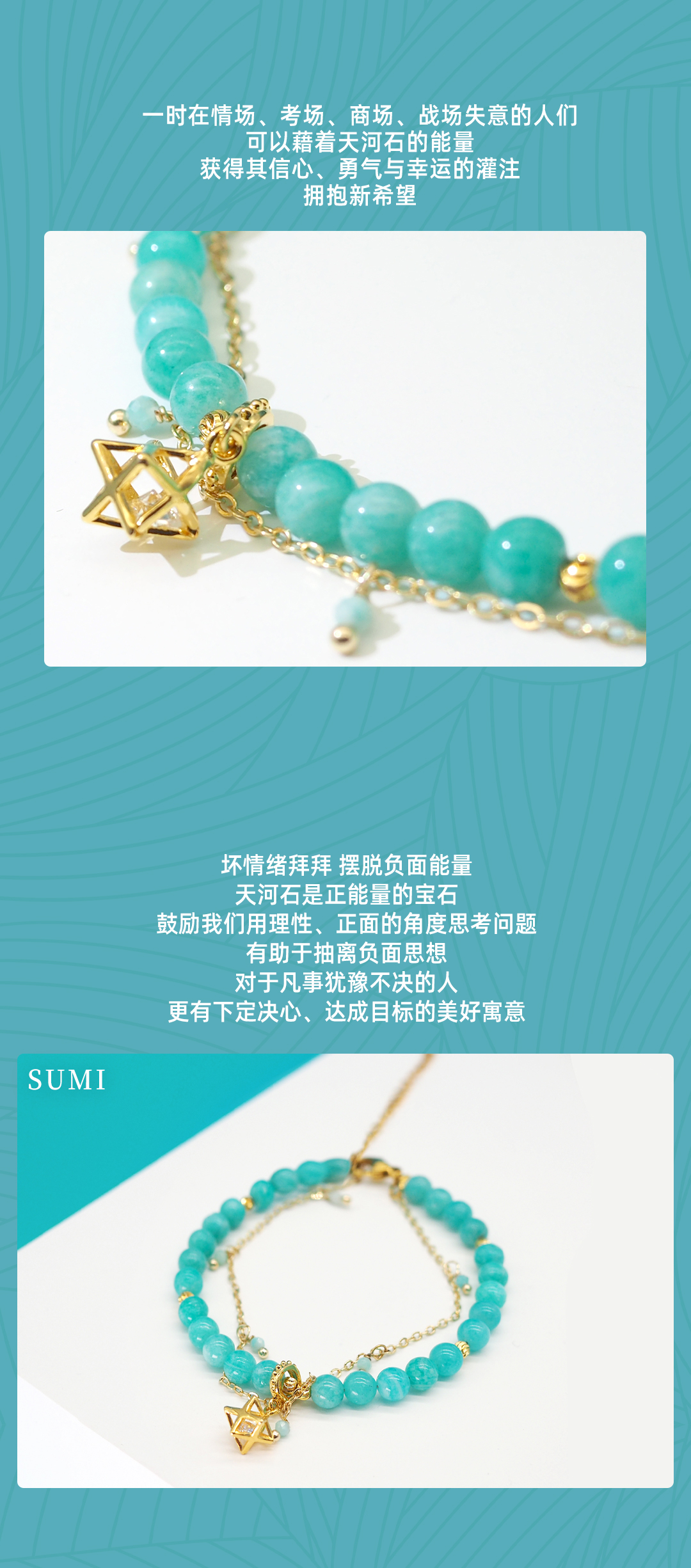3、本手链为单颗珠体6mm的亚马逊天河石串成,由于尺寸为手工量度,可能略有误差。