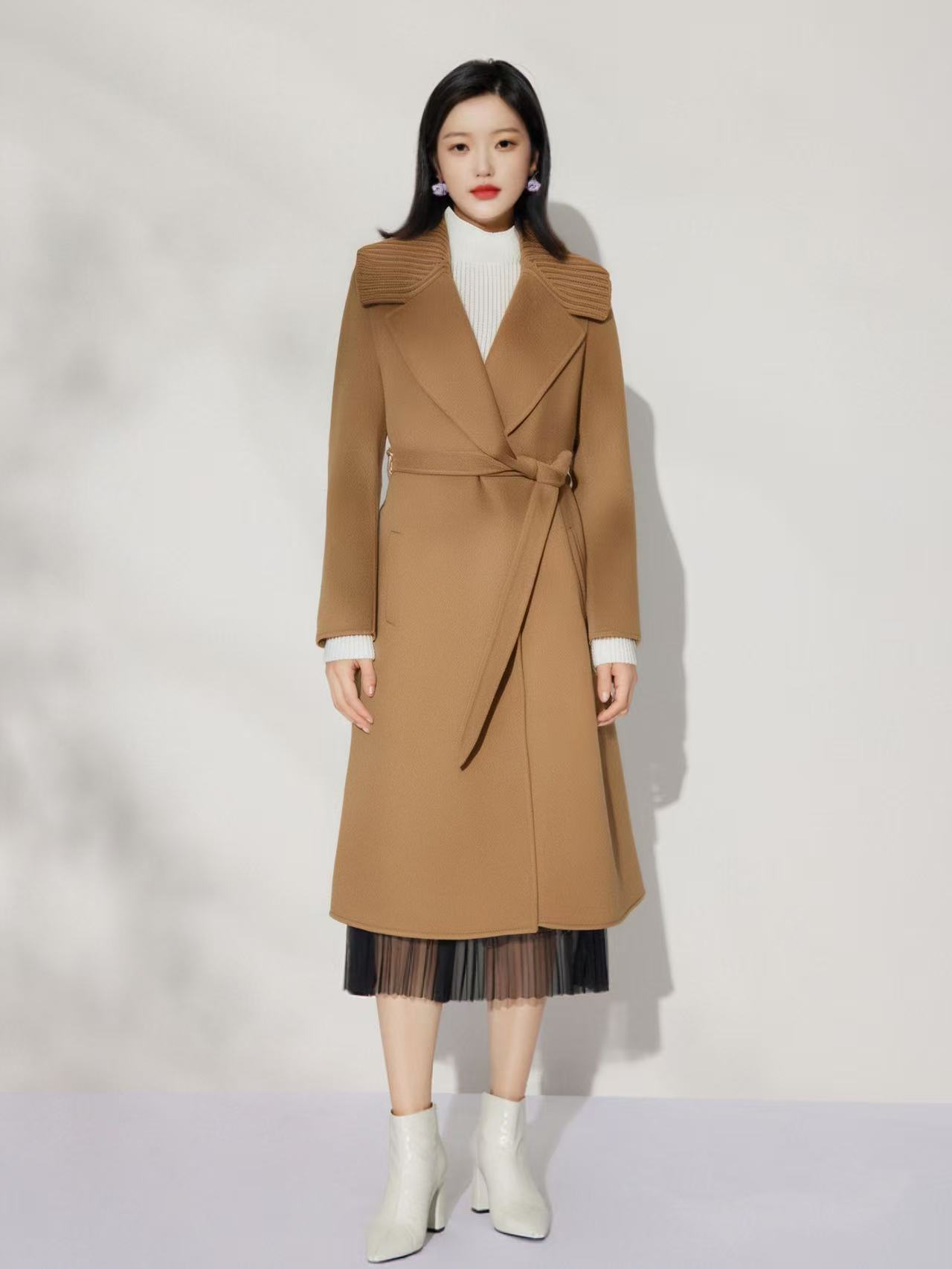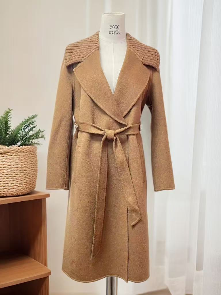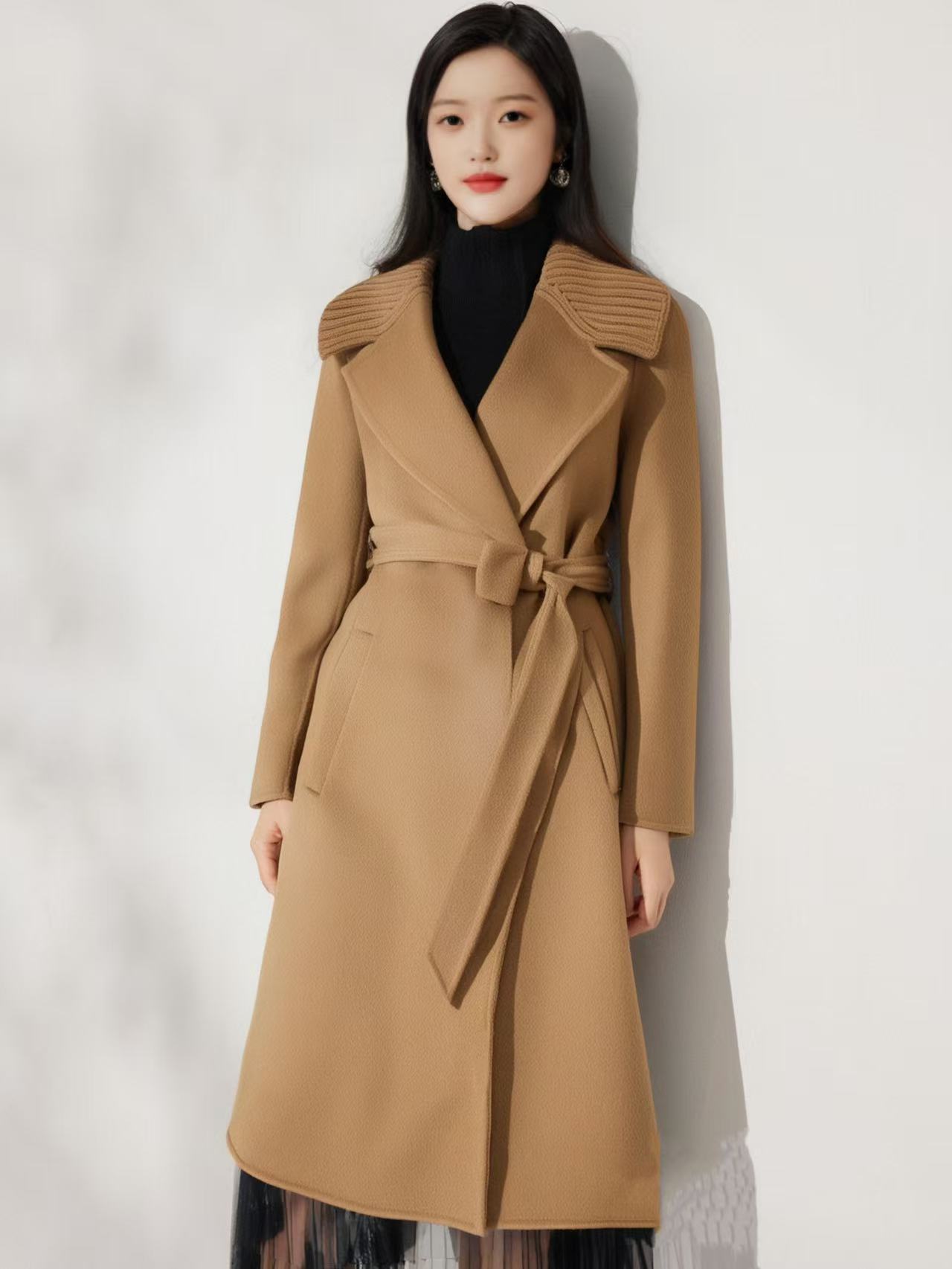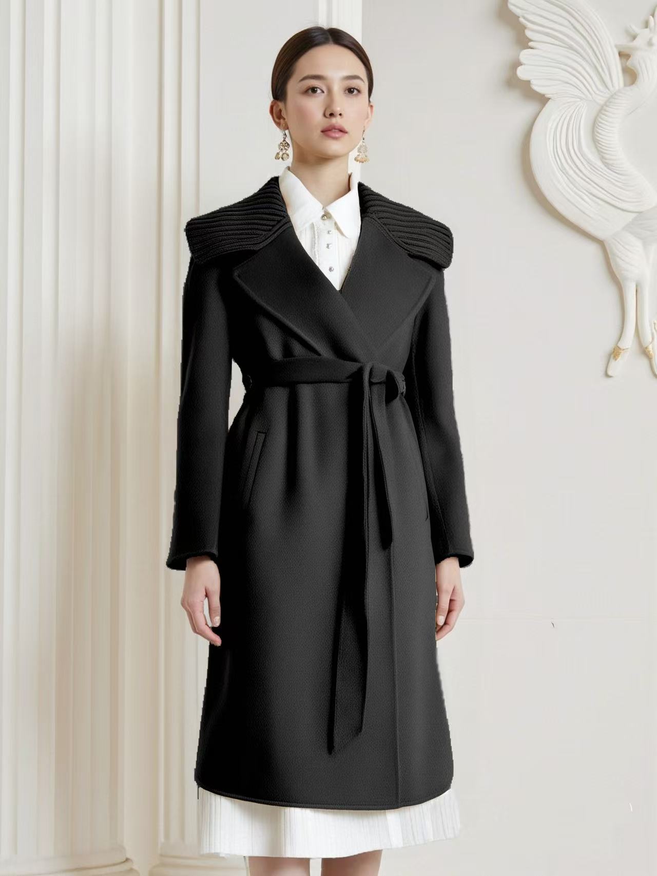 【高端系列】手工定制7365拼针织领100%羊毛系带气质双面尼大衣-喜出