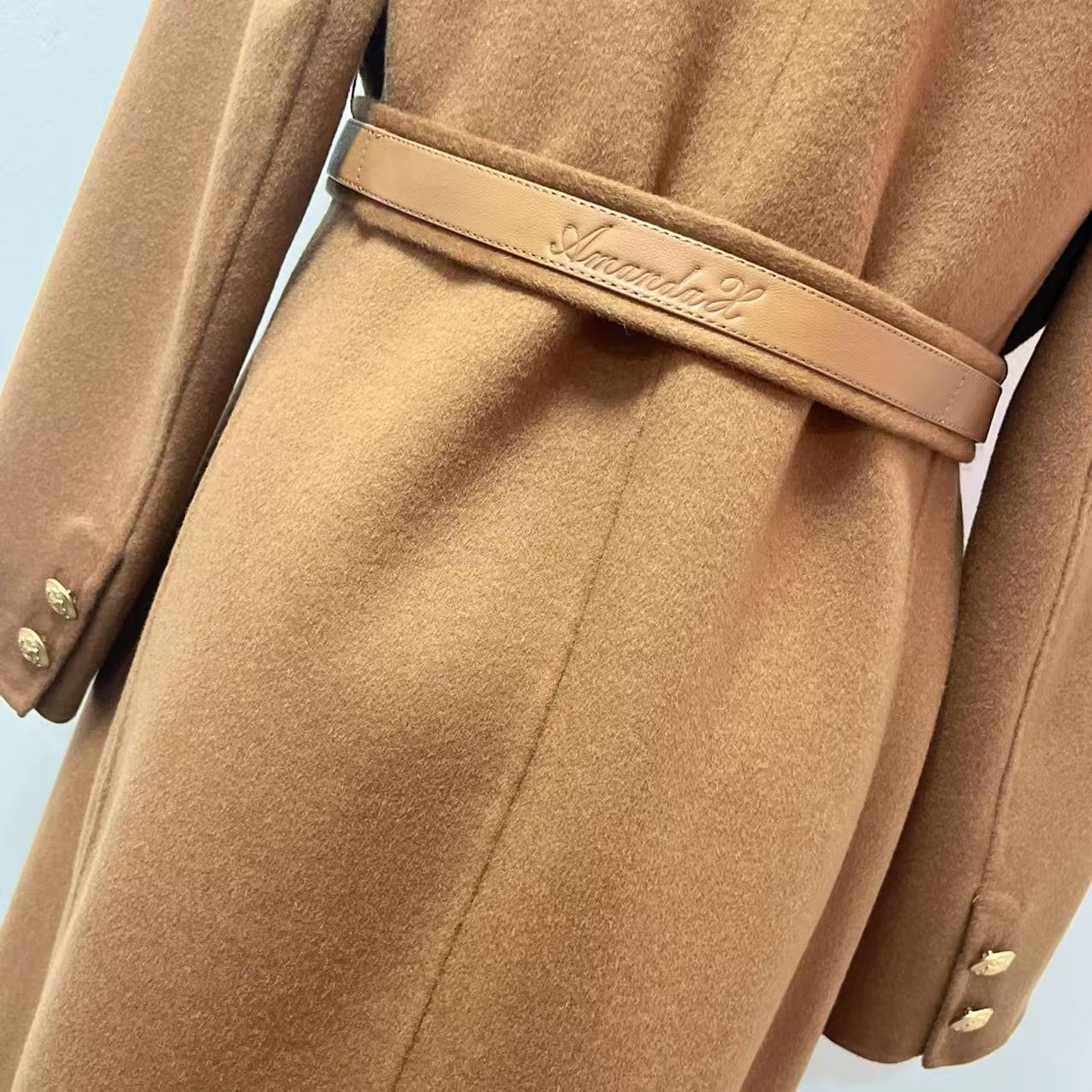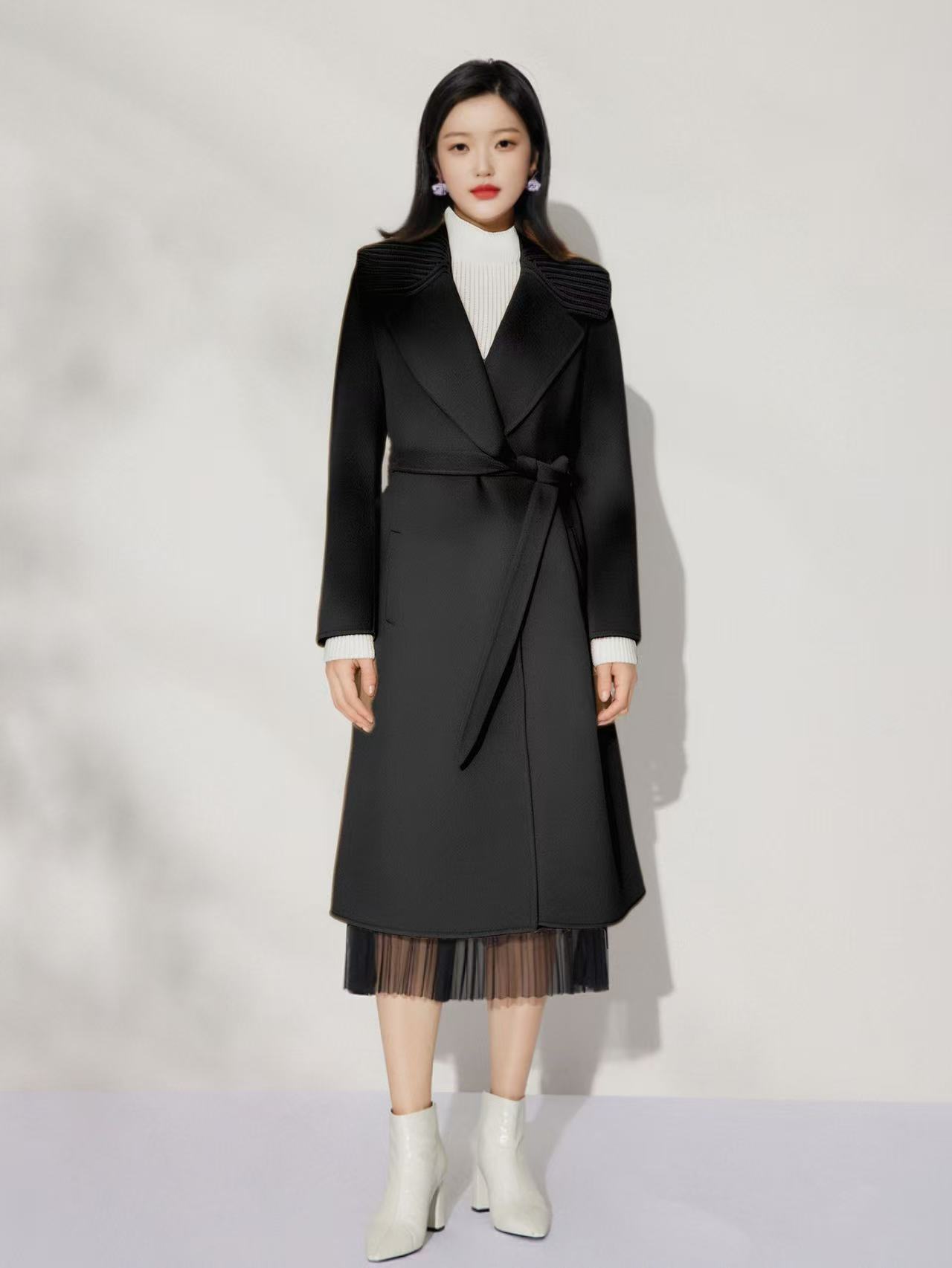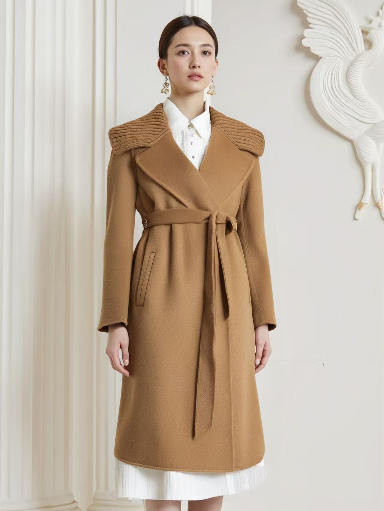 【高端系列】手工定制7365拼针织领100%羊毛系带气质双面尼大衣-喜出