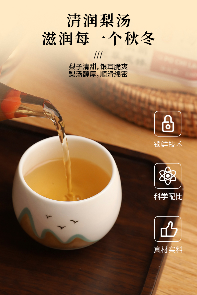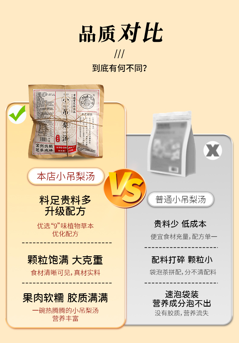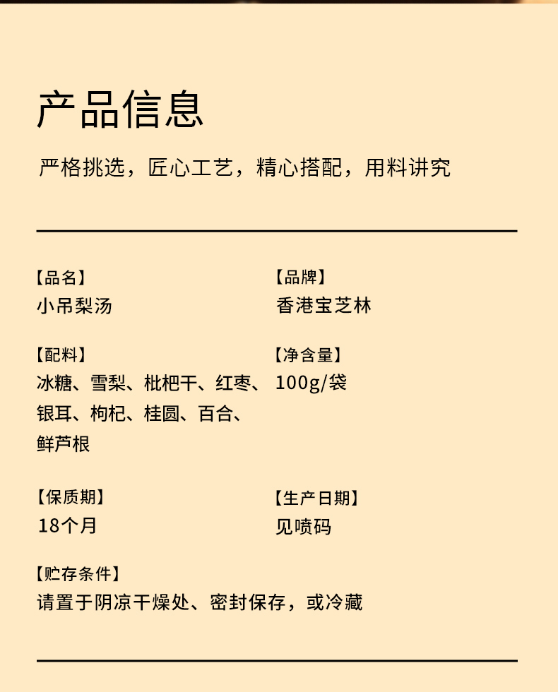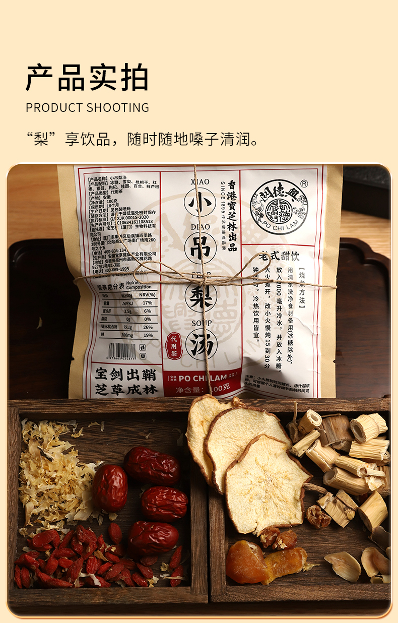 | 【品名】香港宝芝林小吊梨汤 【商标】关德兴 【规格】100g/袋 【保质期】18个月 【配料】冰糖、小枣、枇杷干、干银耳、干梨片、干百合、红糖、枸杞、鲜芦根、食用盐 【储存方法】请在干燥低温处密封保存 【产地】安徽亳州 【发货地】安徽亳州 【发货快递】三通一达 【不发货区域】新疆、西藏、港澳台地区不发 【补邮费地区】内蒙、青海、甘肃、宁夏+15元/件 【发货时效】72小时,周末节假日顺延 【注意事项】孕妇及婴儿不宜食用 |
