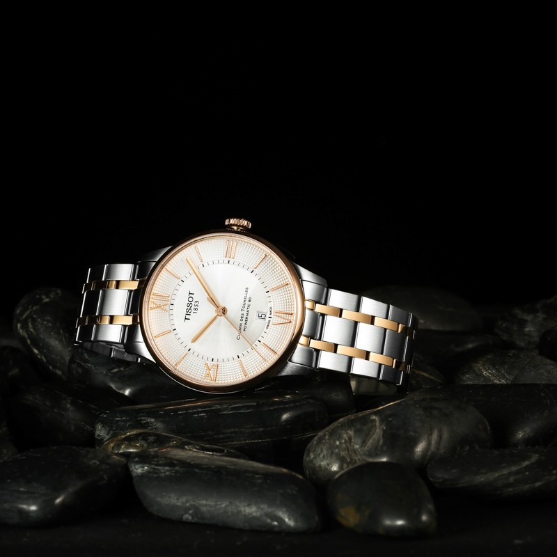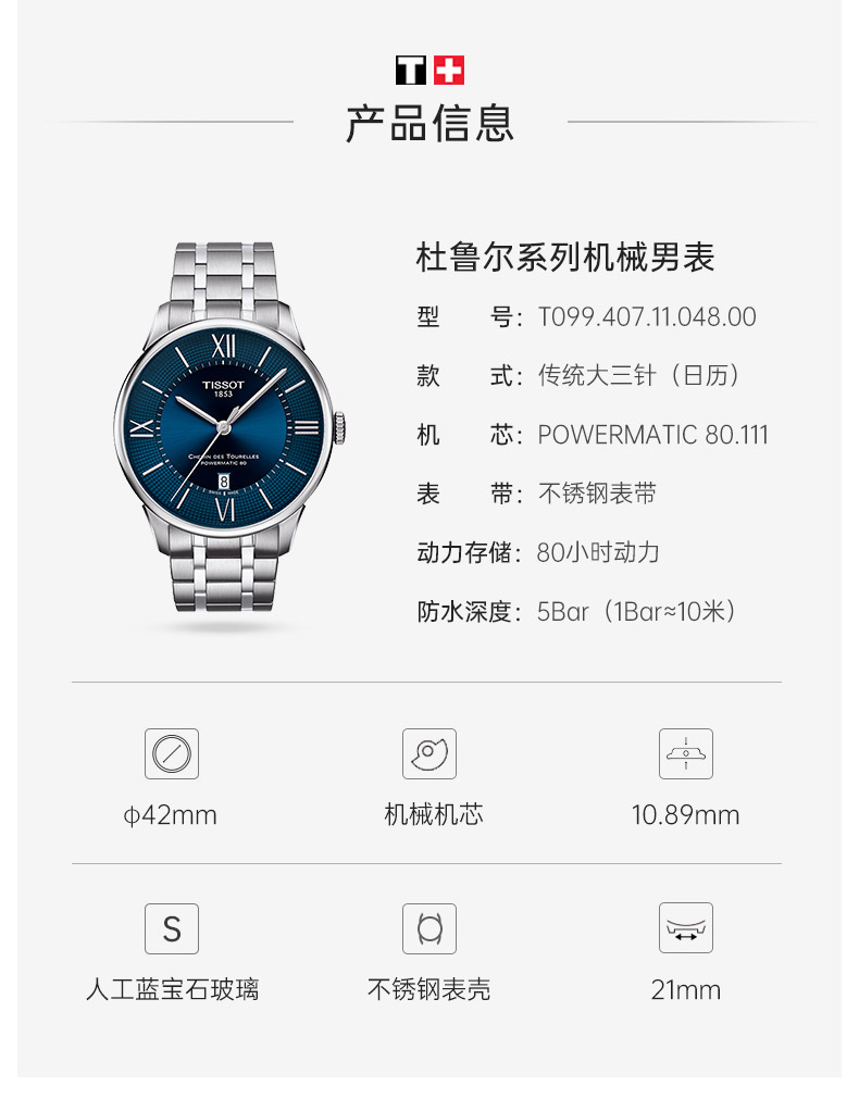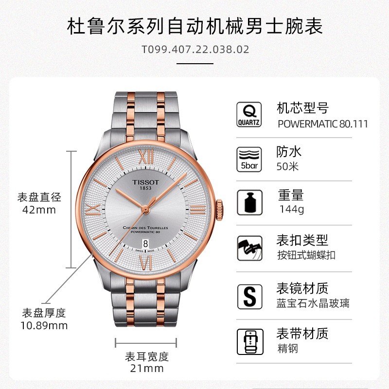 【时计廊】天梭(TISSOT) 瑞士手表 1853杜鲁尔系列80机芯商务自动机械男表 银盘间金钢带T099.407.22.038.02