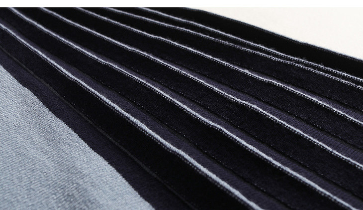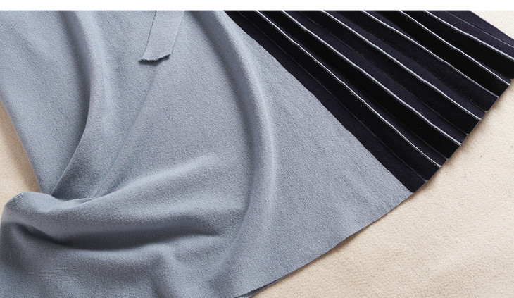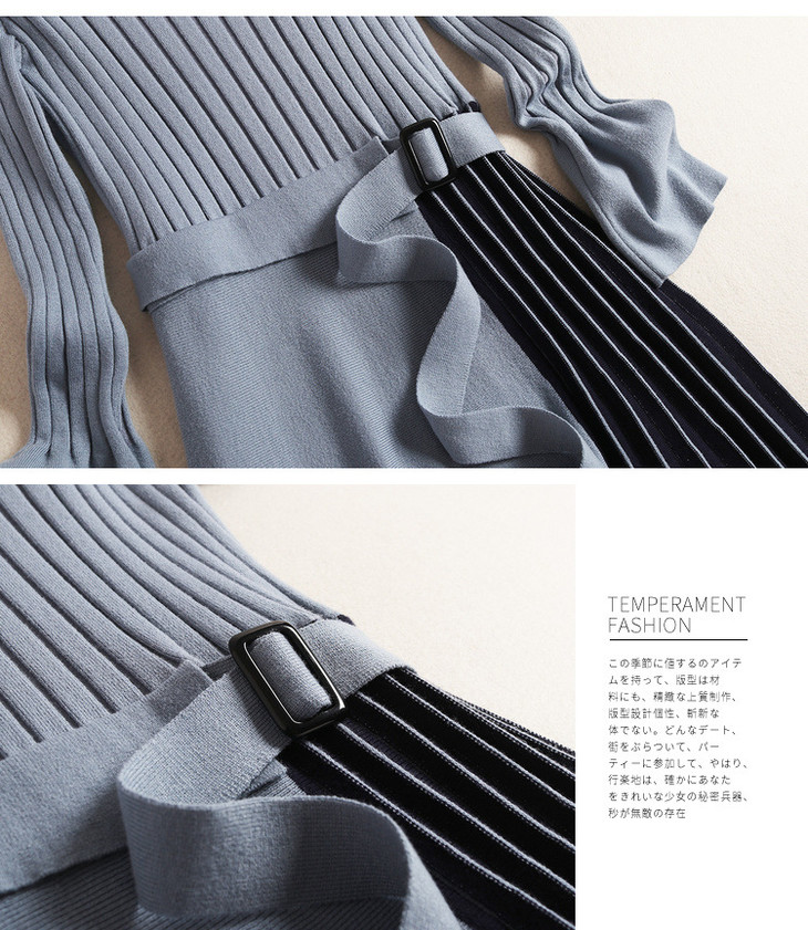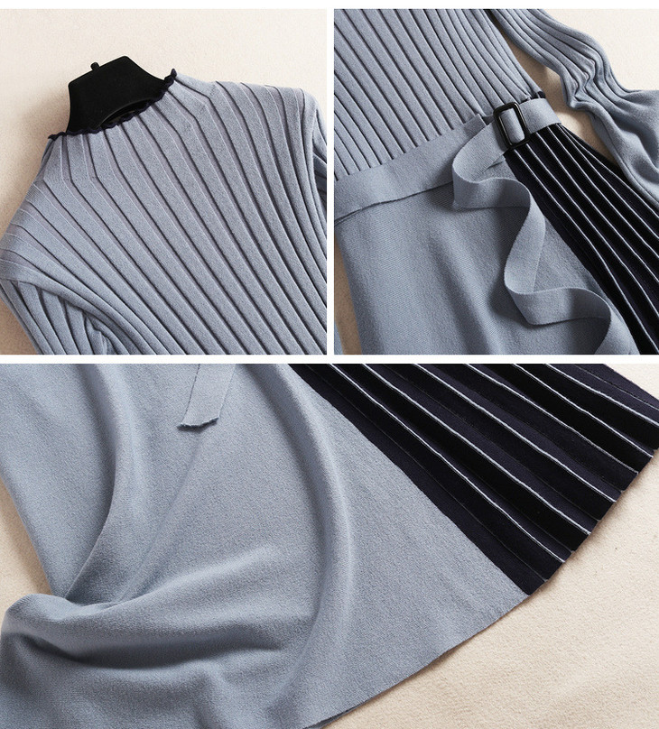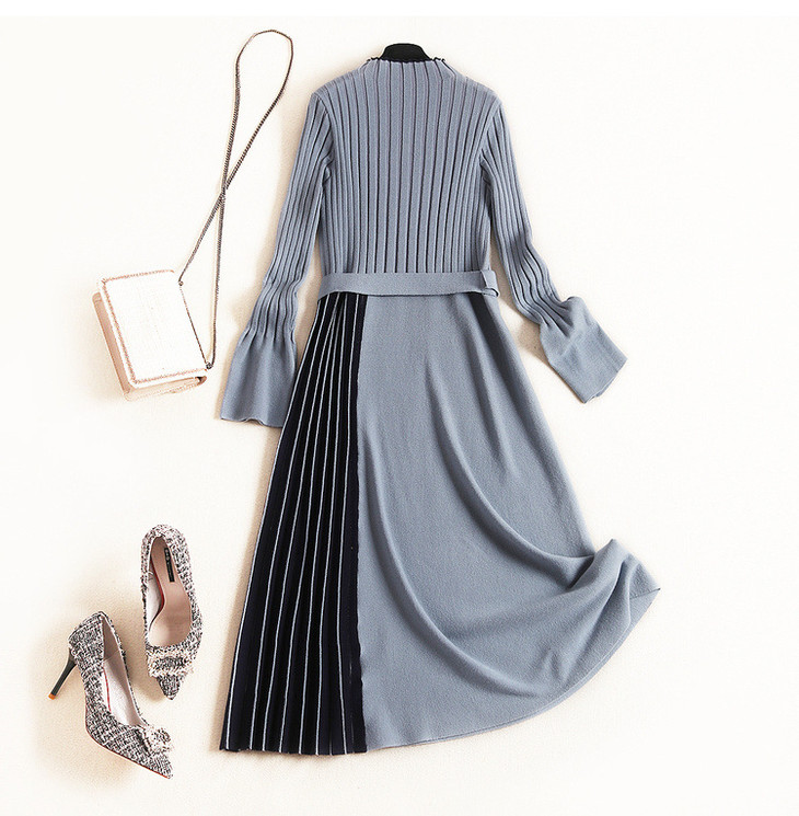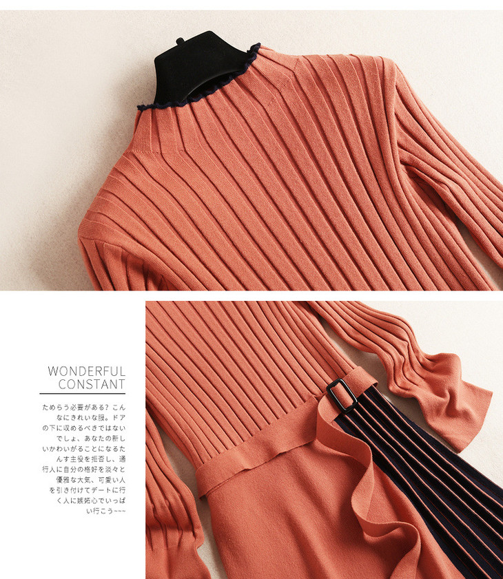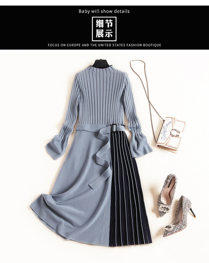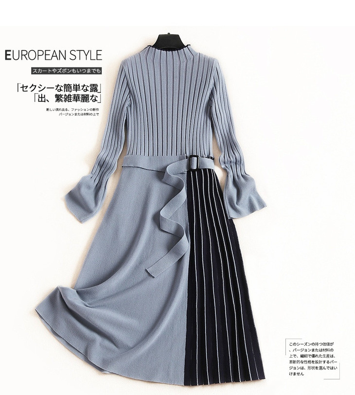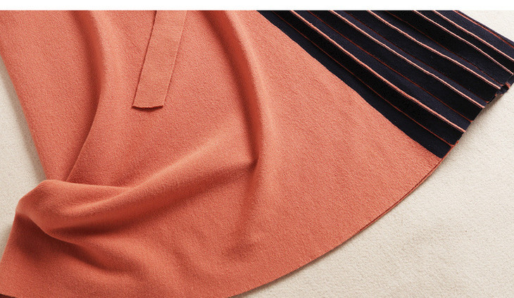 OL-52278秋冬新款半高领喇叭袖拼接条纹A字裙