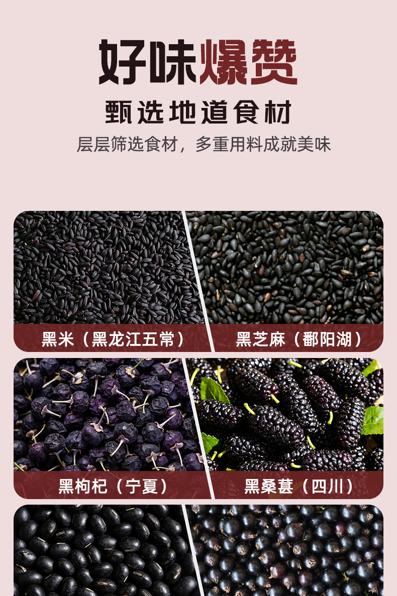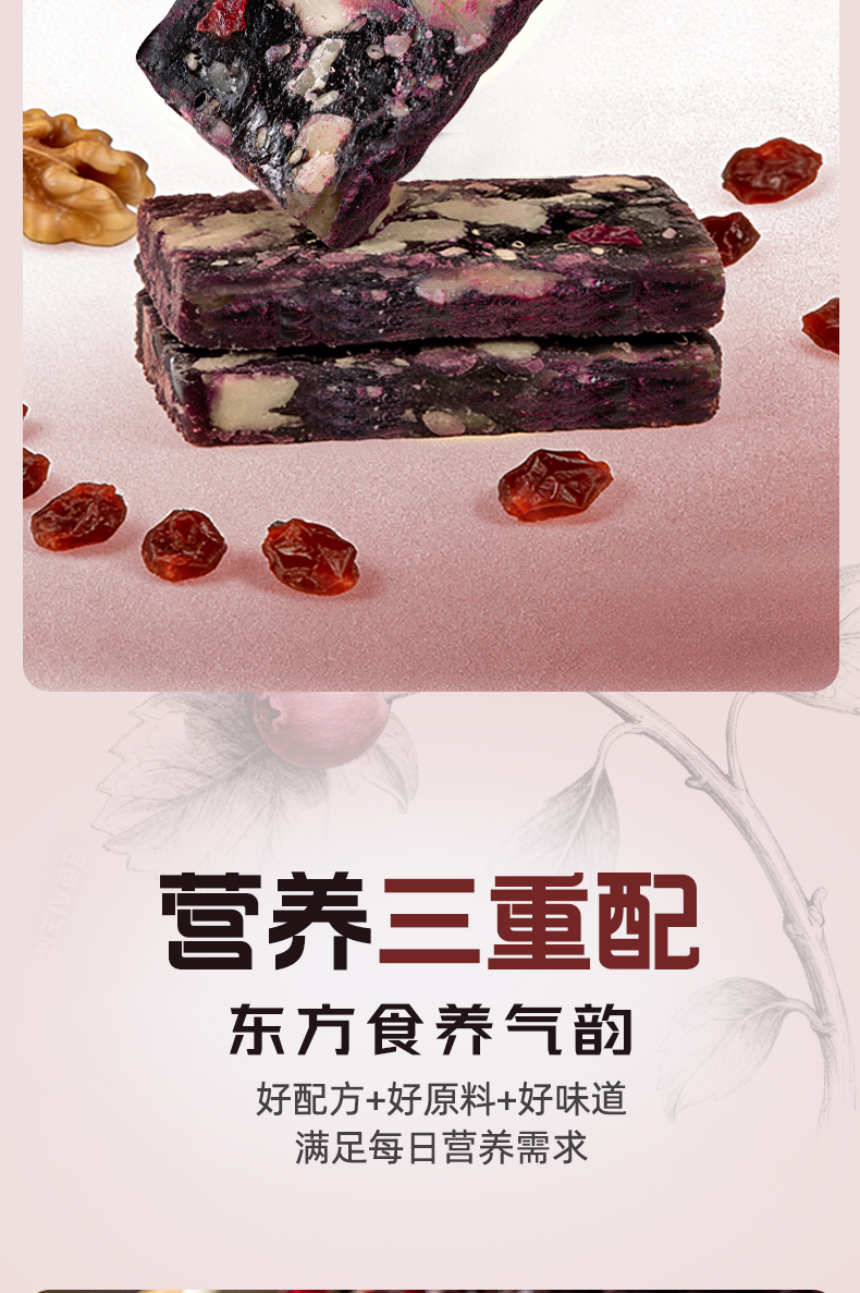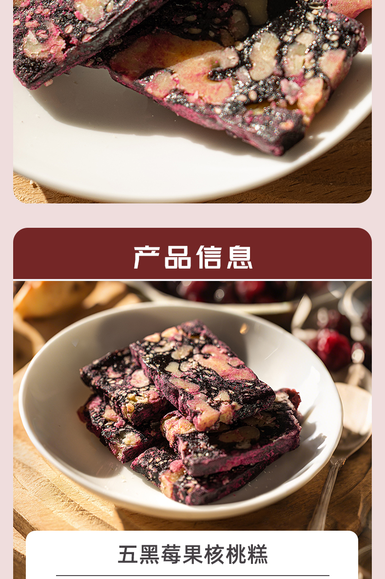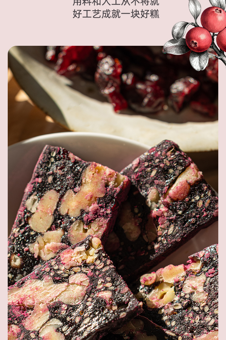 五黑莓果核桃糕以黑养黑,东方食养,气韵好配方 ,9 种食材精准搭配,五黑食材、果干、坚果比例协调,口感绵柔不腻,层次丰富,糯而不粘,入口如云朵般绵柔,轻咬回弹,香糯清甜,唇齿留香