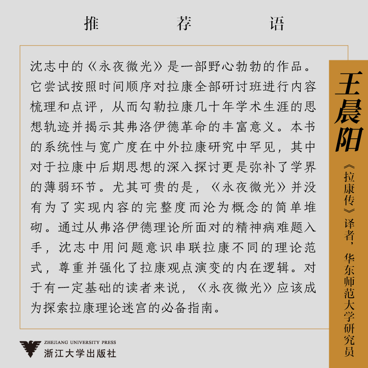 沈志中的《永夜微光》是一部野心勃勃的作品。它尝试按照时间顺序对拉康全部研讨班进行内容梳理和点评,从而勾勒拉康几十年学术生涯的思想轨迹并揭示其弗洛伊德革命的丰富意义。本书的系统性与宽广度在中外拉康研究中罕见,其中对于拉康中后期思想的深入探讨更是弥补了学界的薄弱环节。尤其可贵的是,《永夜微光》并没有为了实现内容的完整度而沦为概念的简单堆砌。通过从弗洛伊德理论所面对的精神病难题入手,沈志中用问题意识串联拉康不同的理论范式,尊重并强化了拉康观点演变的内在逻辑。对于有一定基础的读者来说,《永夜微光》应该成为探索拉康理论迷宫的指南。——王晨阳 ,《拉康传》译者,华东师范大学研究员