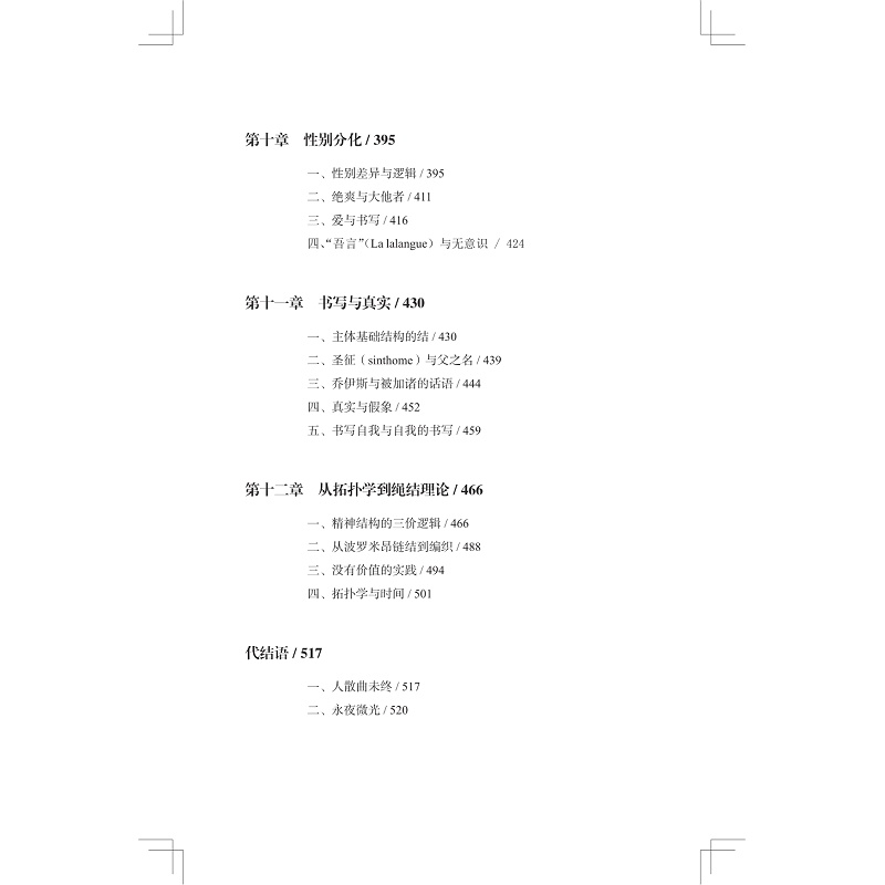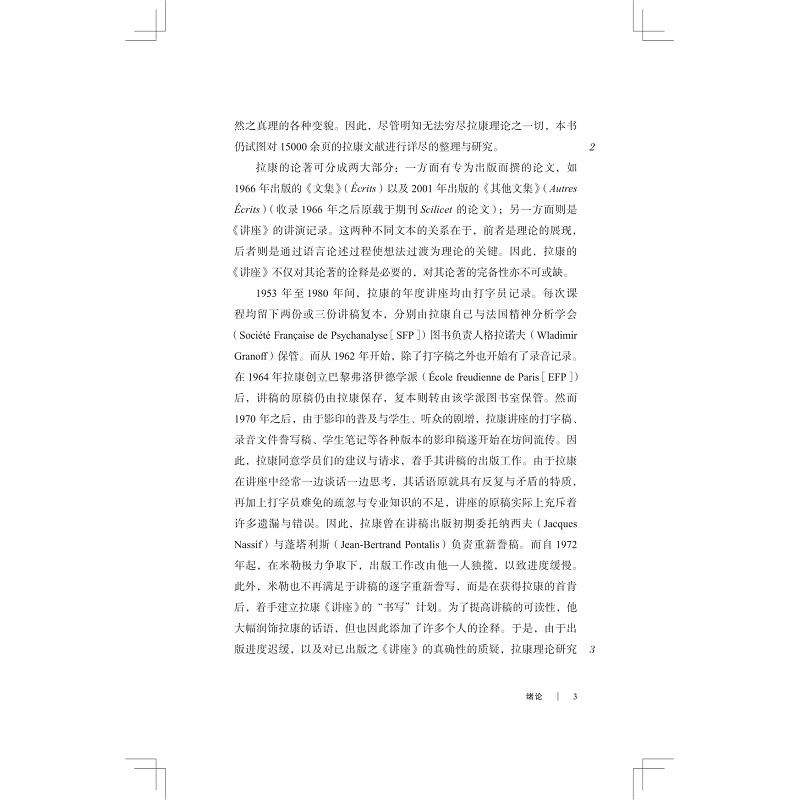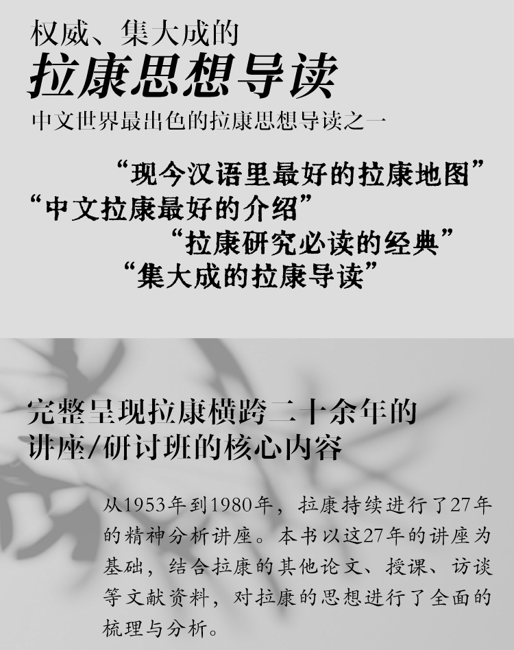 从1953年到1980年,拉康持续进行了27年的精神分析讲座。本书以这27年的讲座为基础,结合拉康的其他论文、授课、访谈等文献资料,对拉康的思想进行了全面的梳理与分析。以弗洛伊德的思想与结构语言学为起点,作者追溯并阐释了拉康历年讲座中的关键概念、论述与观点,这并非为了指出拉康理论的单一历史发展路径,或以既定的理论立场建构一个封闭的拉康思想体系,而是尝试呈现拉康在充满荆棘的知识、欲望与真理之路上的未竟追寻,尝试指出他如何再次去面对弗洛伊德所遭遇的难题,并从弗洛伊德停下脚步的地方重新出发,让精神分析能够成为微弱却持续的星光,指引主体在不确定性中前行。