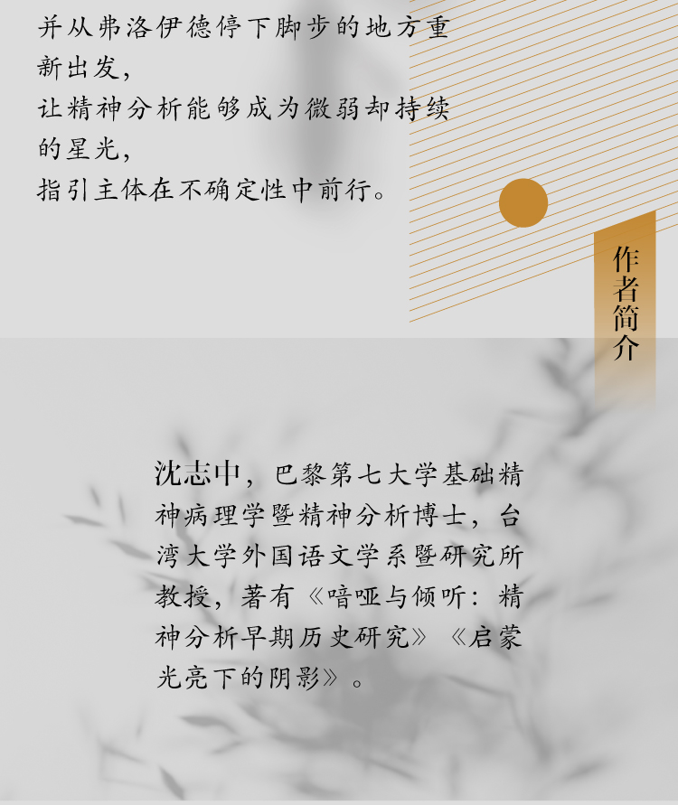 沈志中,巴黎第七大学基础精神病理学暨精神分析博士,台湾大学外国语文学系暨研究所教授,著有《喑哑与倾听:精神分析早期历史研究》《启蒙光亮下的阴影》。