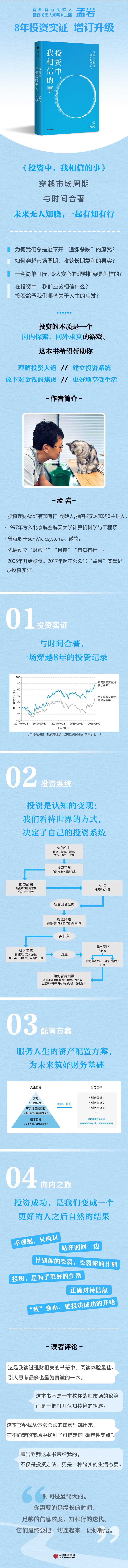 投资,从不止于金钱的博弈,其本质是一场向内探索、向外求真的游戏。这本书凝结了作者孟岩8年投资实证的经验与思考,是一份穿越周期,与时间合著的信念之书。它不追逐短期利益,不提供稳赚秘籍,只回归投资的本质,探寻那些永恒、普适的道理,让财富增长成为认知与心性成长的自然结果。