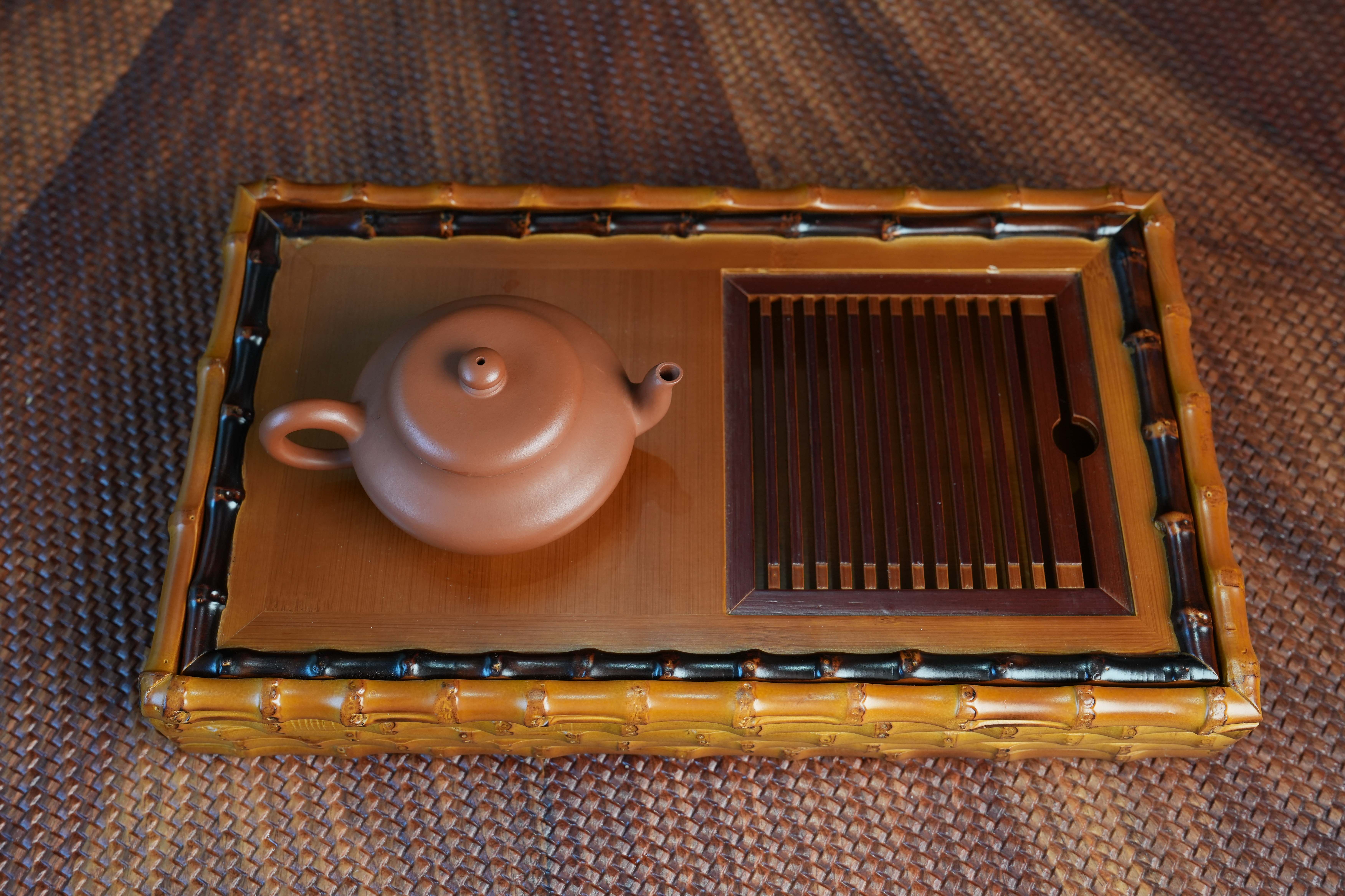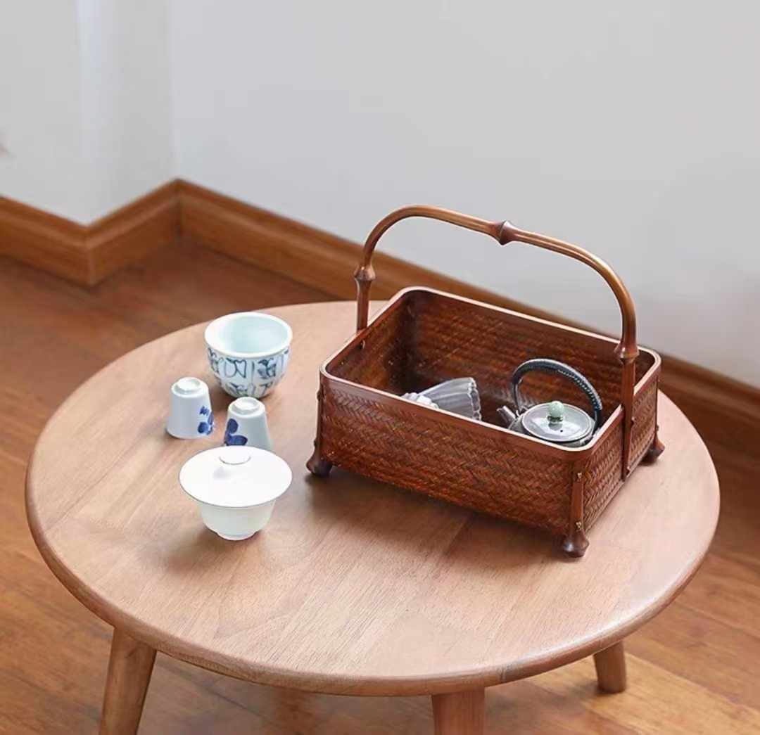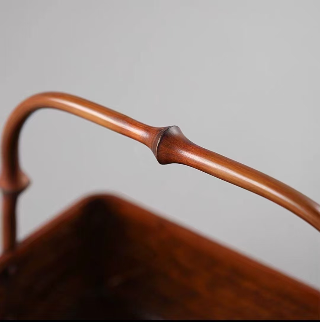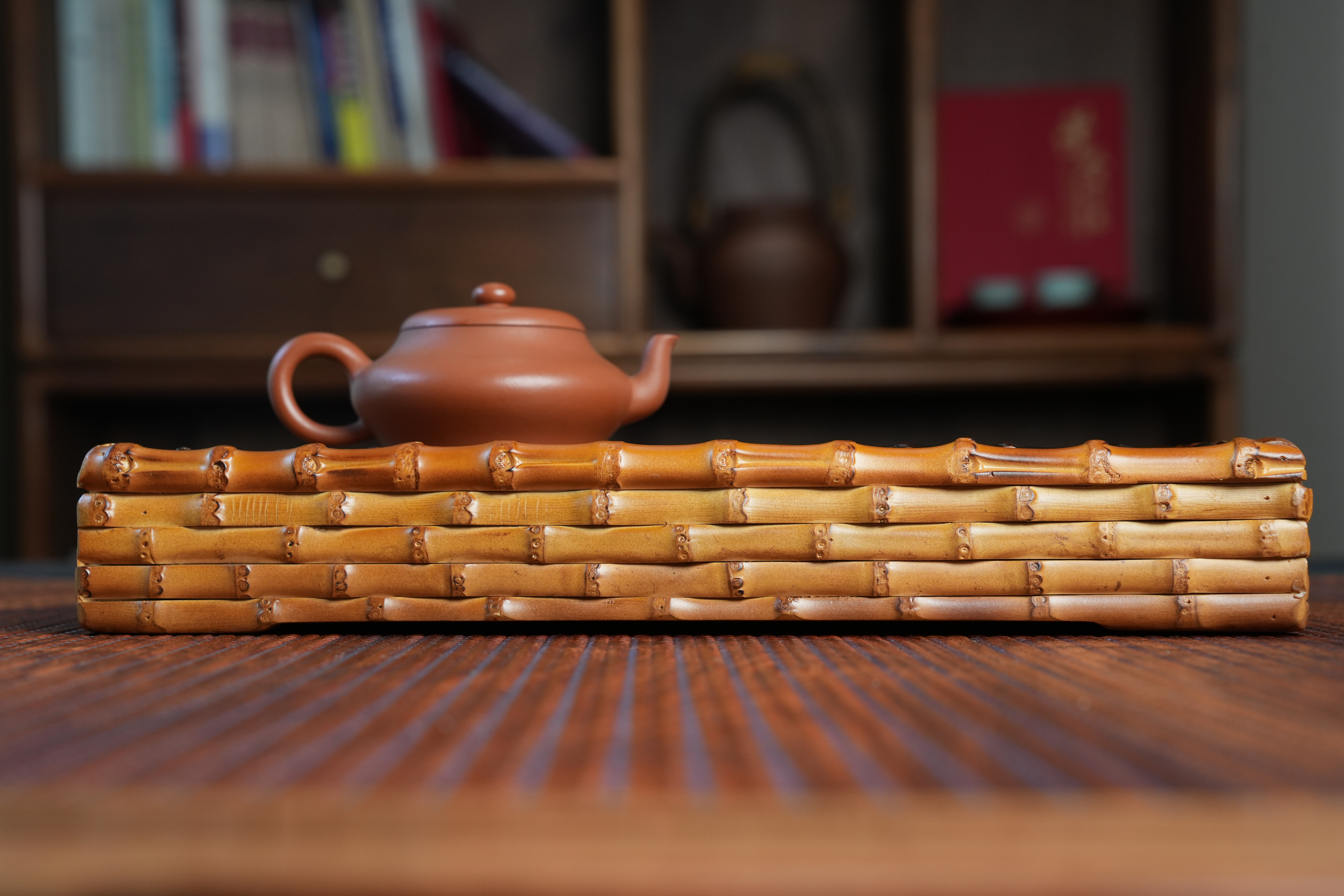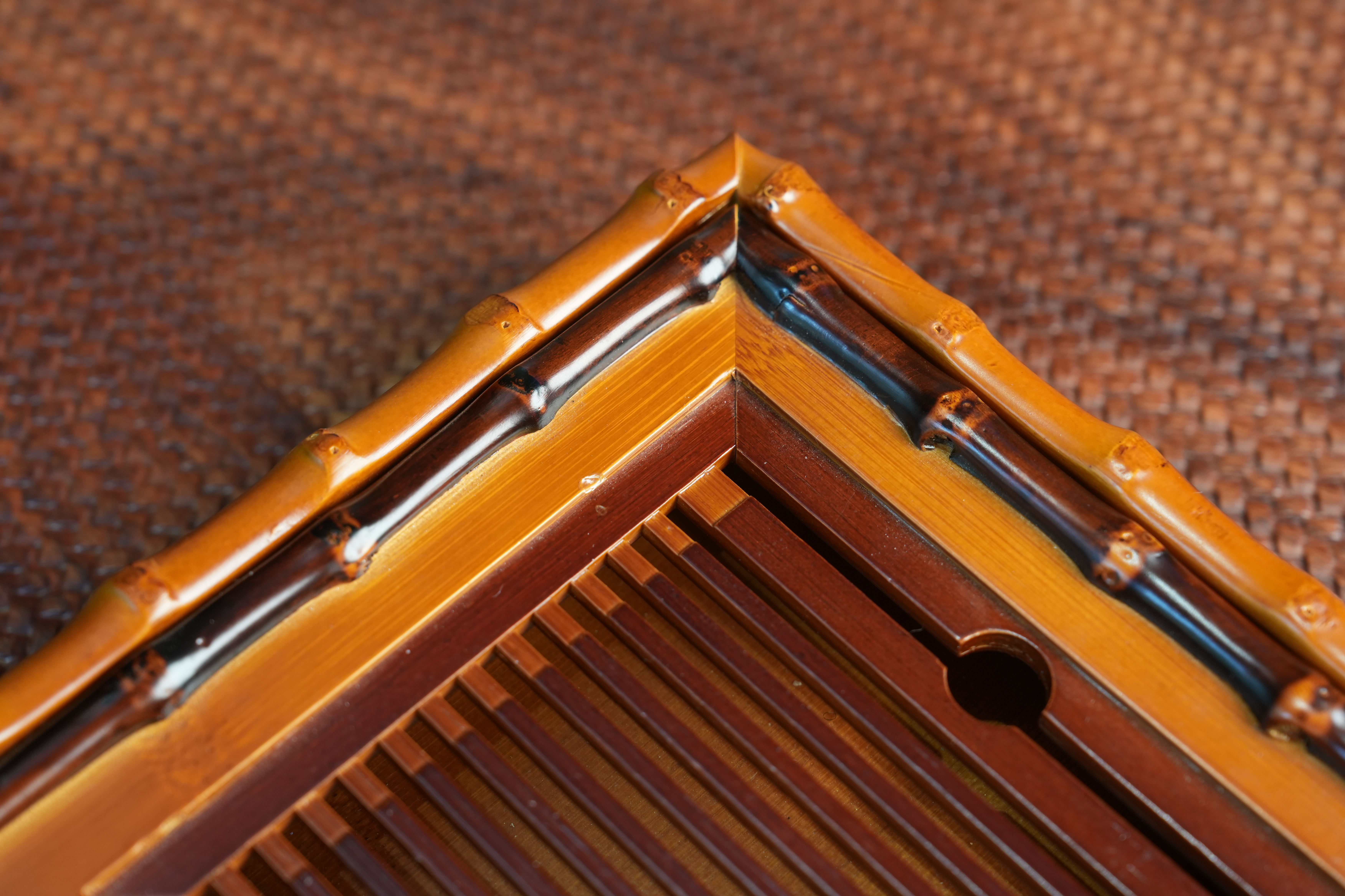 传统四方结构,方方典雅,大漆带来华贵质感,不管是生活中使用还是茶道都很适宜,保养得当,时间久了竹鞭部分会变成枣红色。