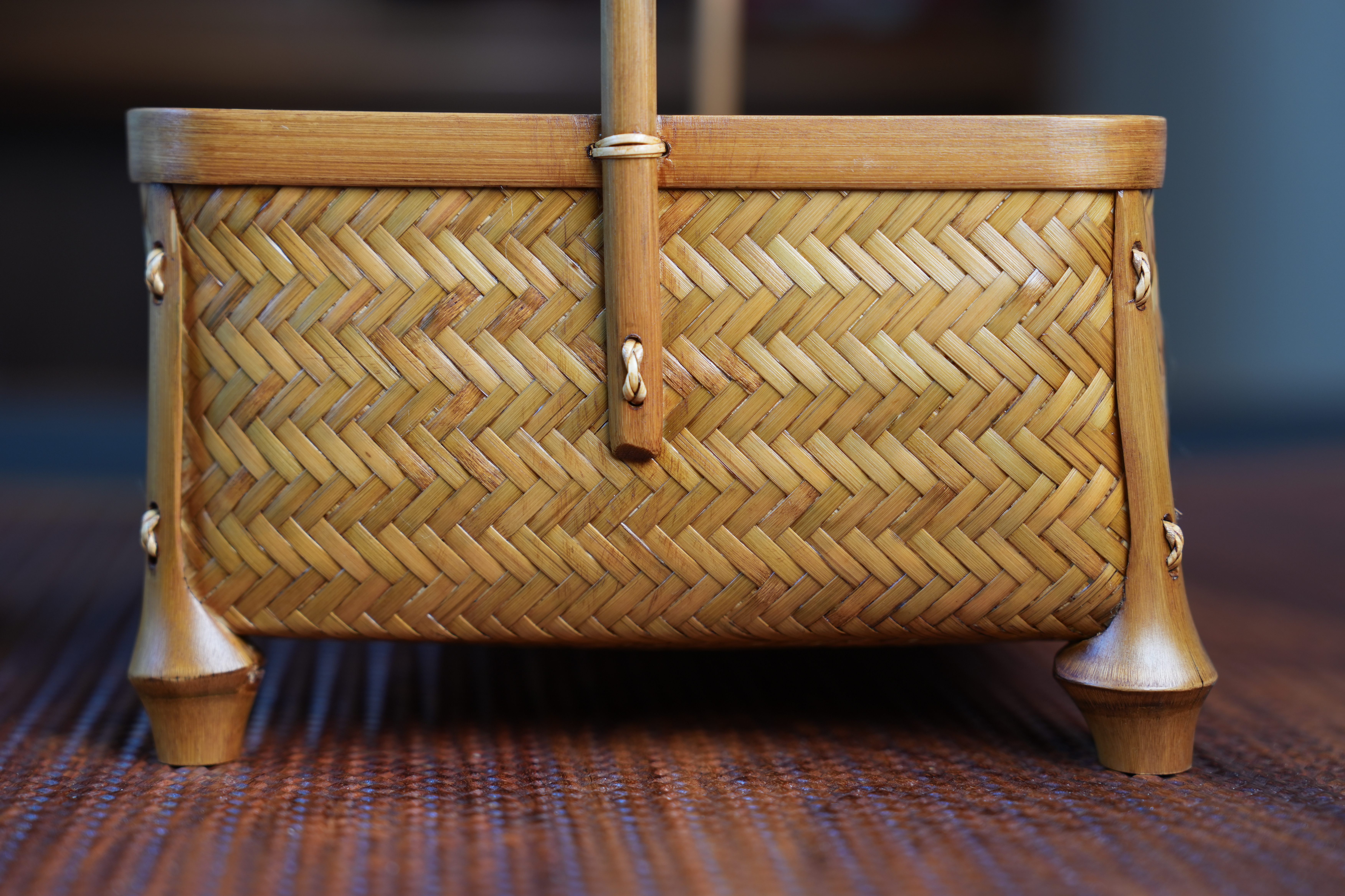 使用大漆覆盖,筇竹提手保留竹节,自然韵味。