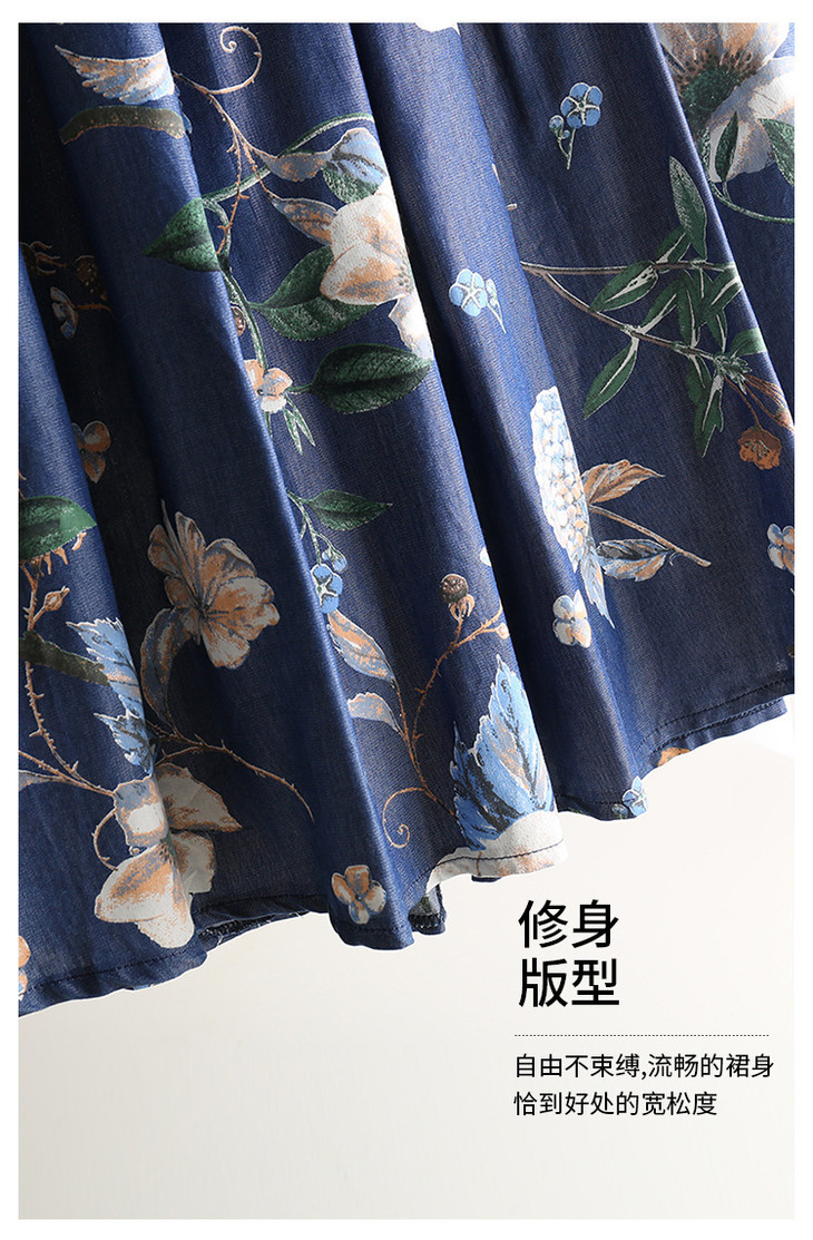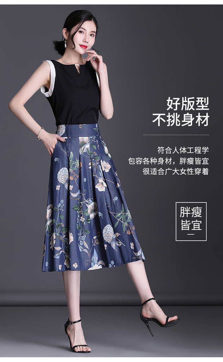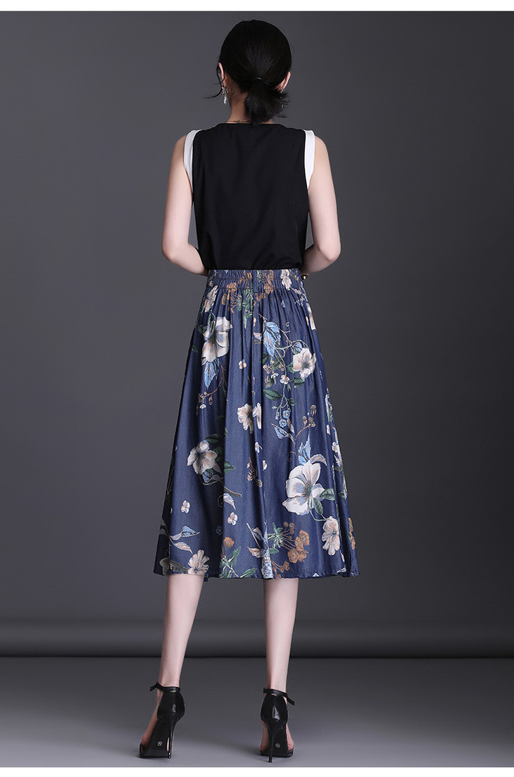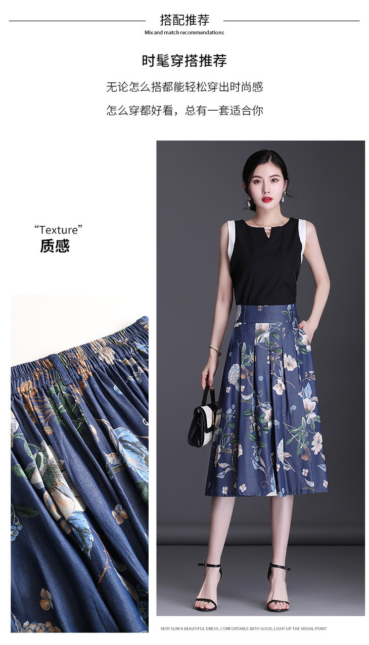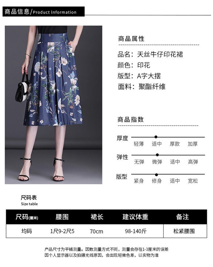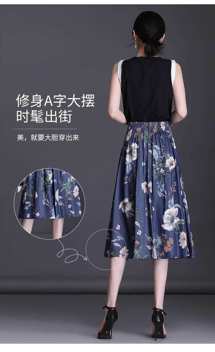 TY3088 天丝牛仔半身裙松紧腰印花夏季新款气质大摆a字中长裙
