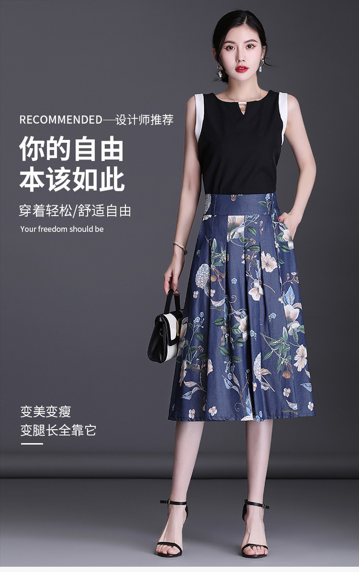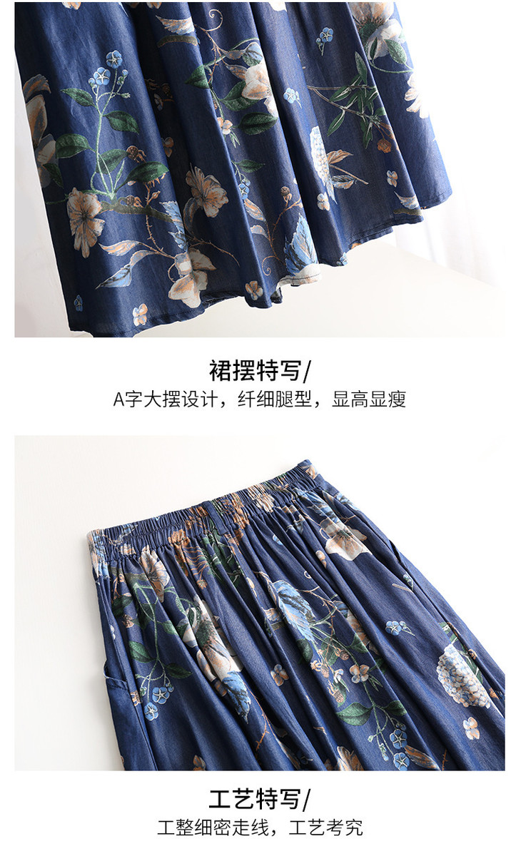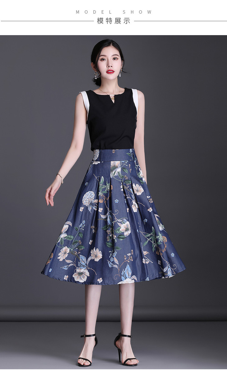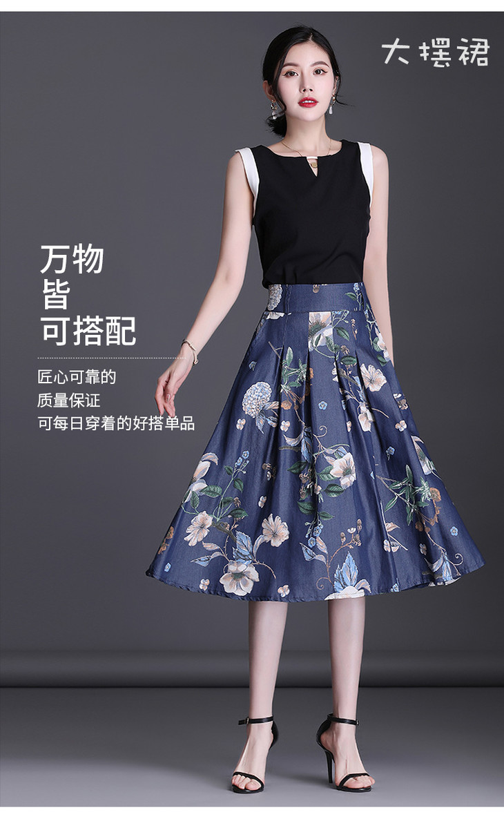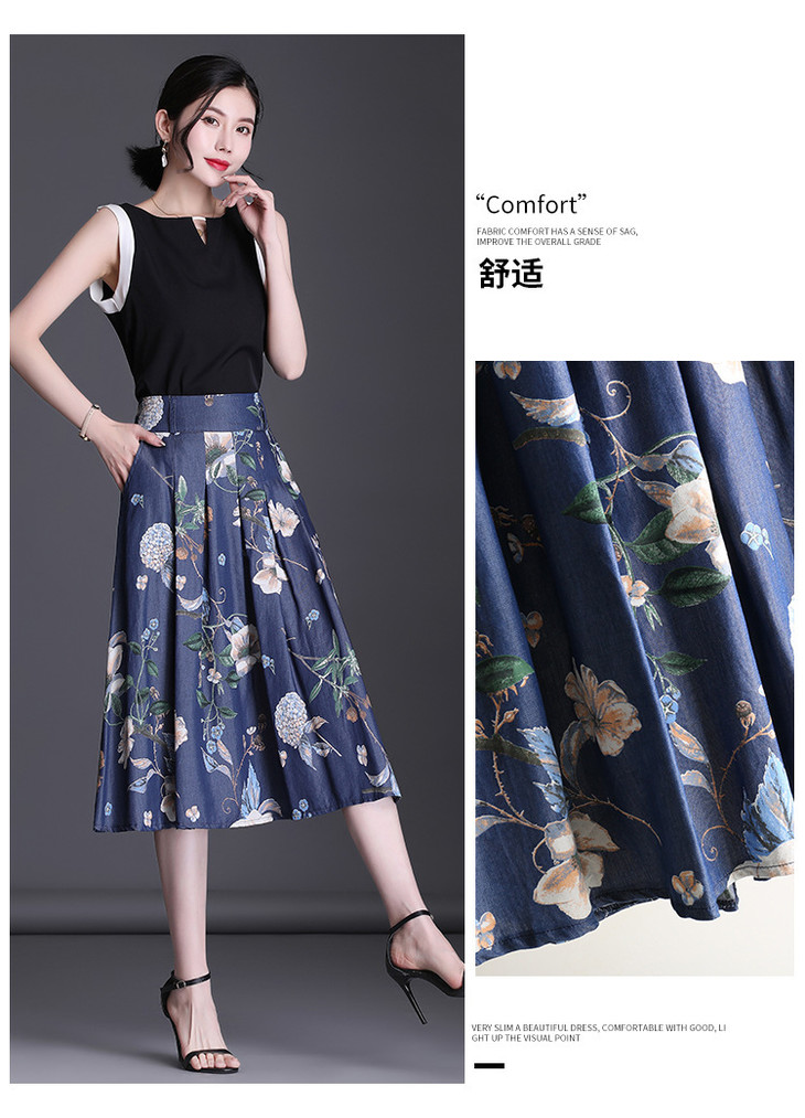 TY3088 天丝牛仔半身裙松紧腰印花夏季新款气质大摆a字中长裙