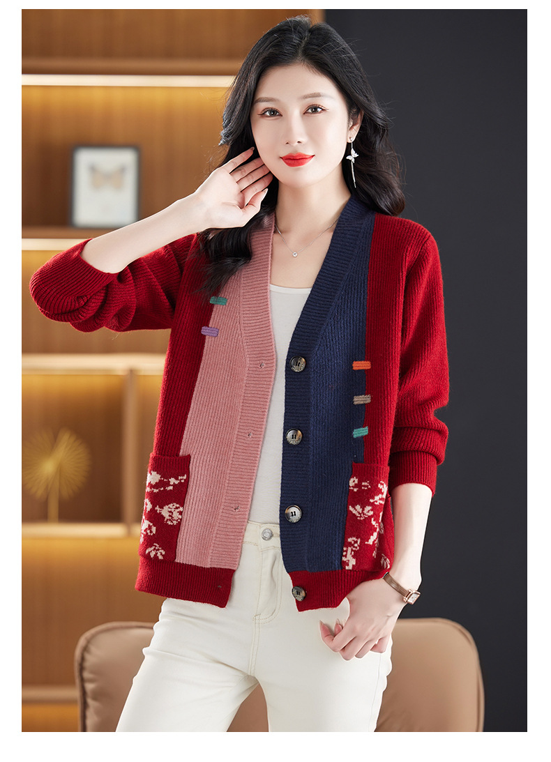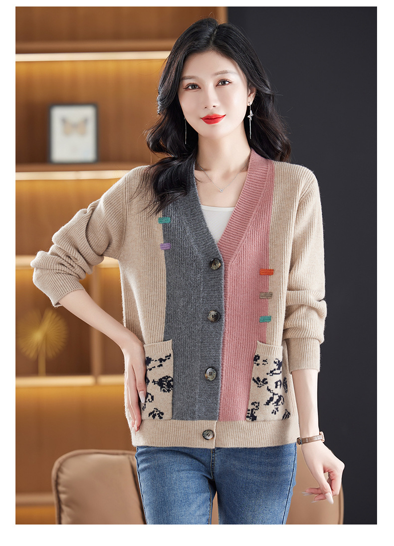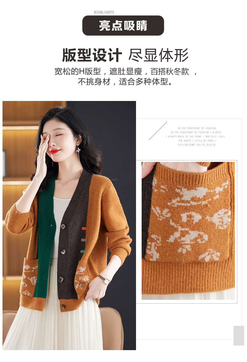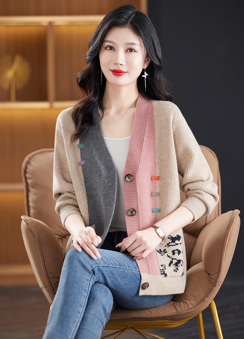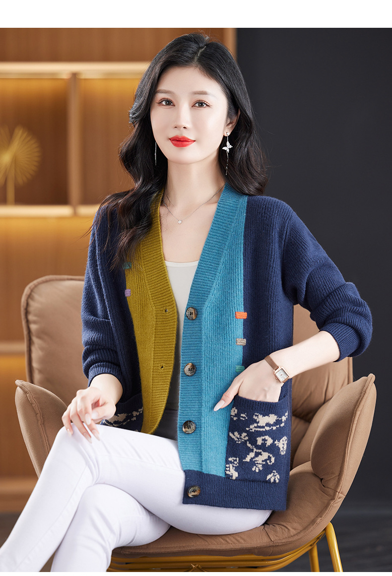 CC-17-5718秋冬新款宽松复古拼接外搭上衣宽松休闲撞色V领针织外套上衣