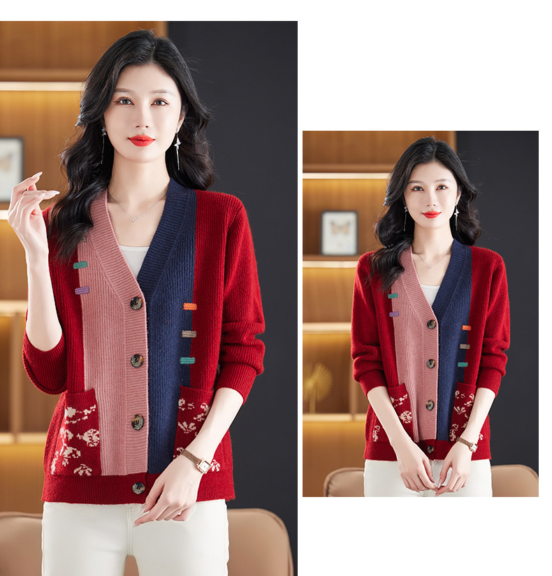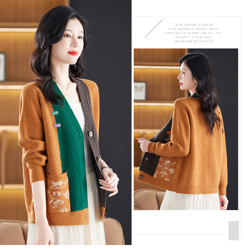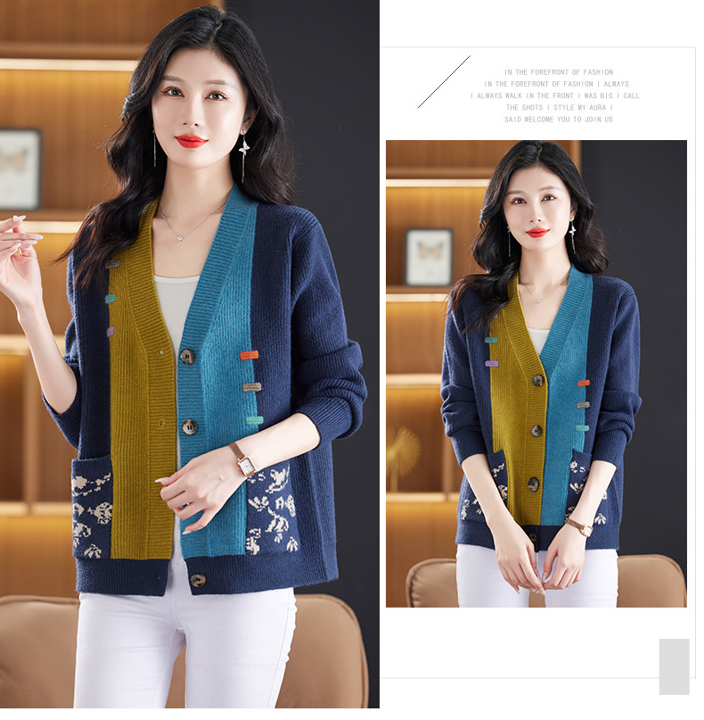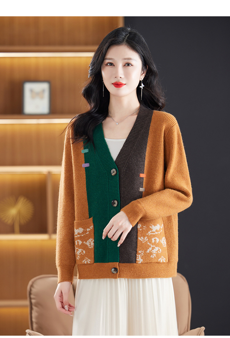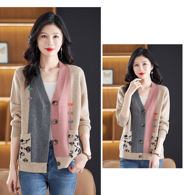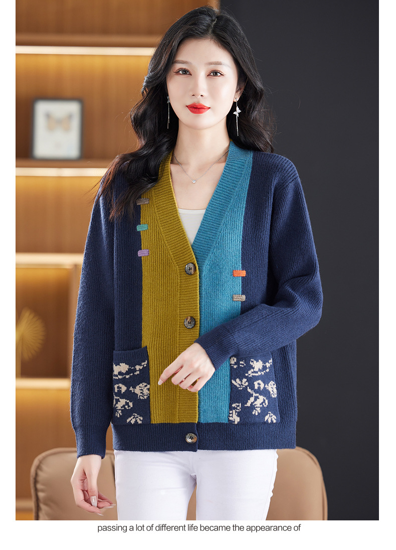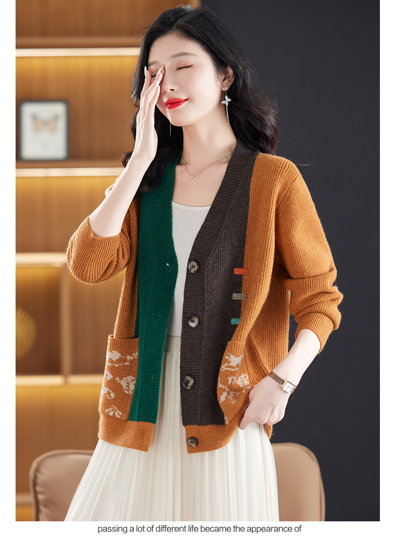 CC-17-5718秋冬新款宽松复古拼接外搭上衣宽松休闲撞色V领针织外套上衣