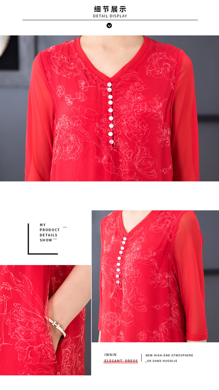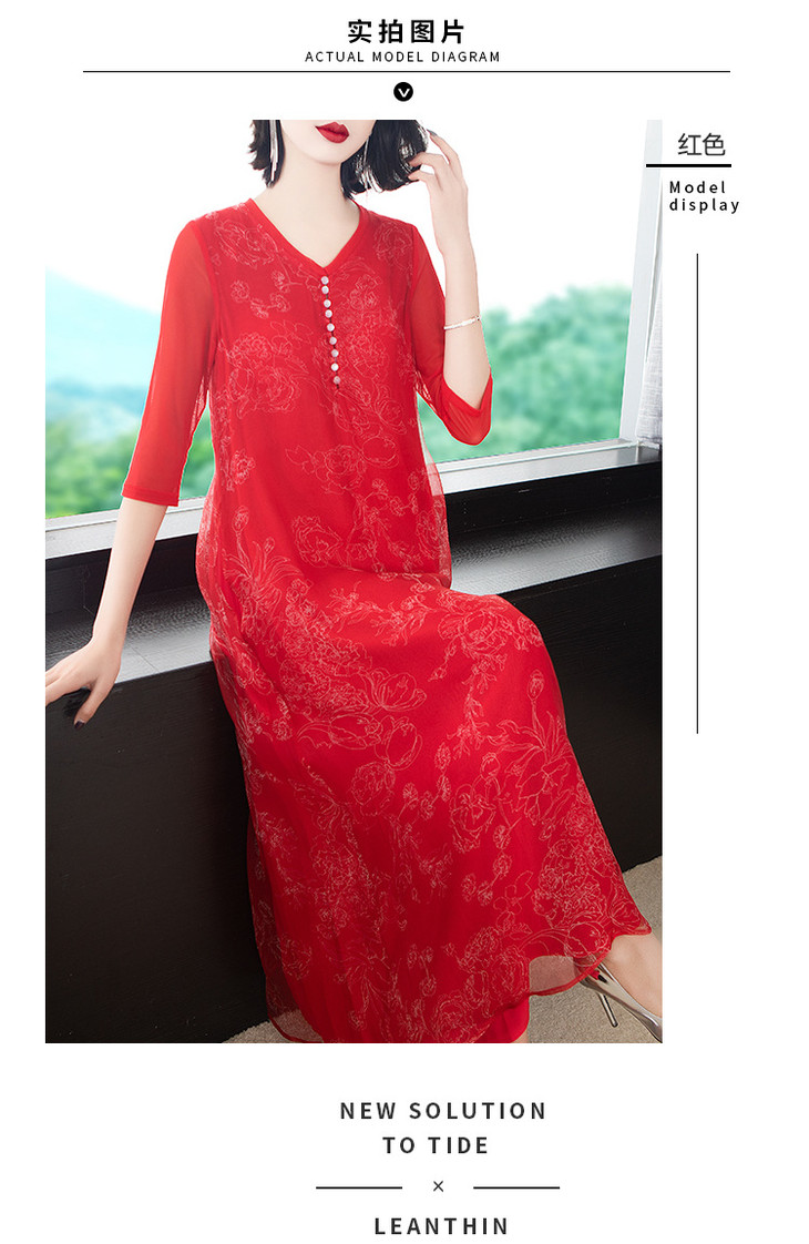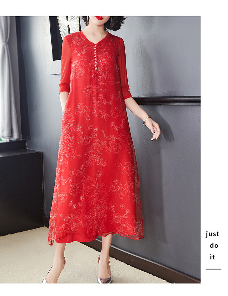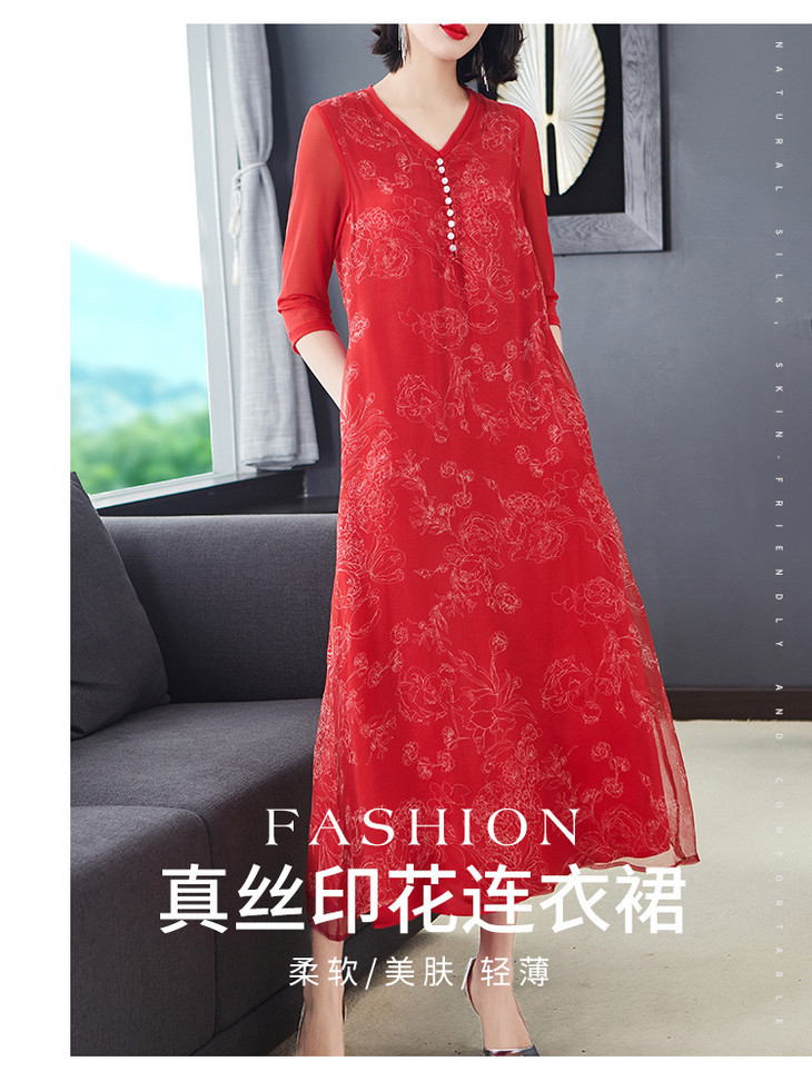 NYT-9903新款宽松大码V领印花真丝欧根纱连衣裙 TZW