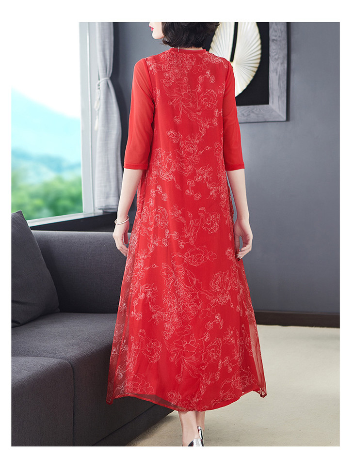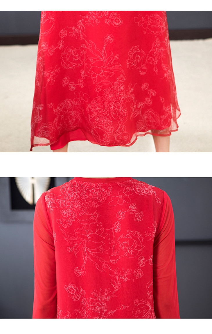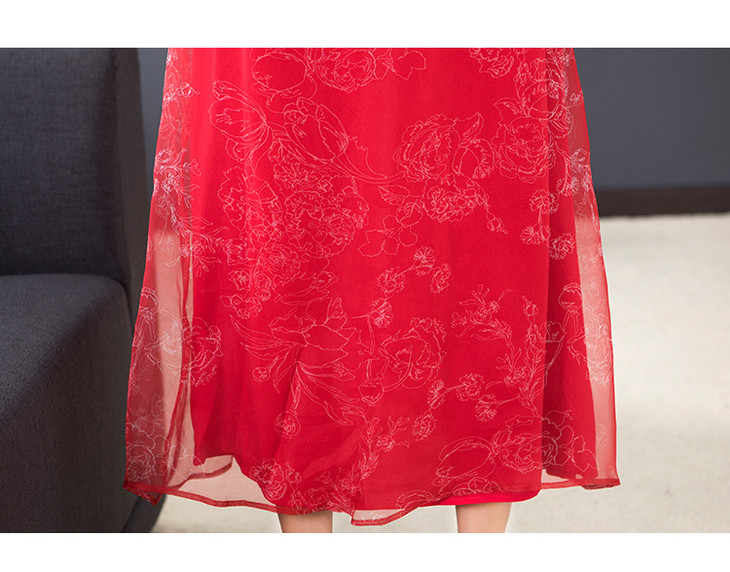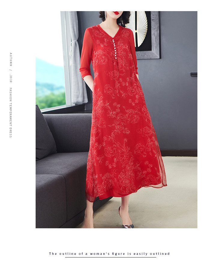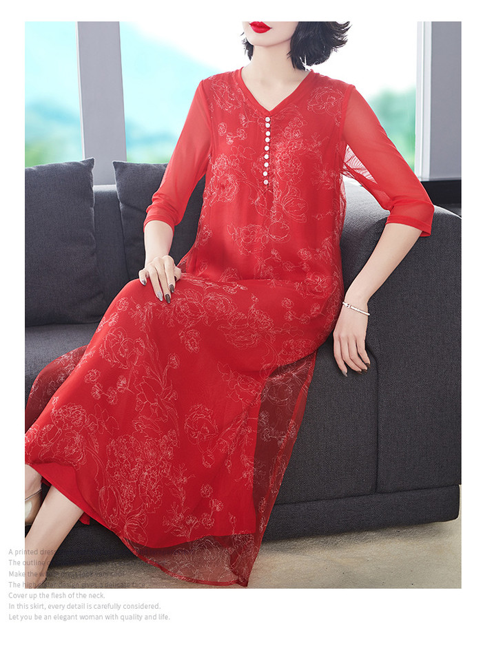 NYT-9903新款宽松大码V领印花真丝欧根纱连衣裙 TZW