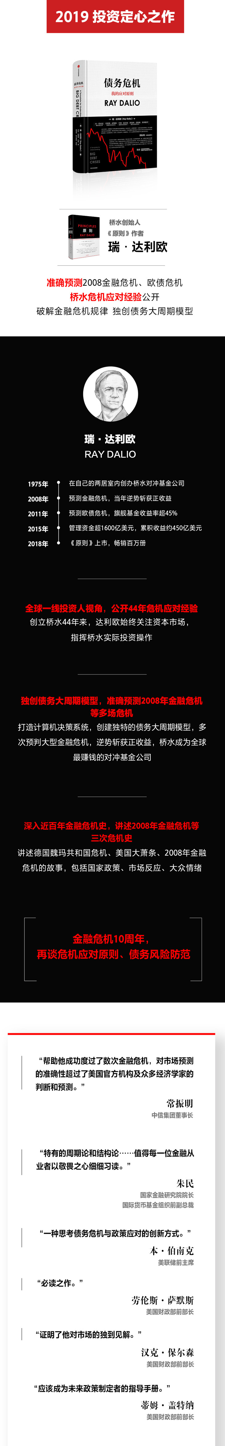 在2008年金融危机爆发10周年之际,全球一线投资者之一瑞·达利欧公开了他独到的债务危机应对原则。这些原则可以解释债务危机的发生机制,以及妥善应对危机应该遵守的原则。凭借这些原则,桥水在其他机构受困于危机的情况下,得以准确预见事态发展,并安然度过危机。