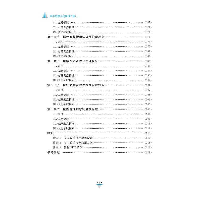 教材共分三大部分,第一部分为医学伦理与法规基础,如医学伦理学与卫生法规概述等,仅作简明扼要介绍。第二部分是与医药卫生人员活动相关的法规及伦理规范,是本教材的重点,从概述、法规精髓、伦理精髓、执业考试提示等四个方面进行编写。第三部分为附录,包括教学设计及各专业教学内容选用方案,便于不同专业教学选用。坚持以医药卫生人员执业岗位需求及医学伦理与法规最新课程标准为编写原则,重点对医药卫生人员活动相关的法律法规及精髓、案例分析等进行更新修订,吸收医药卫生法律法规建设发展的最新成果和要求。