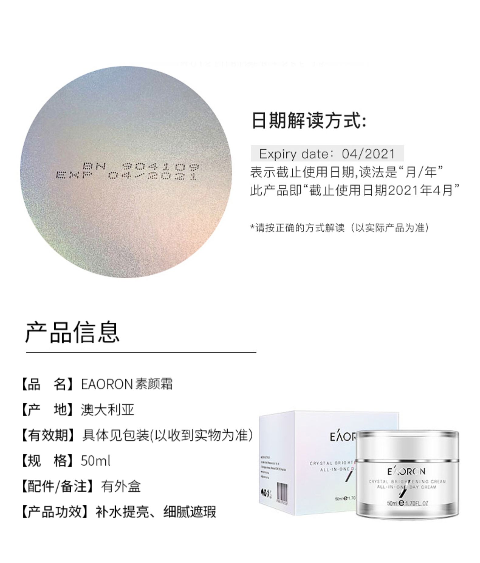 品名:澳洲原装进口Eaoron素颜霜滋润保湿亮肤自然裸妆 细腻遮瑕懒人霜50ml/罐