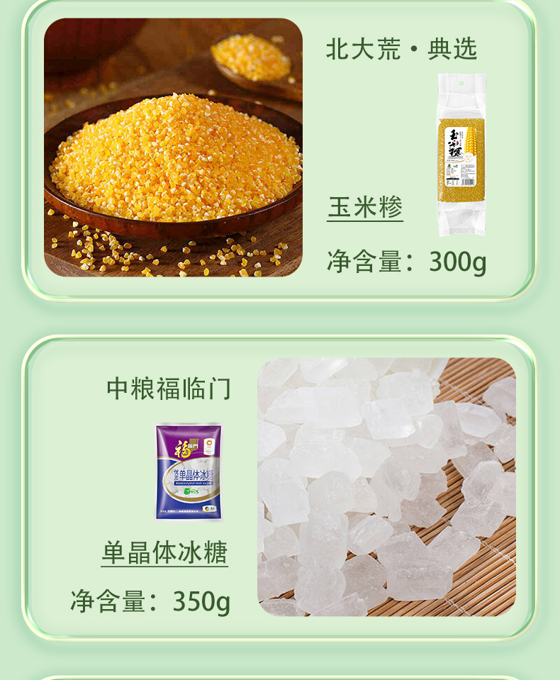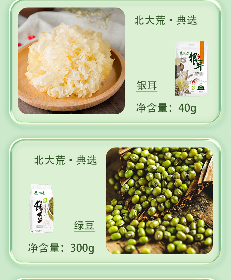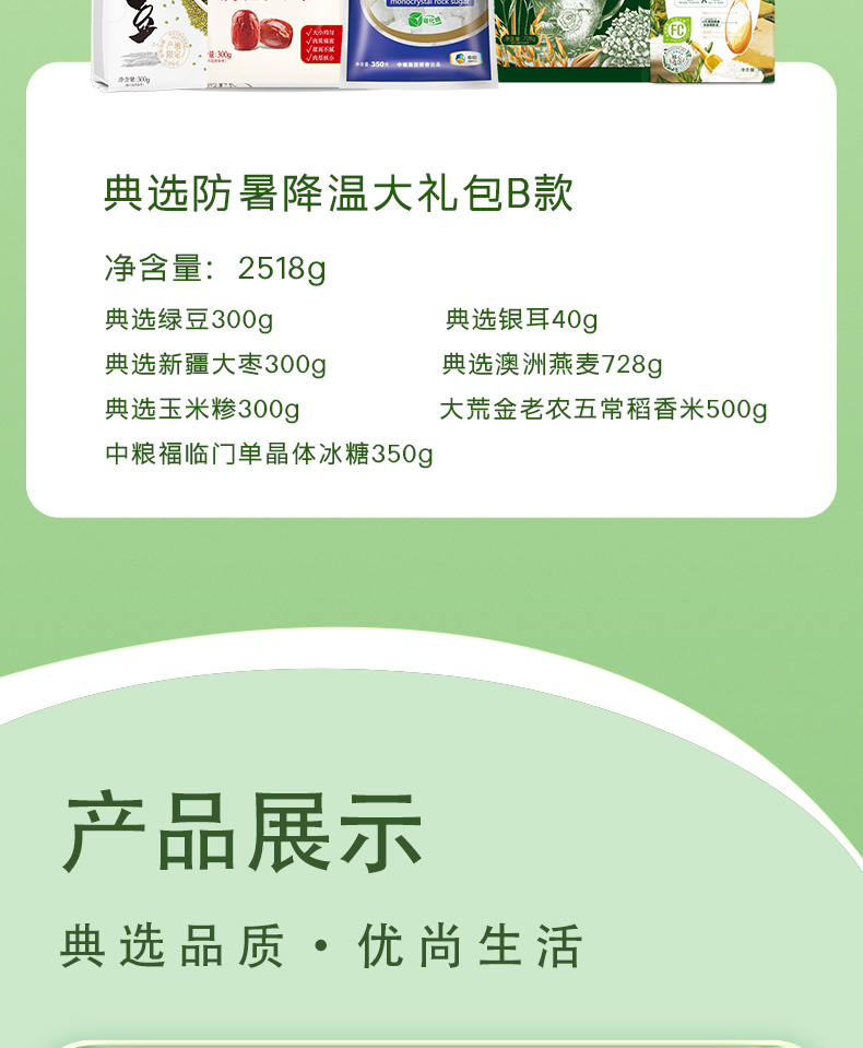 杞冠臻选|典选防暑降温大礼包B款 净含量:2518g 绿豆300g 、银耳40g、新疆大枣300g 、澳洲燕麦728g、玉米糁300g 、老农五常稻香米500g 、单晶体冰糖350g