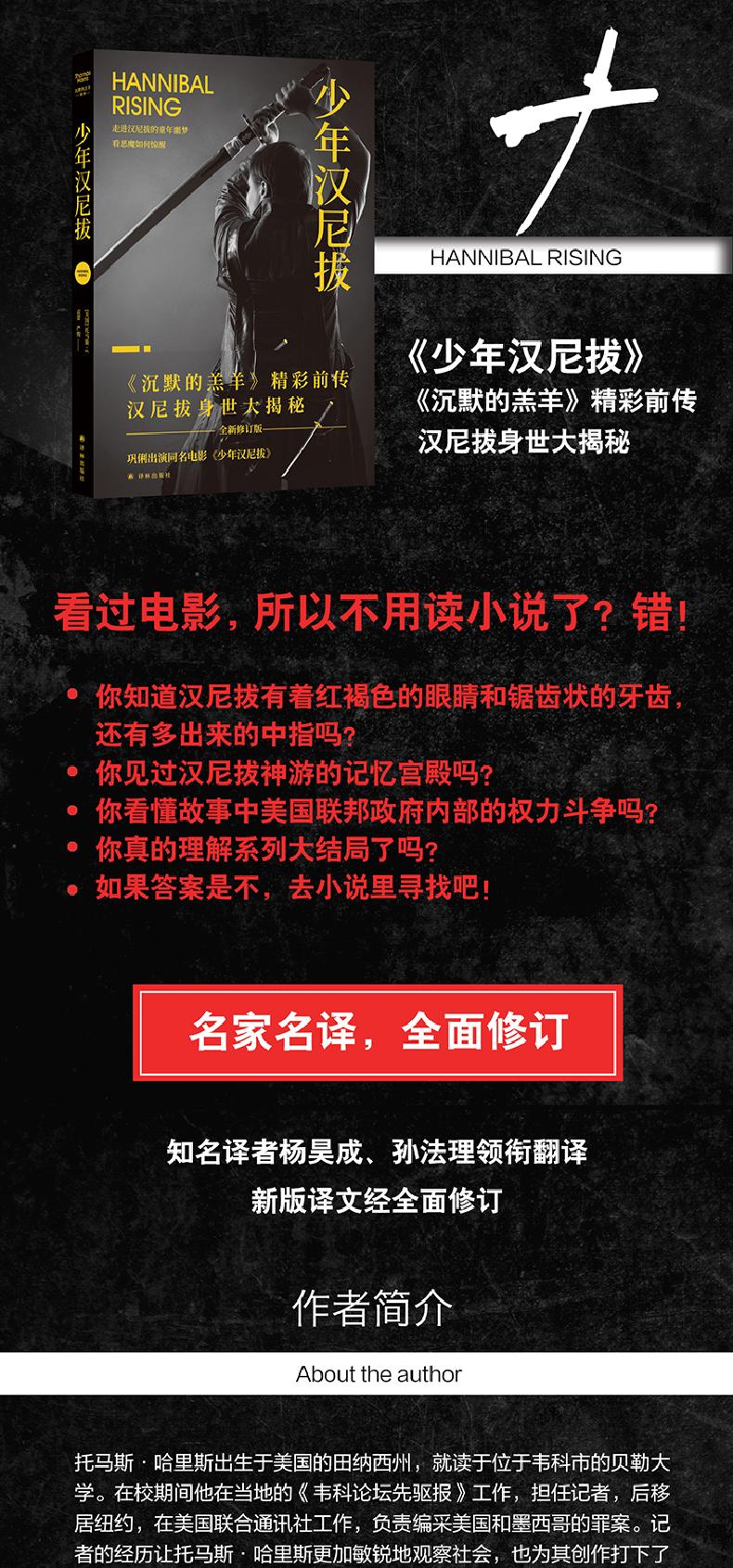 托马斯·哈里斯出生于美国的田纳西州,就读于位于韦科市的贝勒大学。在校期间他在当地的《韦科论坛先驱报》工作,担任记者,后移居纽约,在美国联合通讯社工作,负责编采美国和墨西哥的罪案。记者的经历让托马斯·哈里斯更加敏锐地观察社会,也为其创作打下了坚实的基础。1981年,沉默的羔羊系列处女作《红龙》出版, 1988年,延续《红龙》中的莱克特博士这一角色的系列第二部《沉默的羔羊》 出版,荣获《纽约时报》、《出版家周刊》排行榜的双料冠军,进榜达数十周之久,1989年获安东尼奖年度小说,1991年被改编为同名电影,一举荣获1992年第64届奥斯卡五项重量级大奖,成为奥斯卡历史上第三部囊括五项大奖的影片。1999年,该系列第三部小说《汉尼拔》终于面世,轰动全球,2001年,《汉尼拔》电影上映,成为2001年票房*早破亿的电影。2006年,食人魔前传《少年汉尼拔》出版,也象征着该系列的完结。