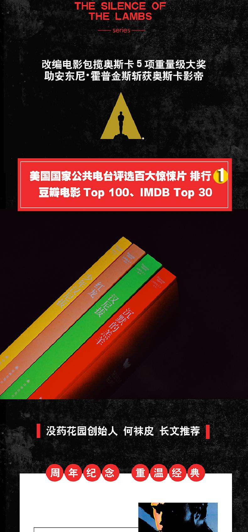 2021年正值沉默的羔羊系列小说诞生40周年,《沉默的羔羊》电影上映30周年,《汉尼拔》电影上映20周年。沉默的羔羊系列时隔8年再度面世,没药花园创始人何袜皮长文荐