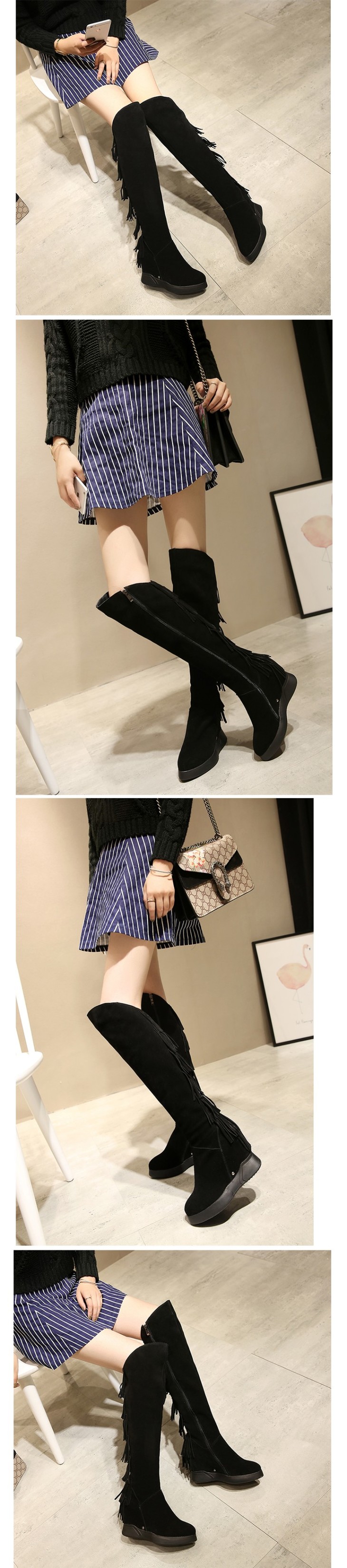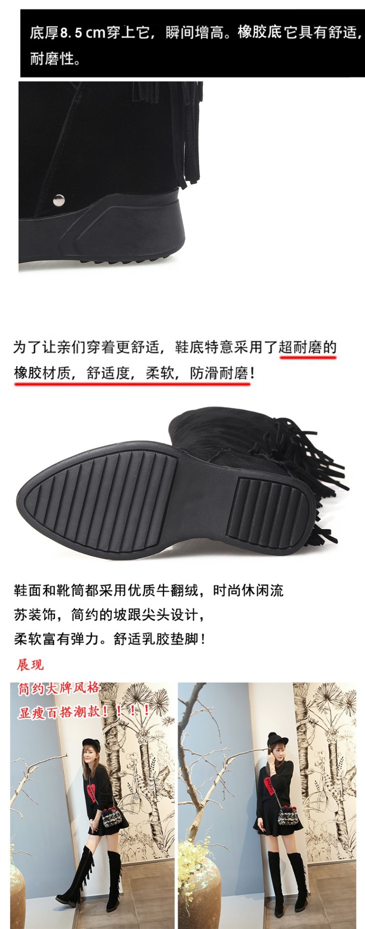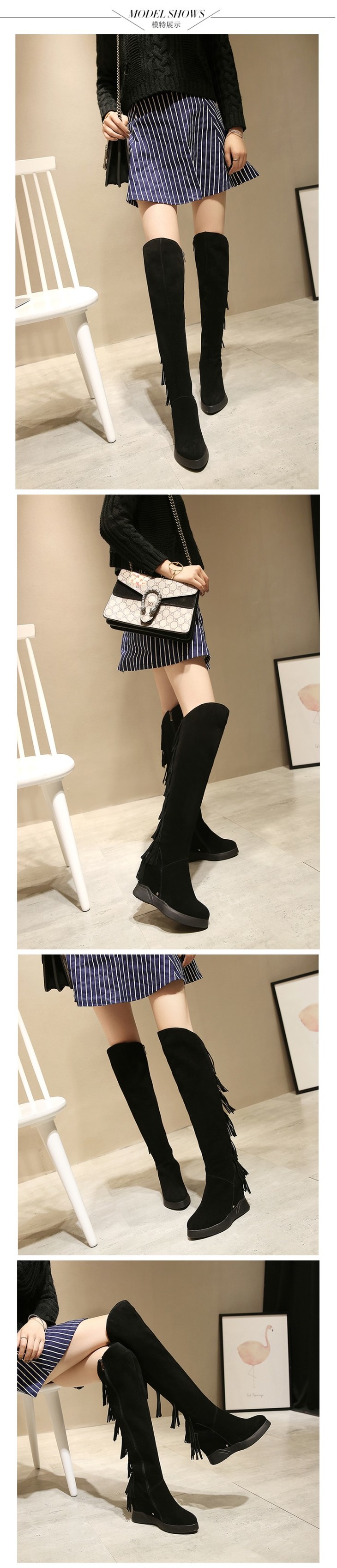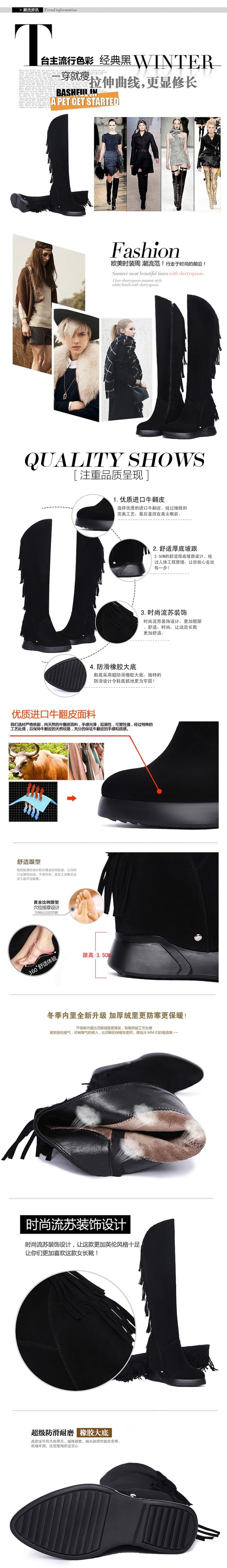 上海旗袍厂DTN-09-10 秋冬新款磨砂真皮圆头坡跟流苏靴侧拉链纯色百搭时尚休闲高筒靴