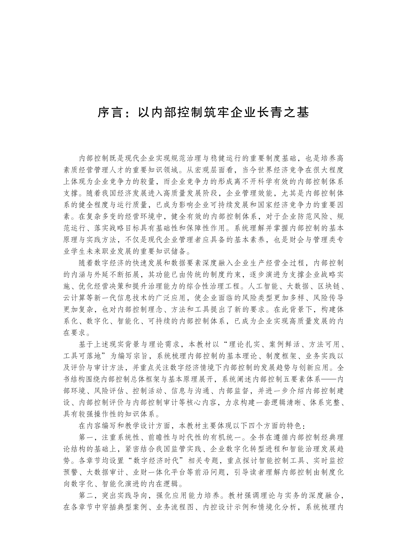 第一,注重系统性、前瞻性与时代性的有机统一。全书在遵循内部控制经典理论结构的基础上,紧密结合我国监管实践、企业数字化转型进程和智能治理发展趋势。各章节均设置“数字经济时代”相关专题,重点探讨智能控制工具、实时监控预警、大数据审计、业财一体化平台等前沿问题,引导读者理解内部控制由制度化向数字化、智能化演进的内在逻辑。