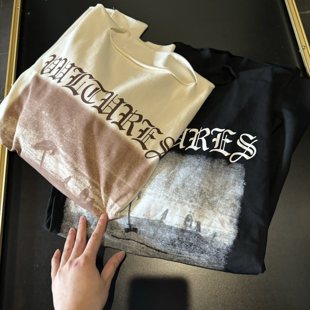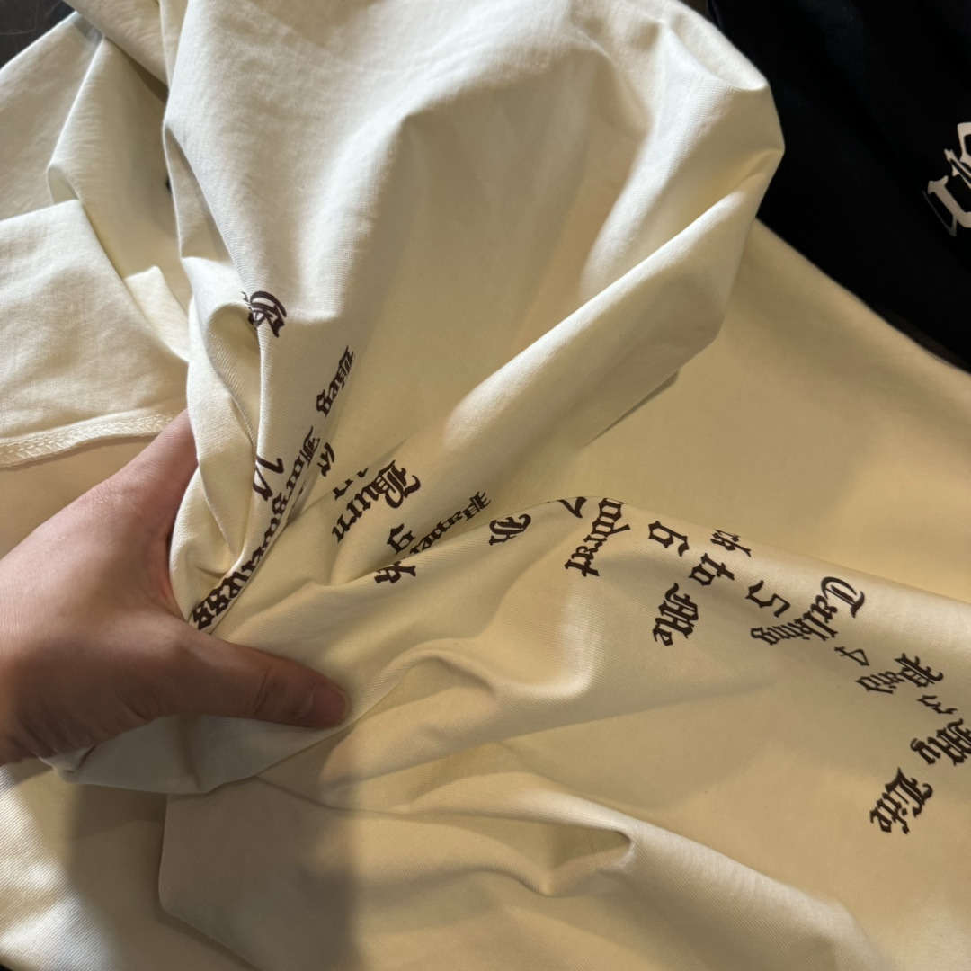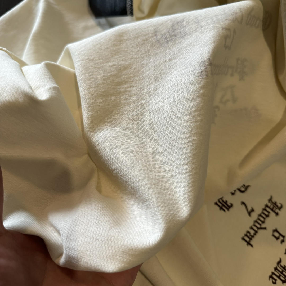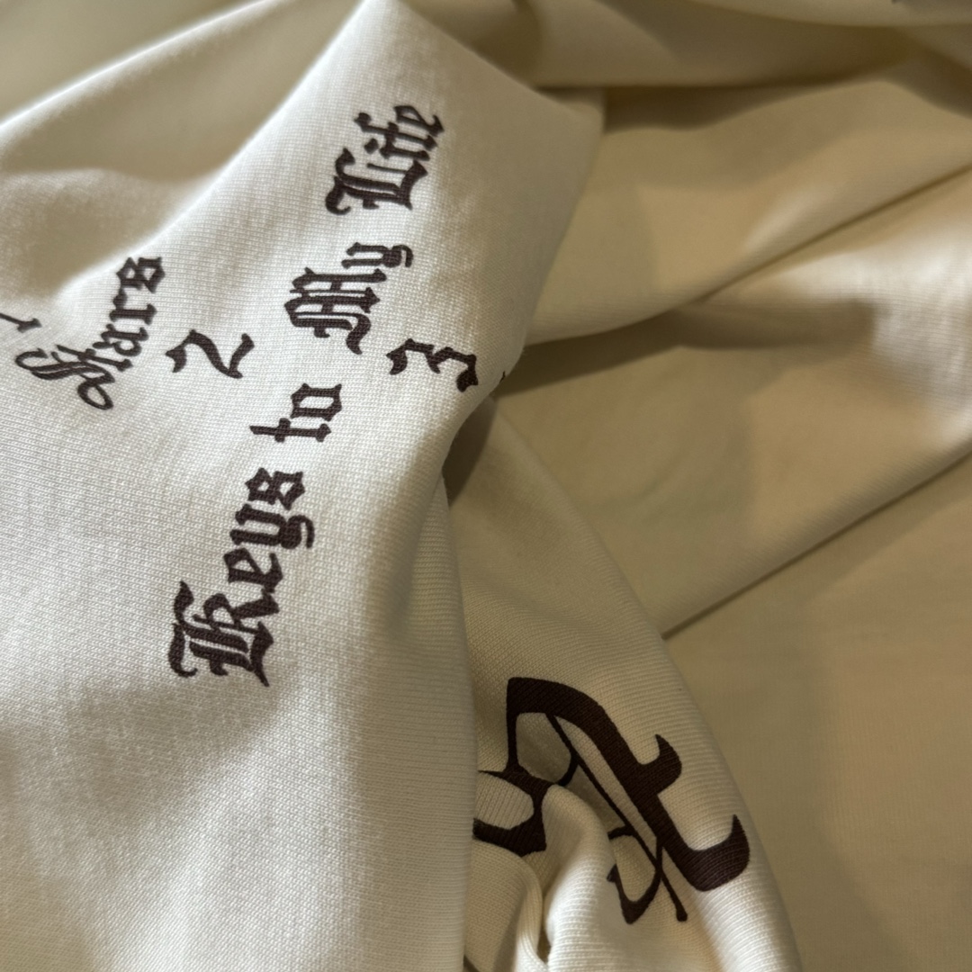 这一系列采用的面料 非常重磅 整体厚重 拿到手就是沉甸甸的感觉 毕竟搭上了这样的奢侈品牌后 伴随着售价的提升 做工与用料自然也下足功夫 按足原版定制重磅280g 纯棉面料 整件衣服非常厚重 与其说他是短袖t恤 不如直接当成套头卫衣看待